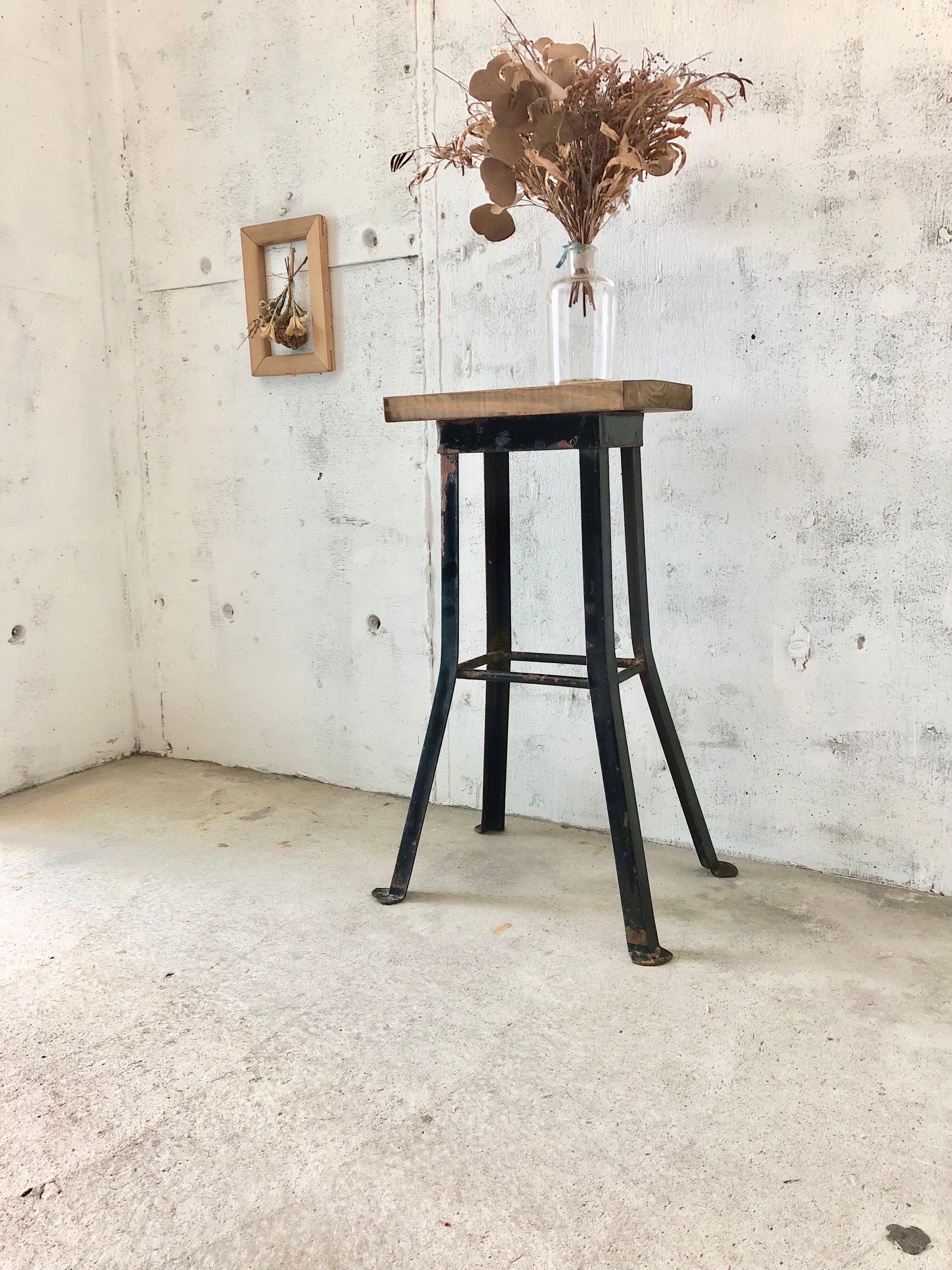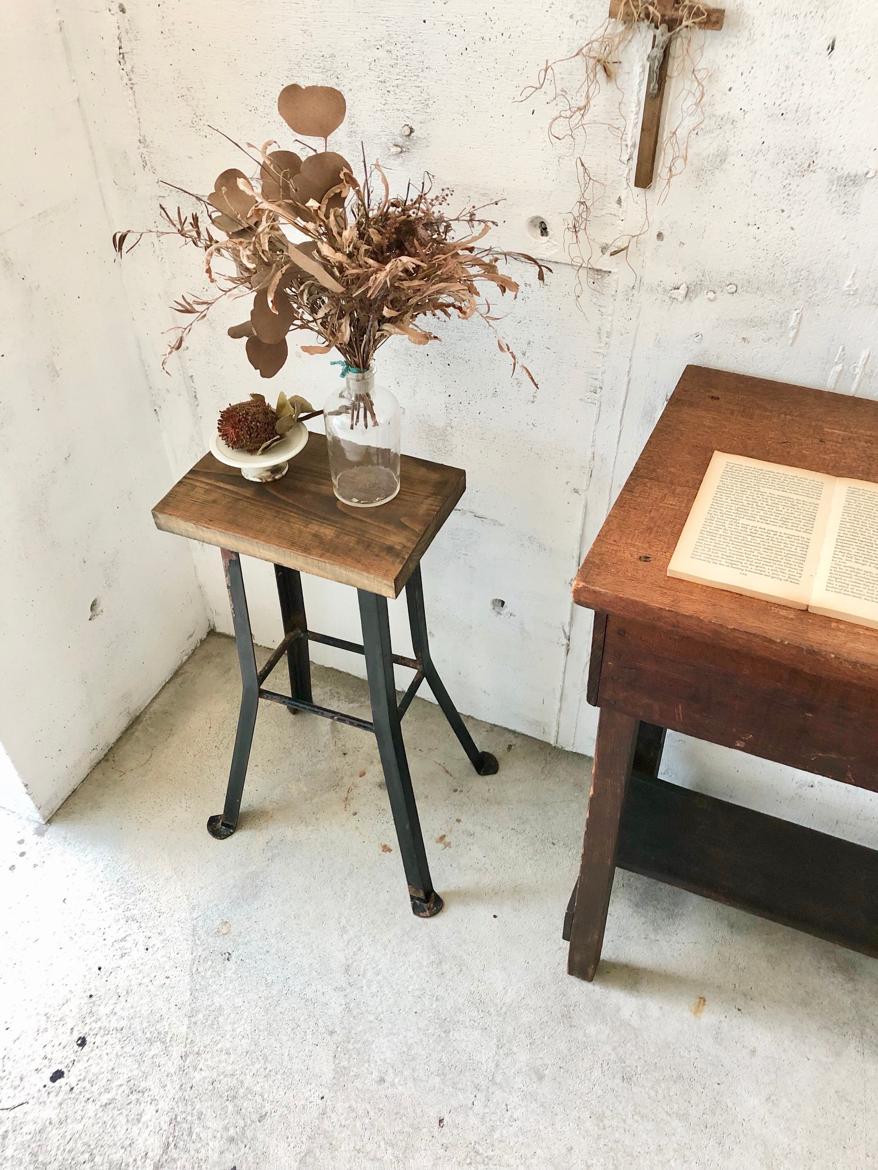 雰囲気の良い古材板と古いアイアン脚が良く馴染んだ飾り台。少しのがたつきはありますが、状態は良いです。お部屋、庭先などでお気に入りの植物や小物などをディスプレイする飾り台としても感じ良いです。しっかりとしているので、実用使いでスツールとしてもお楽しみ頂けそうです。