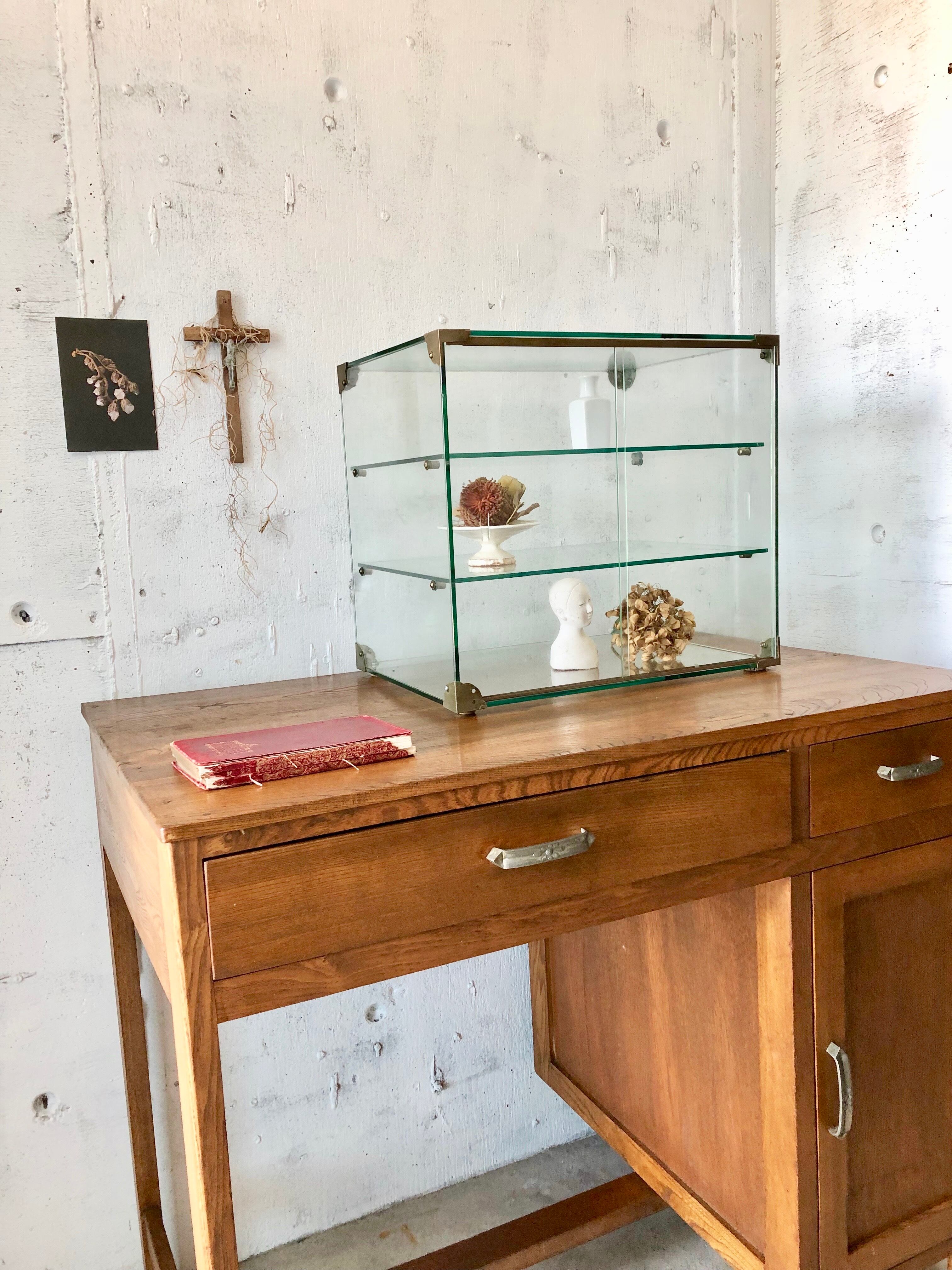 雰囲気の良いガラスが綺麗なショーケース。特に気になる割れなどはなく、状態は良いです。お部屋の卓上やカウンター上などで、お気に入りの小物やアクセサリー、ドライフラワーを飾ってみても素敵です。ショップさんの店舗什器としてもオススメの品です。