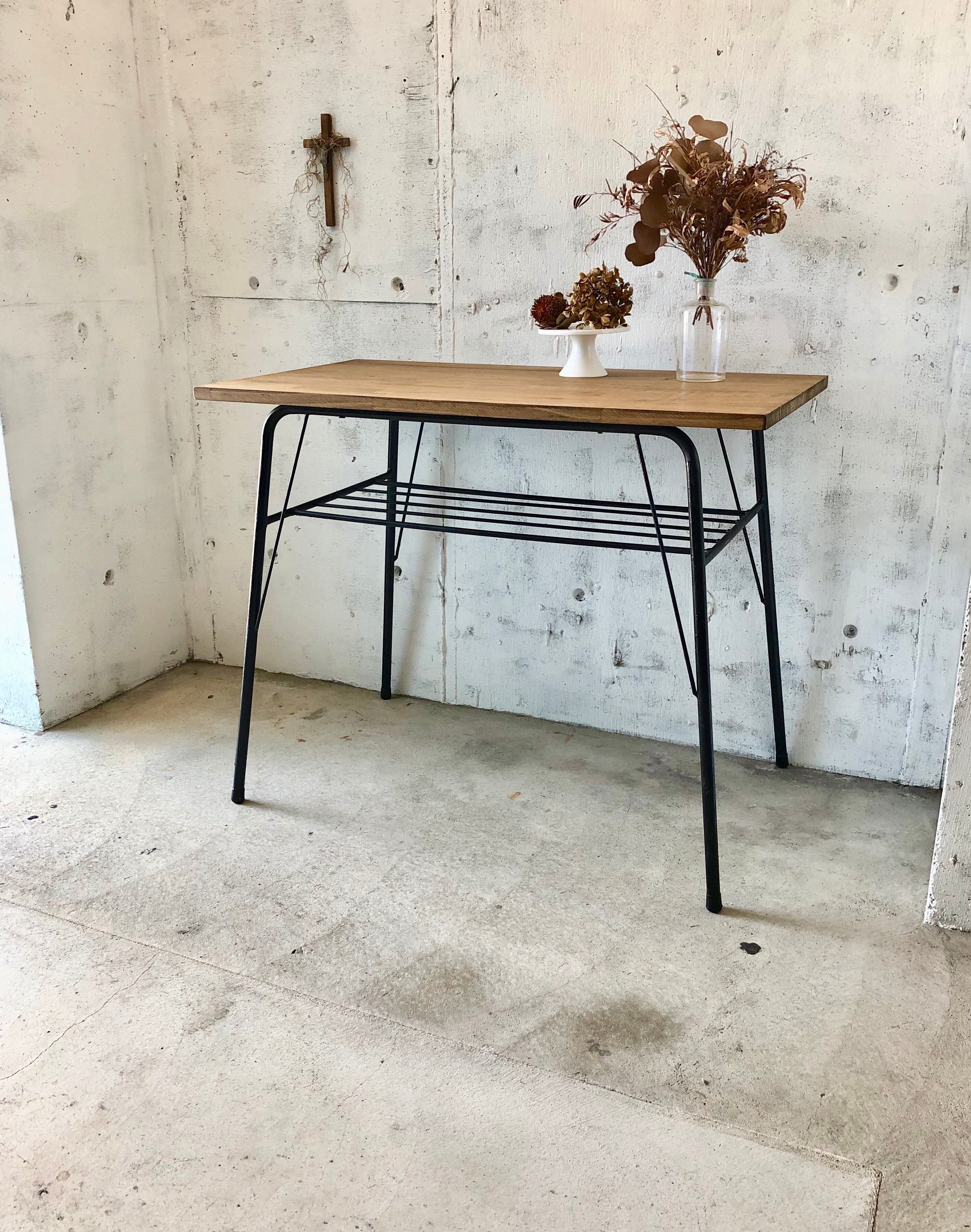 雰囲気の良い木板と古い鉄脚が良く馴染んだ鉄脚テーブル。天板下のオープンラックも雑誌などが置けるので便利です。お気に入りの小物や植物を飾る台としてや、日常の作業をするのに程よいサイズ感がオススメです。味のあるテーブルひとつプラスするだけで雰囲気あるお部屋作りが叶いそうです。