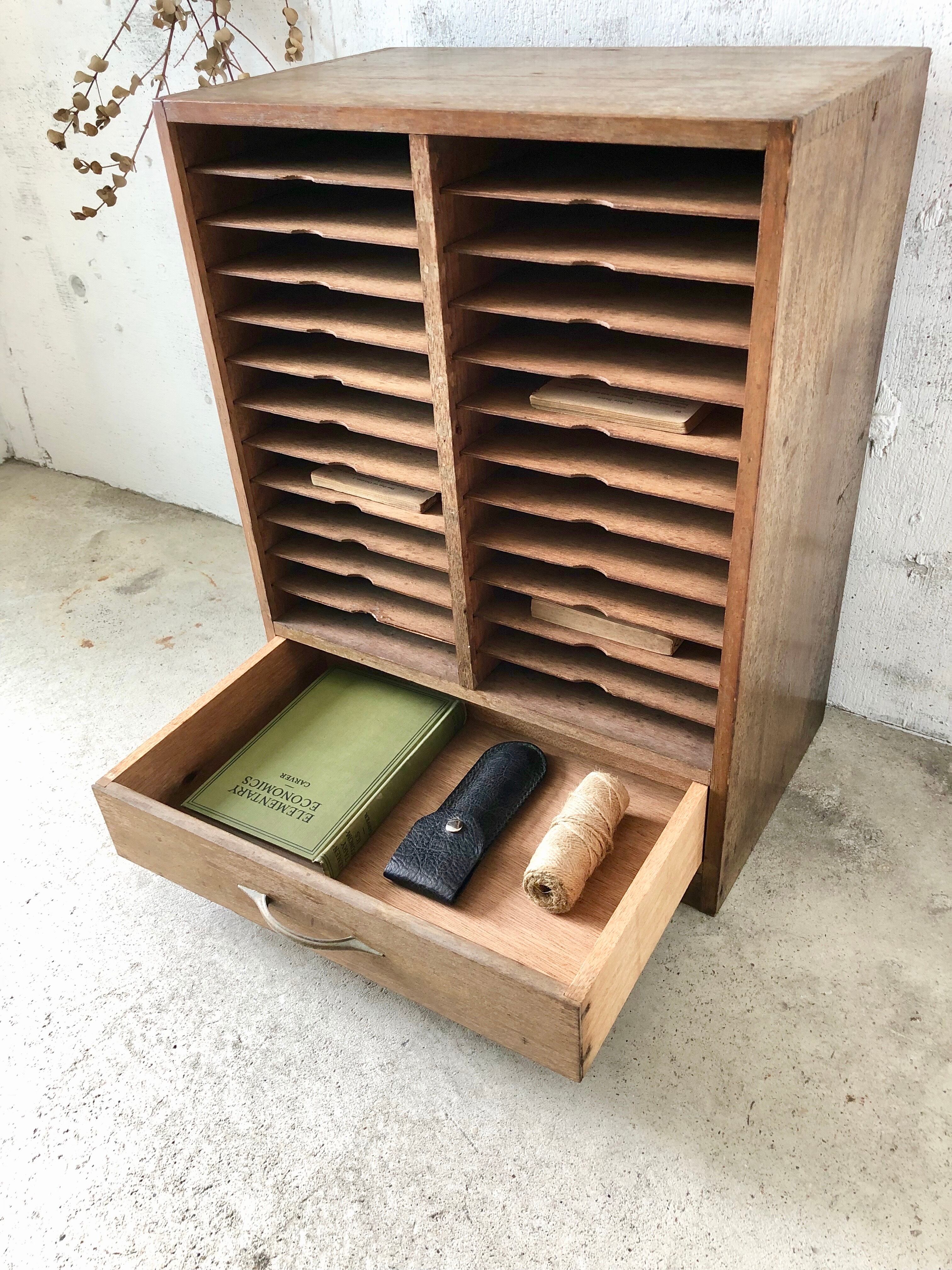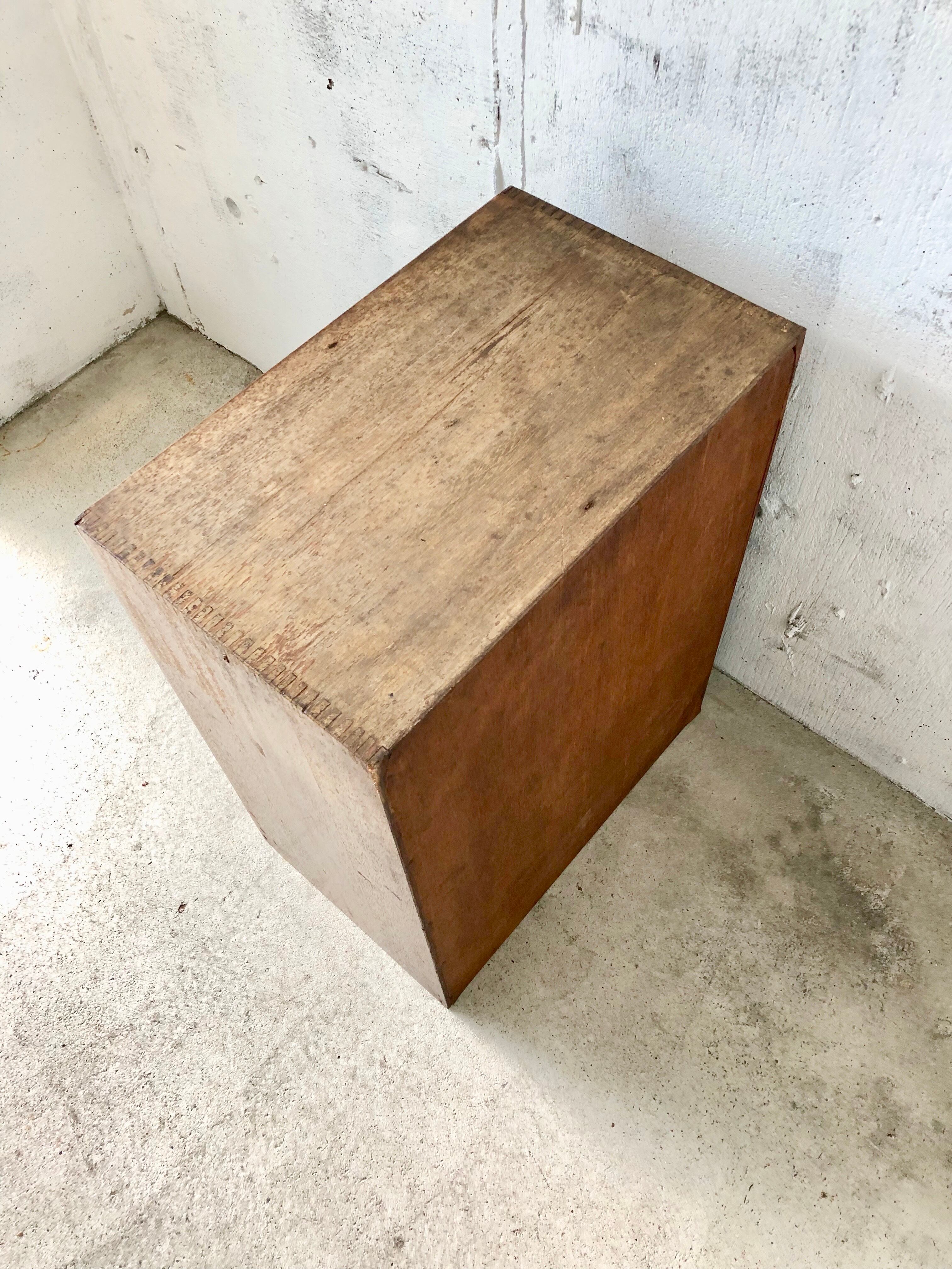 経年変化の雰囲気良い木肌、味のある取手が感じ良いカルテケース。特に目立つがたつきもなく、状態は良いです。作業スペースで書類の整理や、はがきや切手などの紙物の収納にもスッキリと活躍してくれそうです。