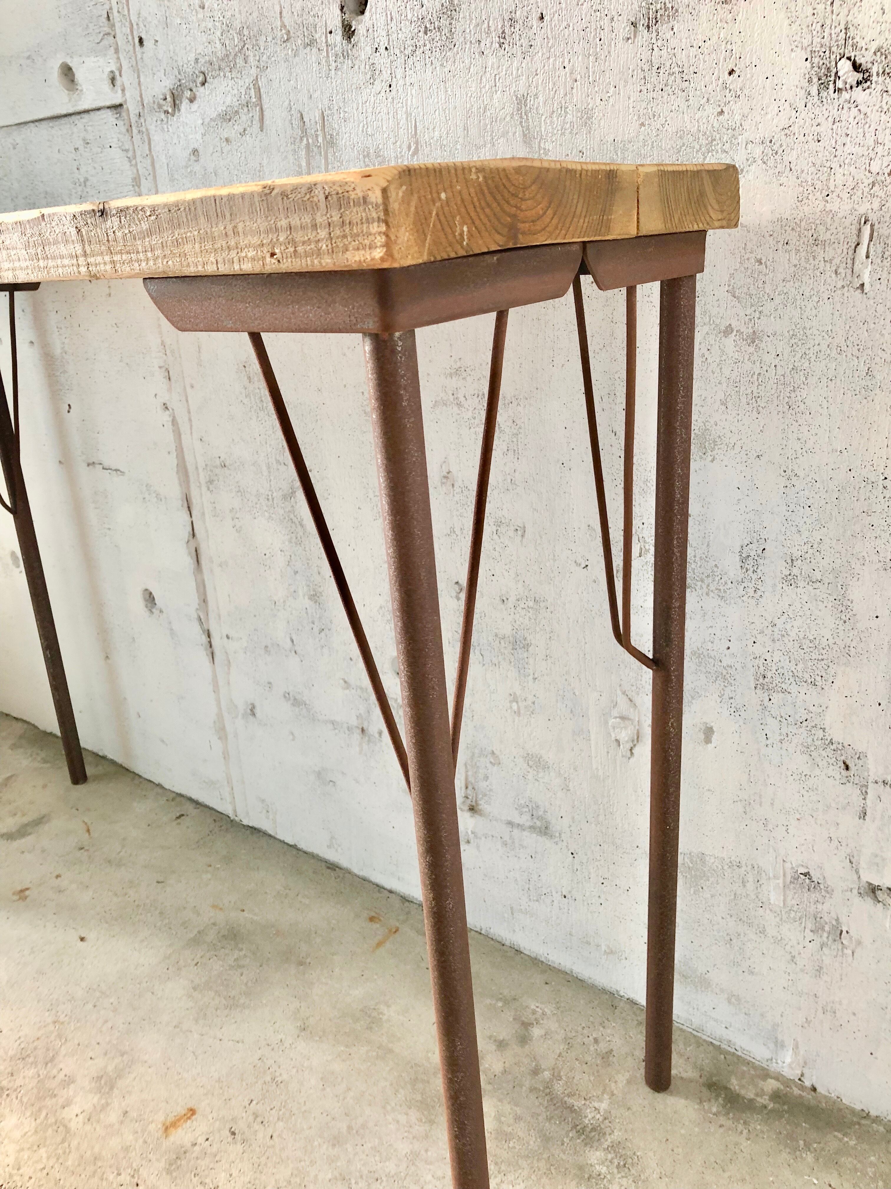 古い鉄脚と古材板のテーブルになります。スレや剥げ、反り、割れ、サビ、当たりキズ、落としきれない汚れなどがあります。古い鉄脚になりますので少しのがたつきはありますが、しっかりとしていて強度上問題なくお使いいただけます。全体的に状態も良く、まだまだ実用的に活躍してくれます。
