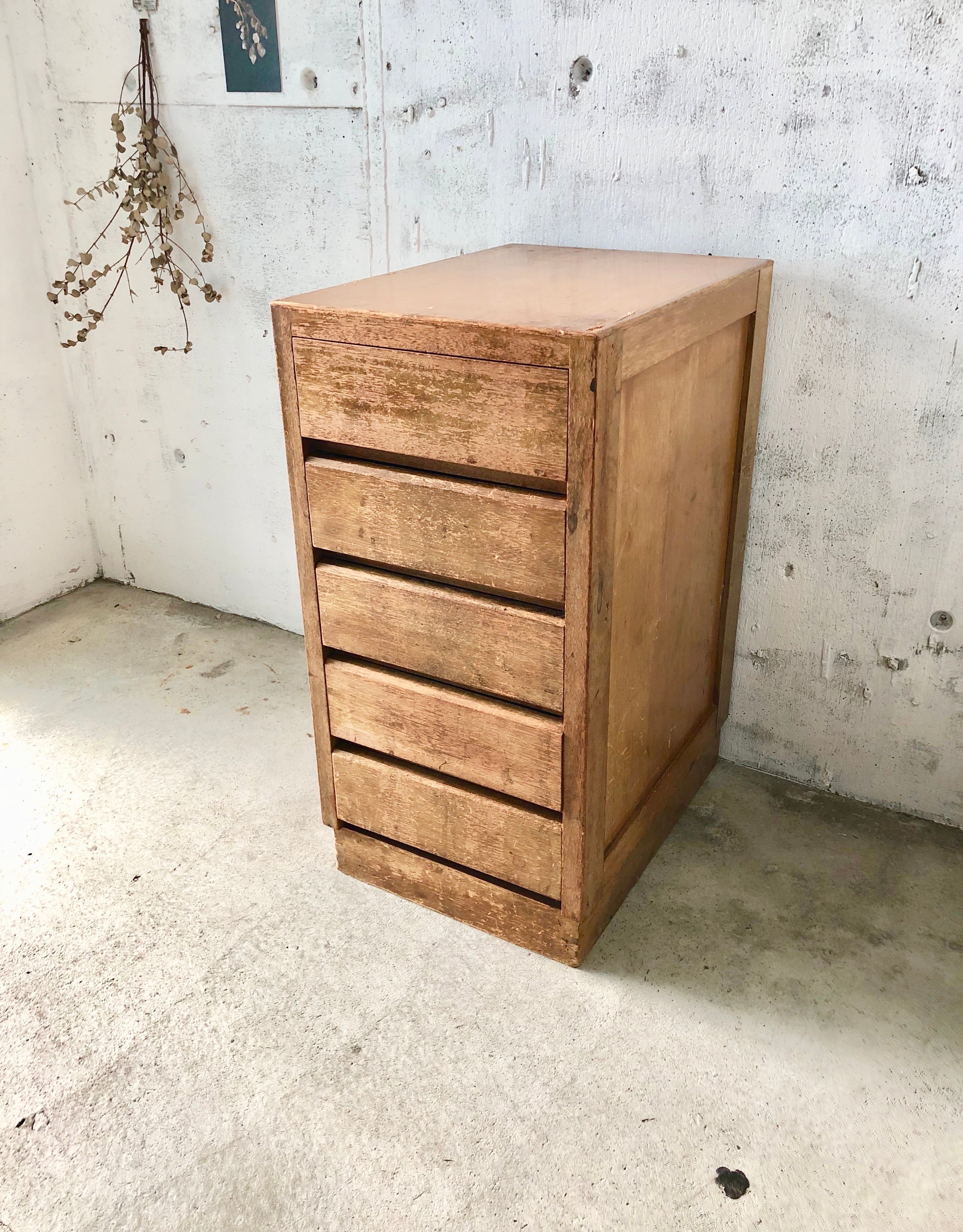 経年変化のナチュラルな木肌が感じ良い収納棚。引出し中はAサイズが持って入る大きさで、開閉も比較的スムーズに行えます。寝室のサイドテーブルとしてや、脱衣所でタオルなどを入れる棚、テーブル脇に置いて紙物、書類、細々したものの収納棚として使ってみても良さそうです。