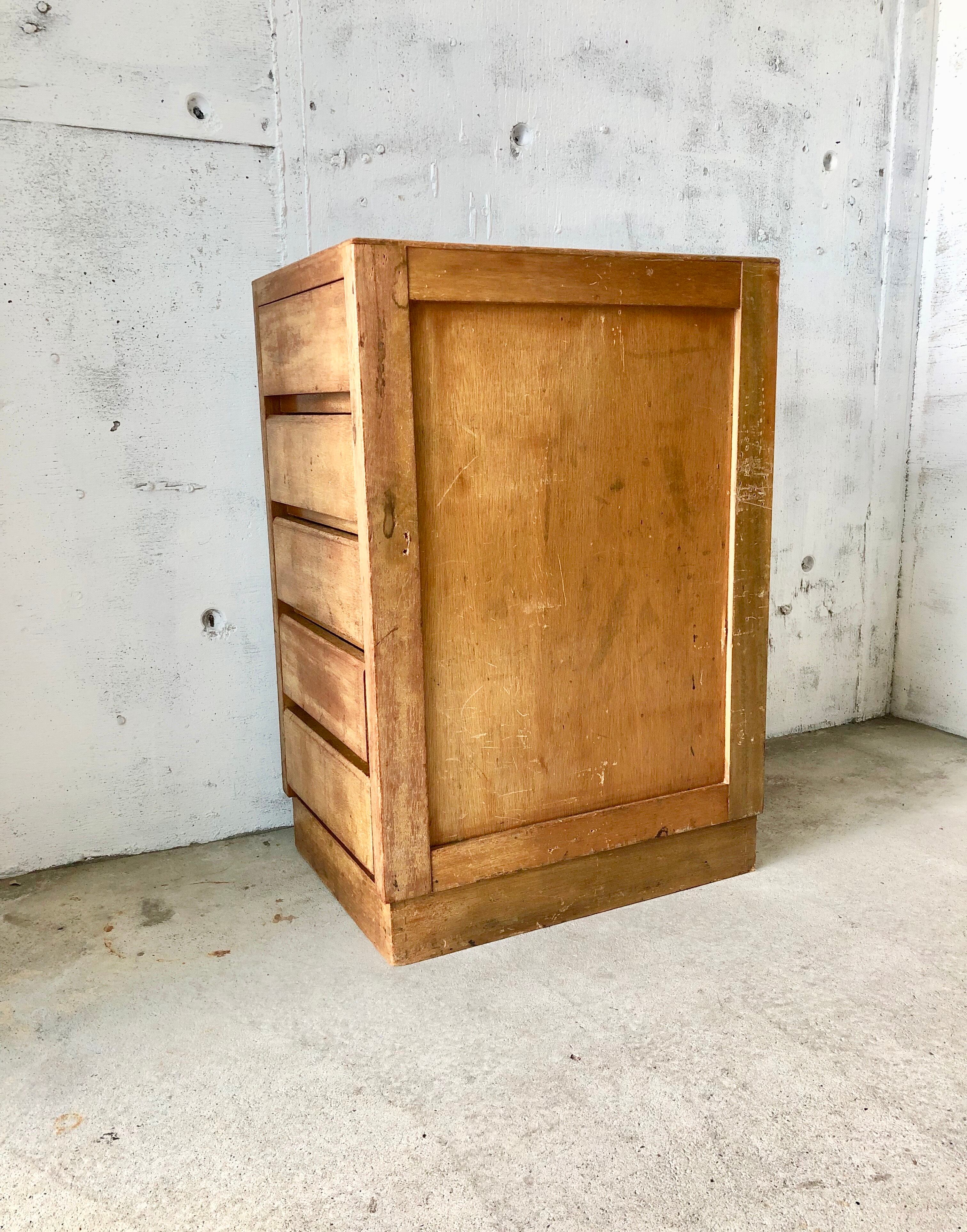 古い収納棚になりますので、スレや剥げ、当たりキズ、割れ、欠け、落としきれない汚れなどがあります。特に目立つがたつきはありません。引出し中は綺麗で開閉も比較的スムーズに行え、A4サイズが入る大きさです。全体的に状態も良いのでまだまだ実用的に活躍してくれます。