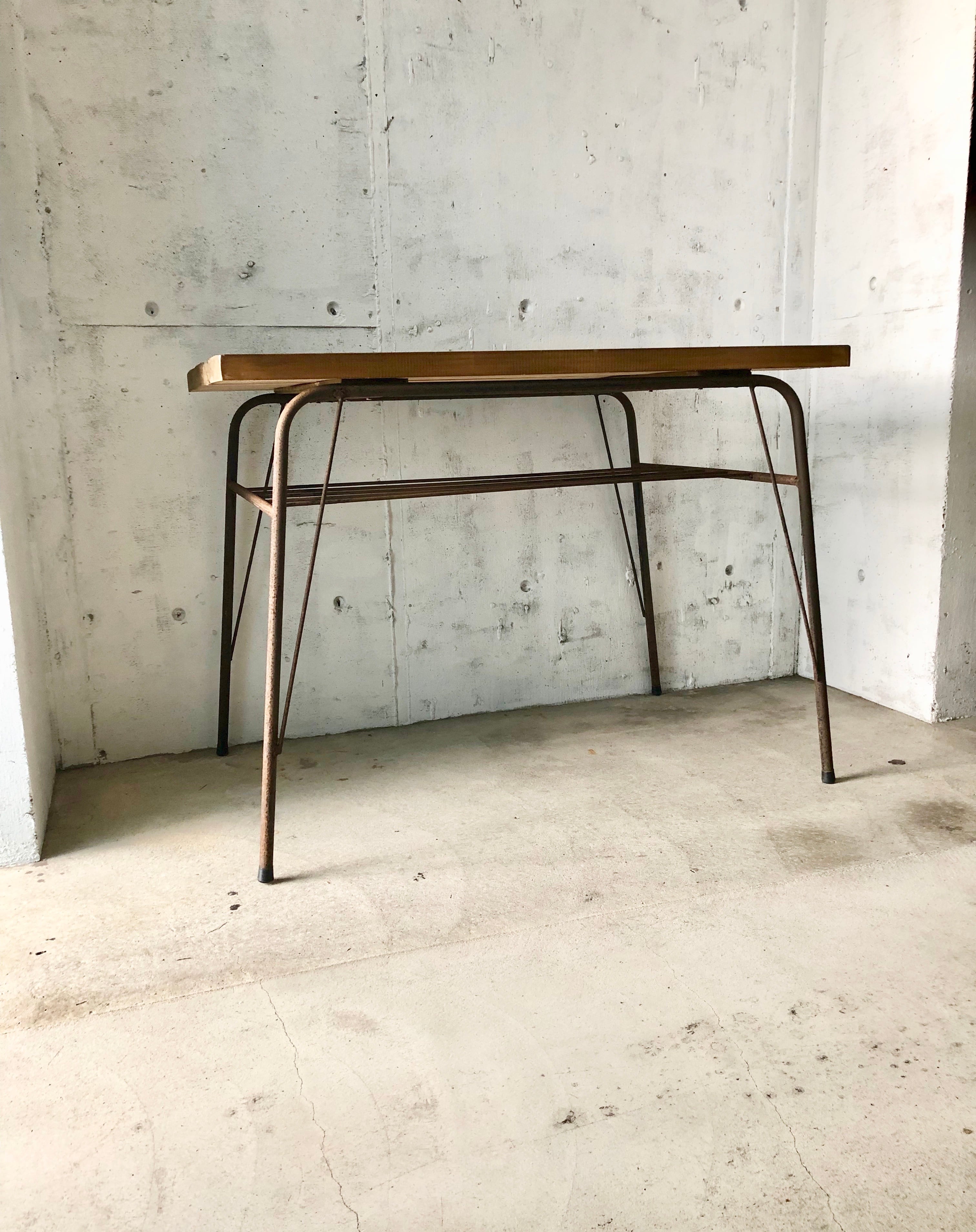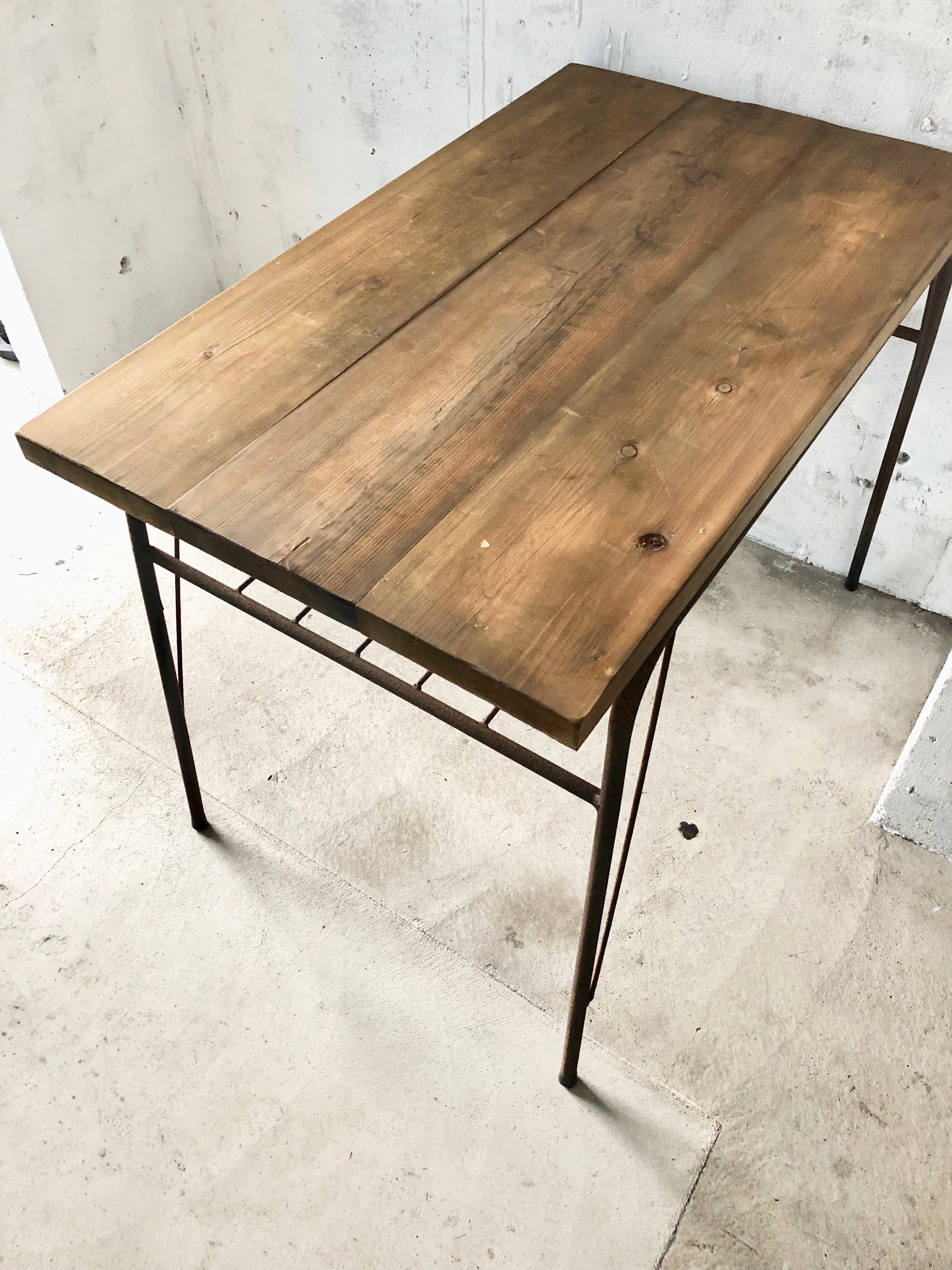古い鉄脚と古材板のテーブルになります。スレや剥げ、反り、割れ、サビ、隙間、当たりキズ、落としきれない汚れなどがあります。古い鉄脚になりますので少しのがたつきはありますが、しっかりとしていて強度上問題なくお使いいただけます。全体的に状態も良く、まだまだ実用的に活躍してくれます。