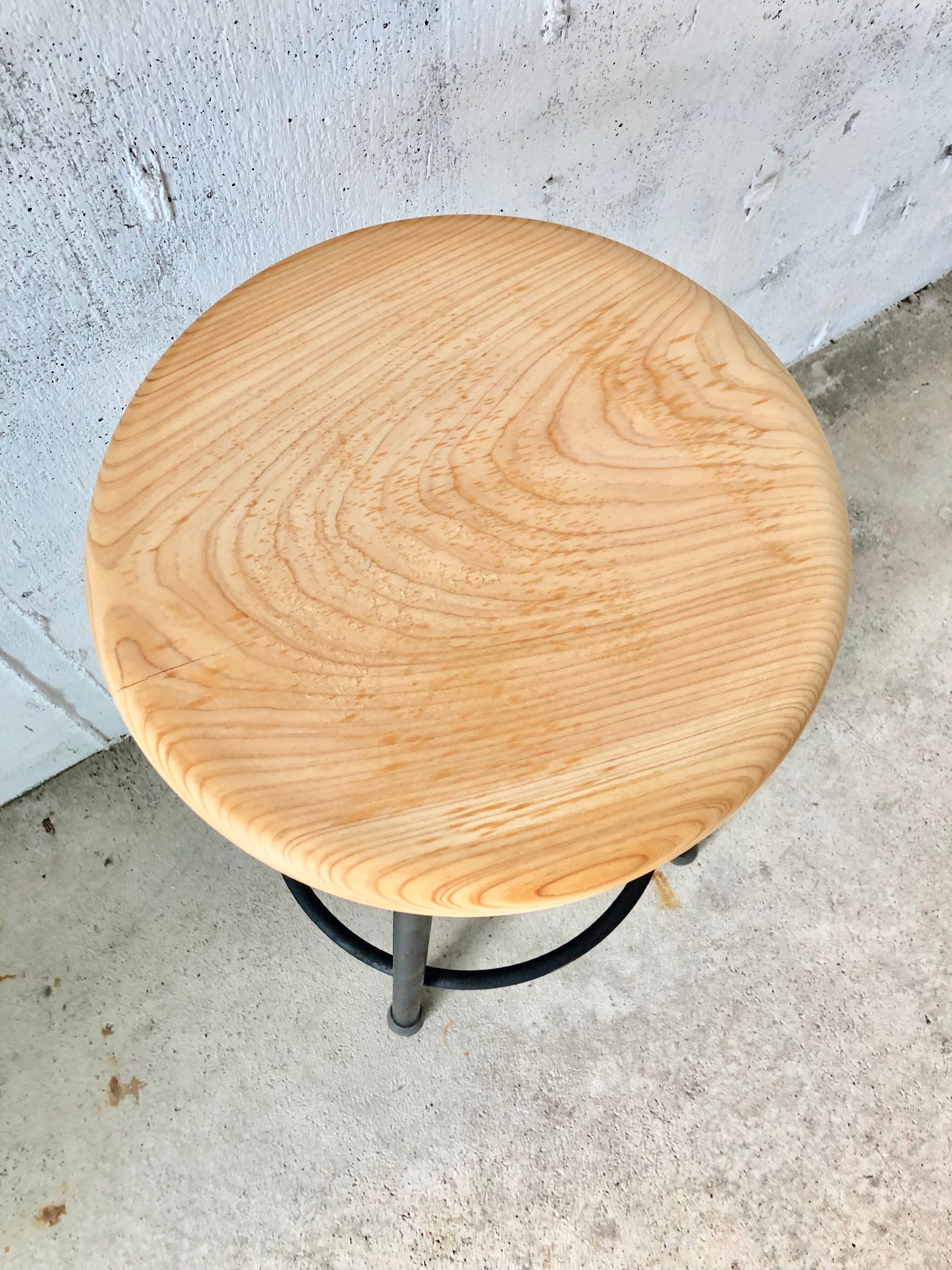 古いスツールになります。スレや剥げ、割れ、欠け、反り、サビ、当たりキズ、落としきれない汚れなどがあります。少しのがたつきはありますが、全体的に状態も良いのでまだまだ実用的に活躍してくれます。