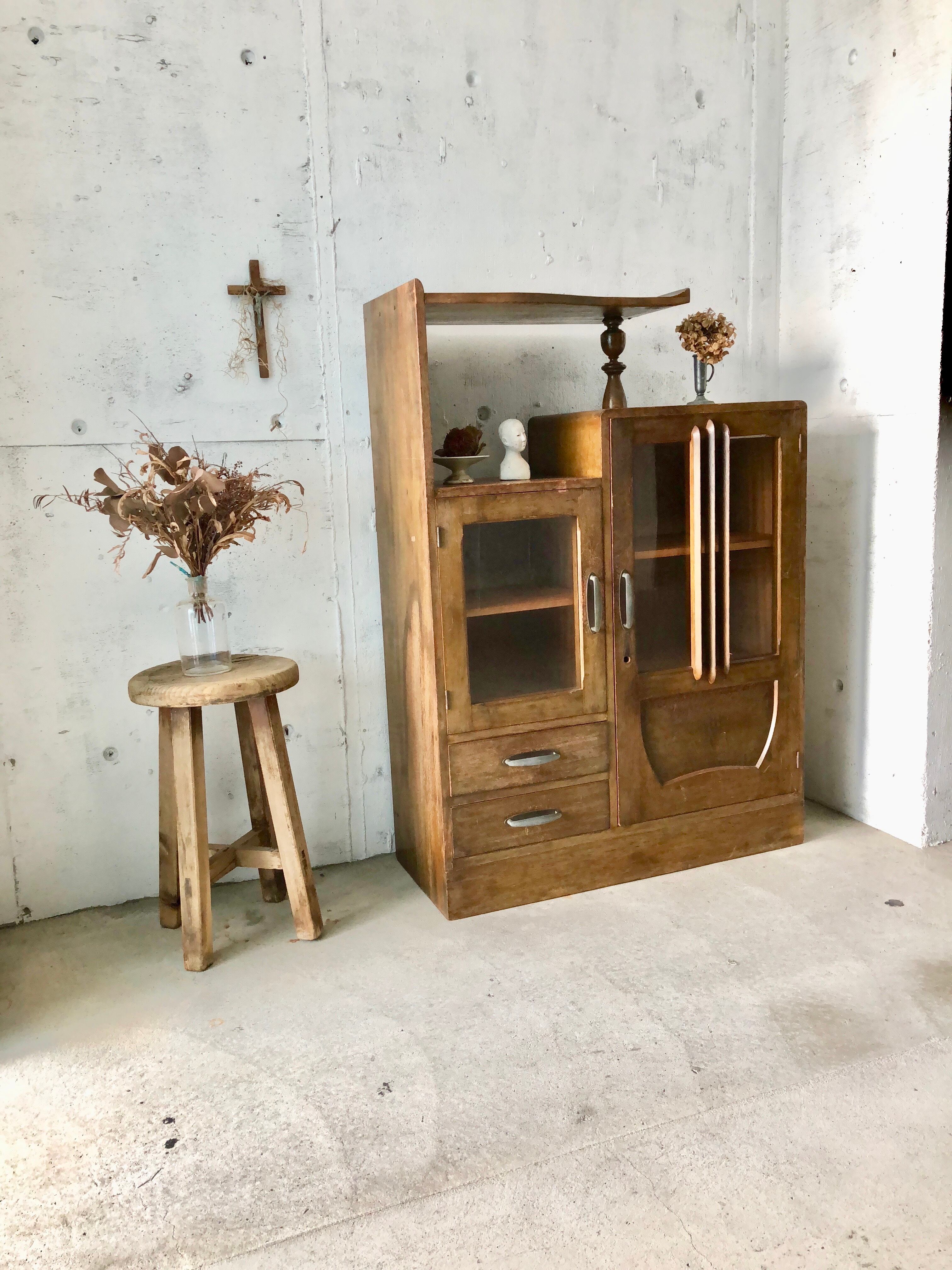 古い収納棚になります。スレや欠け、サビ、当たりキズ、背板の割れ、浮き、落としきれない汚れなどがあります。扉のガラスは特に割れもなく、開閉も比較的スムーズに行え、使用上問題なくお使いいただけます。収納中の板は全て取り外し出来ます。全体的に状態も良いのでまだまだ実用的に活躍してくれます。