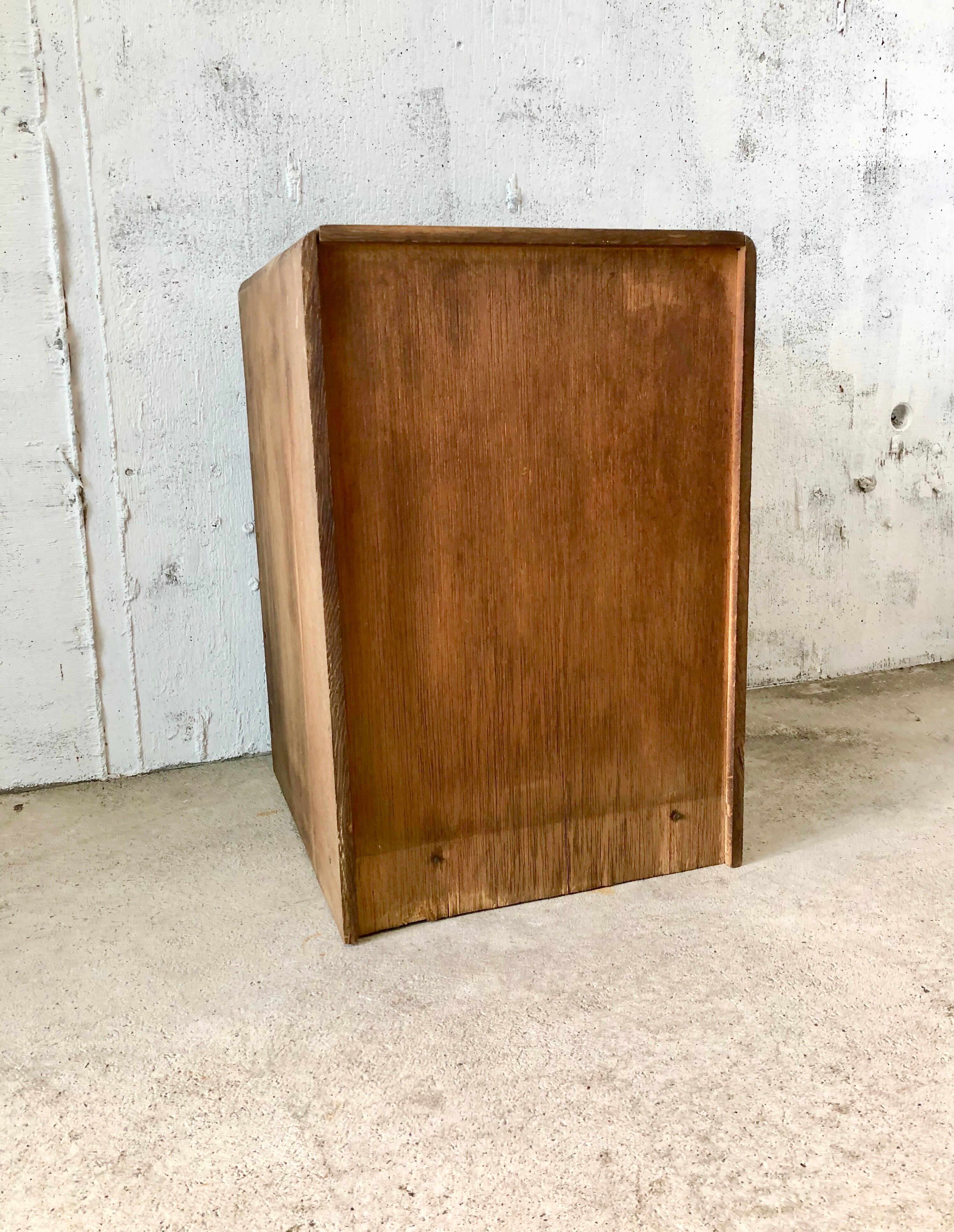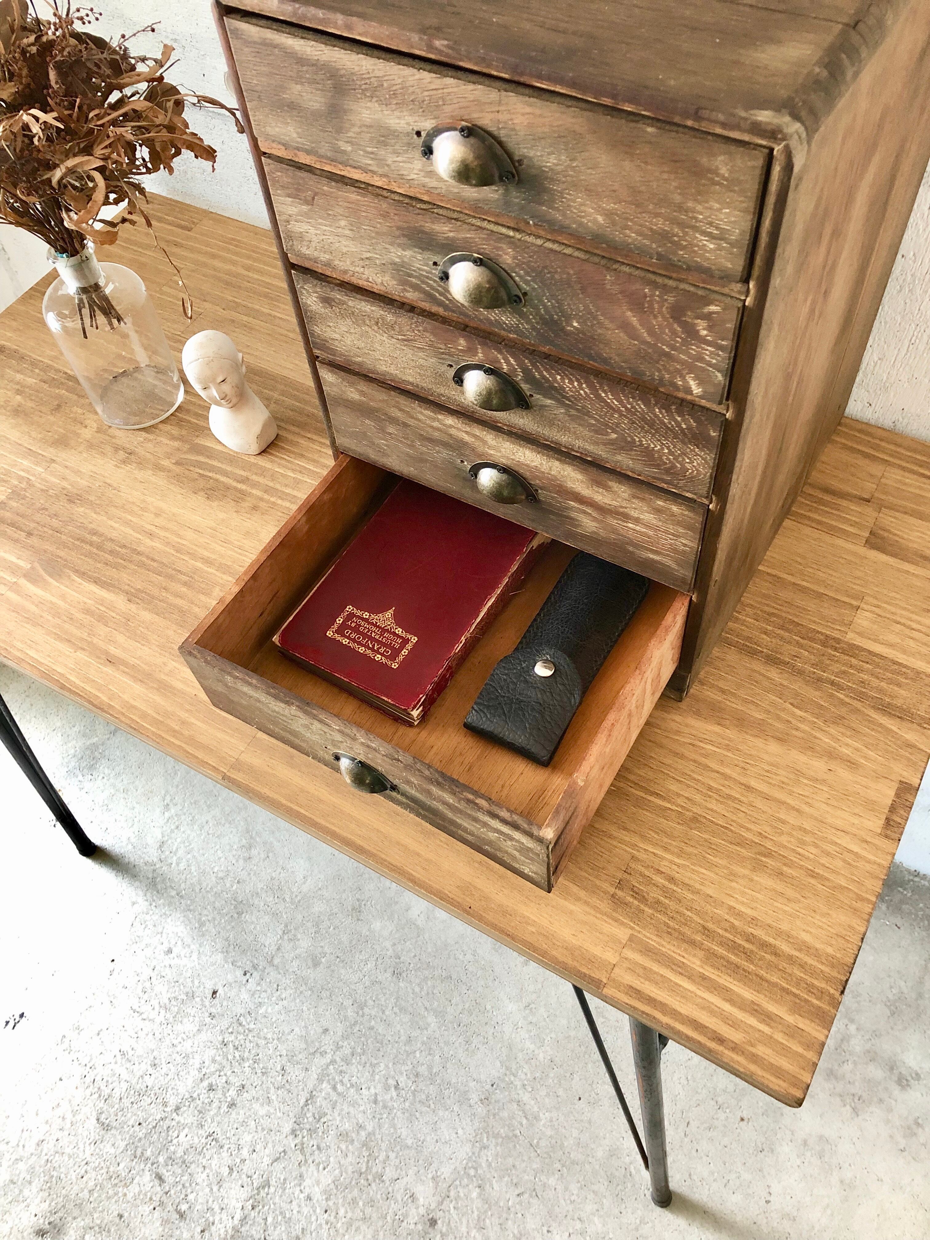 経年変化の良い木肌、真鍮取手が雰囲気の良い小引き出し。引出し中は少し汚れがありますが、開閉はスムーズに行え日常気軽にお使いいただけます。お部屋のカウンター上やリビング、作業場などで細々したものやステーショナリーの整理に役立ちそうです。