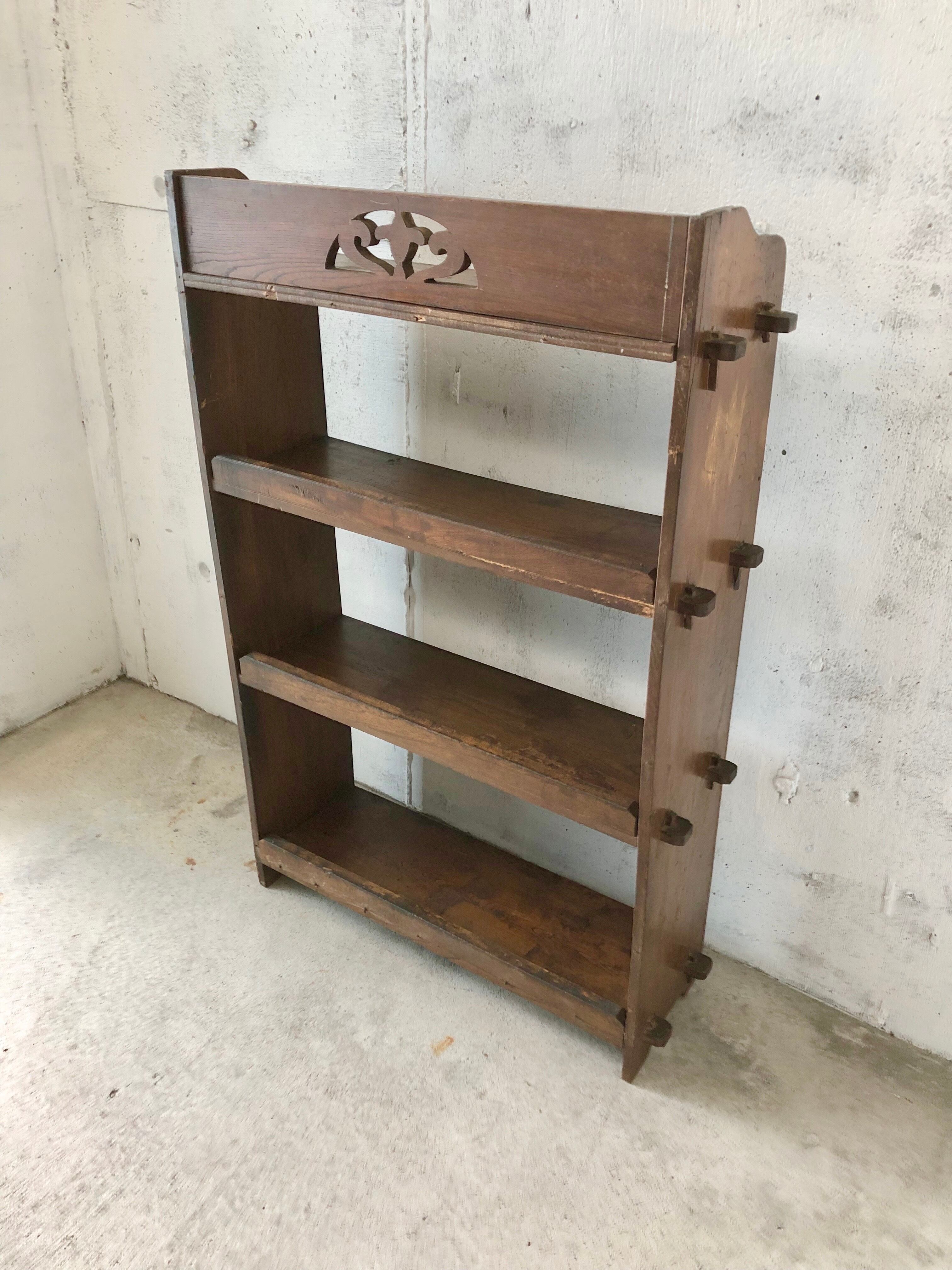 古い木製のくさび棚になります.。スレやハゲ、割れ、欠け、隙間、反り、当たりキズ、落としきれない汚れなどがあります。少しのぐらつきはありますが、全体的に状態も良いのでまだまだ実用的に活躍してくれます。