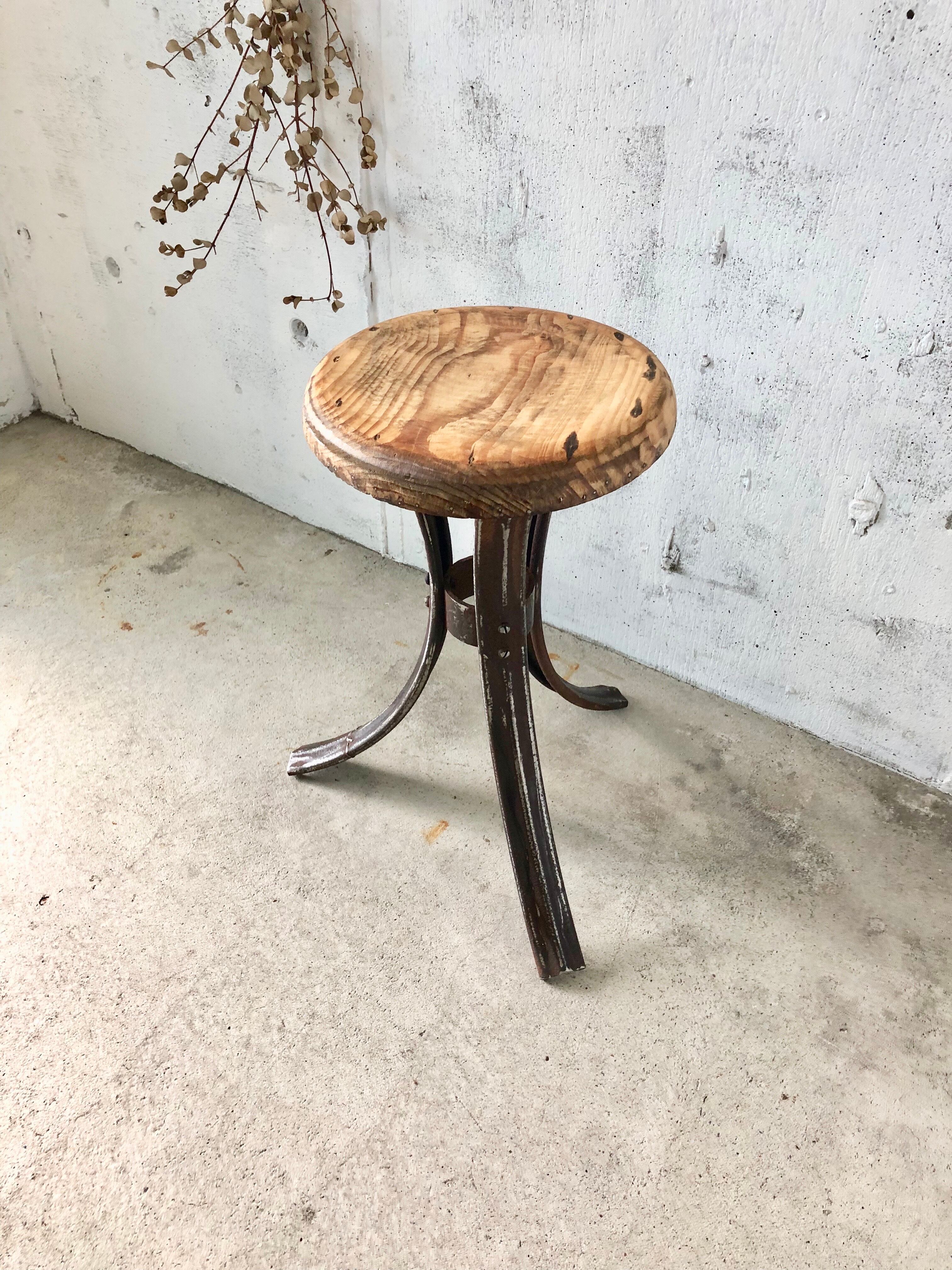 雰囲気の良い古材と鉄脚が感じ良いスツール。。デザイン性のある鉄脚も魅力的な佇まいです。少しのがたつきはありますが、状態は良いです。実用使いでテーブルの椅子、キッチンや玄関先の腰掛け椅子としてや、植物を飾るディスプレイ台としても感じ良さそうです。