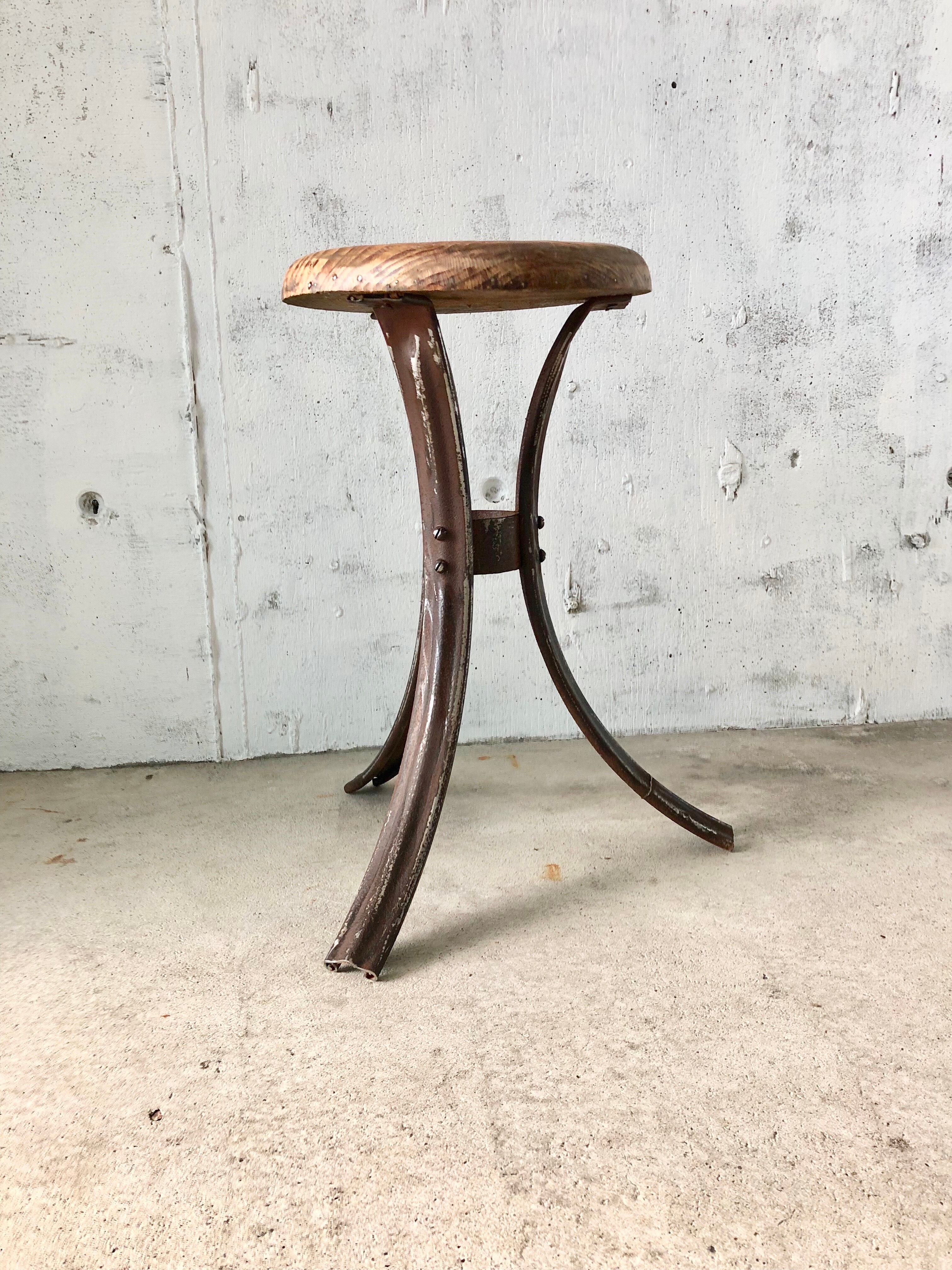 古いスツールになります。スレや剥げ、割れ、欠け、反り、サビ、当たりキズ、落としきれない汚れなどがあります。少しのがたつきはありますが、全体的に状態も良いのでまだまだ実用的に活躍してくれます。