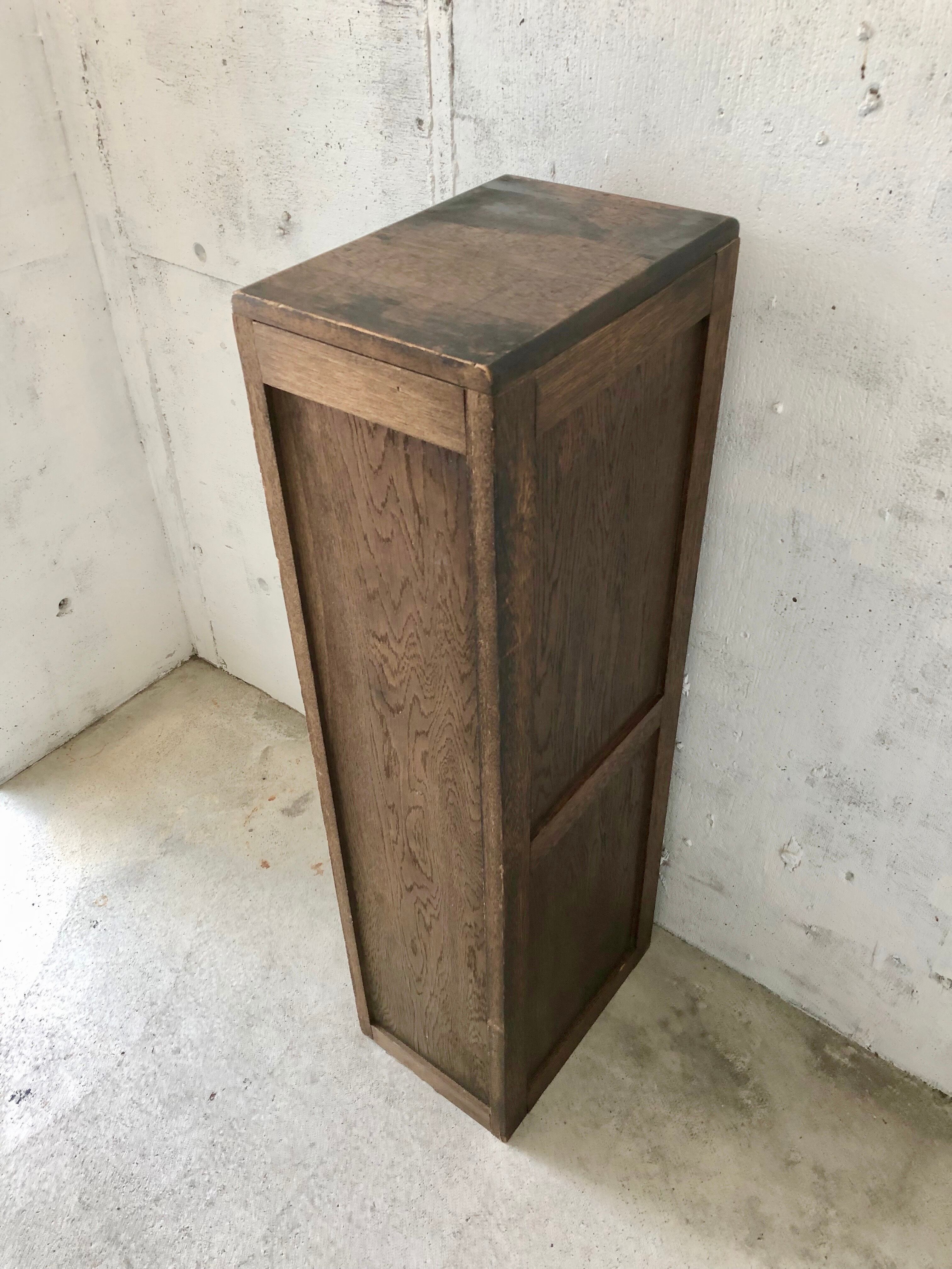 経年変化の雰囲気良い木肌、味のある取手が感じ良い収納棚。特に目立つがたつきもなく、状態は良いです。縦長で奥行も深すぎず、スッキリと置きながら収納できます。上部にはフックが付いているので、衣装部屋で洋服の収納としてや、キッチンで調味料などのストック棚、小物の収納としても活躍してくれそうです。