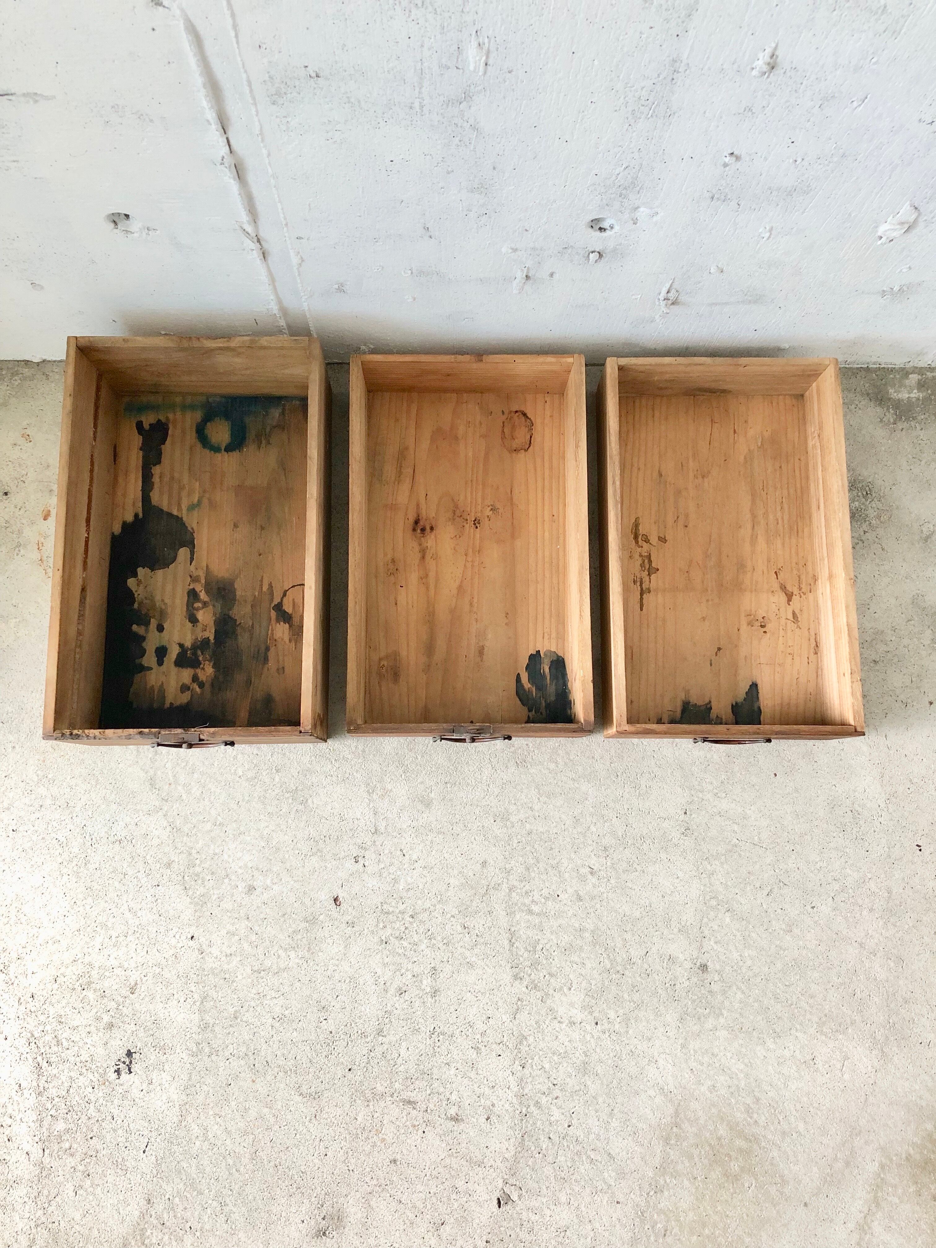 古い収納棚になります。スレや当たりキズ、禿げ、欠け、割れ、隙間、落としきれない汚れなどがあります。引出し中は少し汚れがありますが、開閉は比較的スムーズに行え、日常気軽にお使いいただけます。全体的に状態も良く、まだまだ実用的にお使いいただけます。