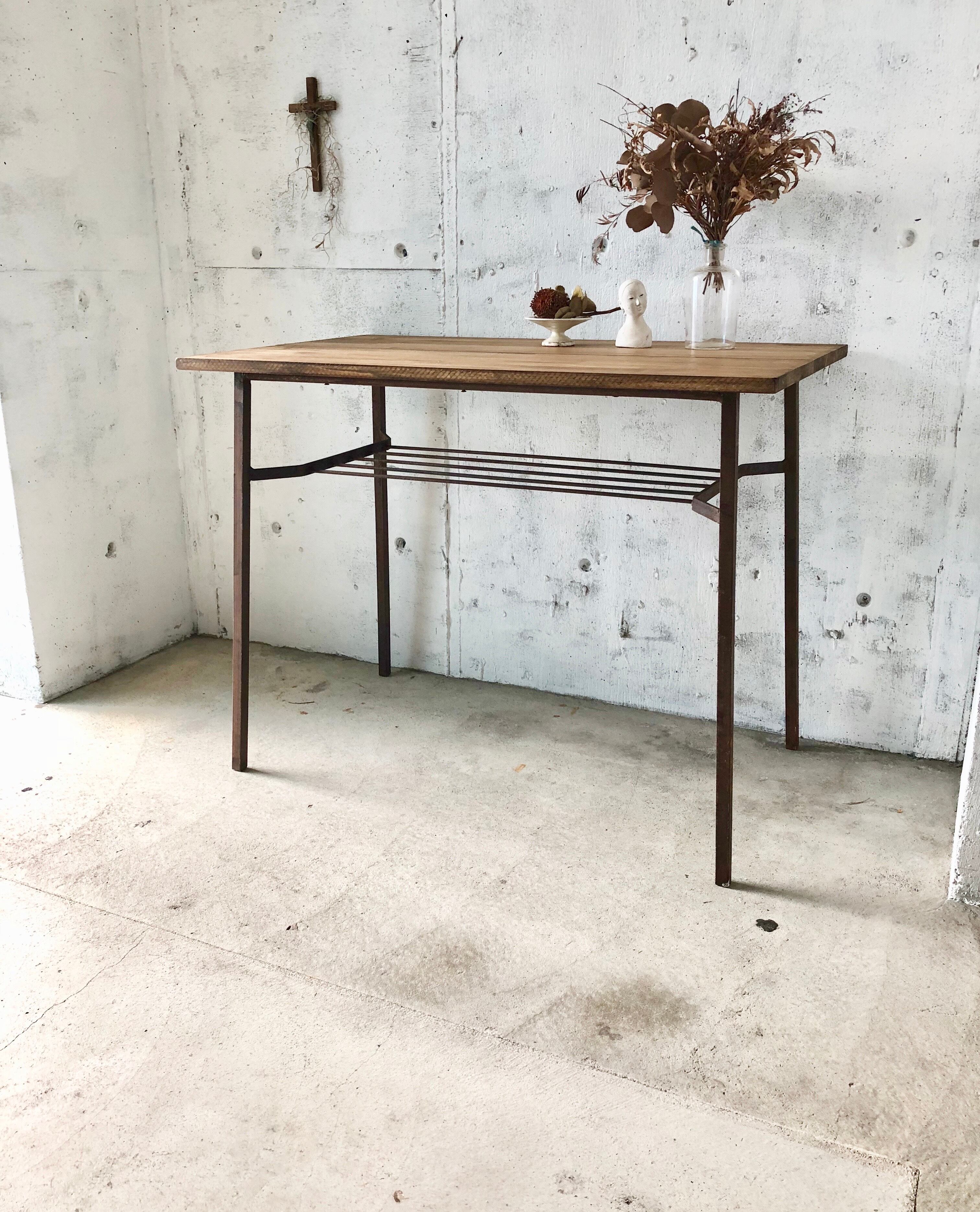 雰囲気の良い木味の天板と古い鉄脚が良く馴染んだ鉄脚テーブル。天板下のオープンラックも雑誌などが置けるので便利です。2人掛けの向かい合わせテーブルや食卓以外の時間でも、日常の作業をするのに程よいサイズ感がオススメです。味のあるテーブルひとつプラスするだけで雰囲気あるお部屋作りが叶いそうです。