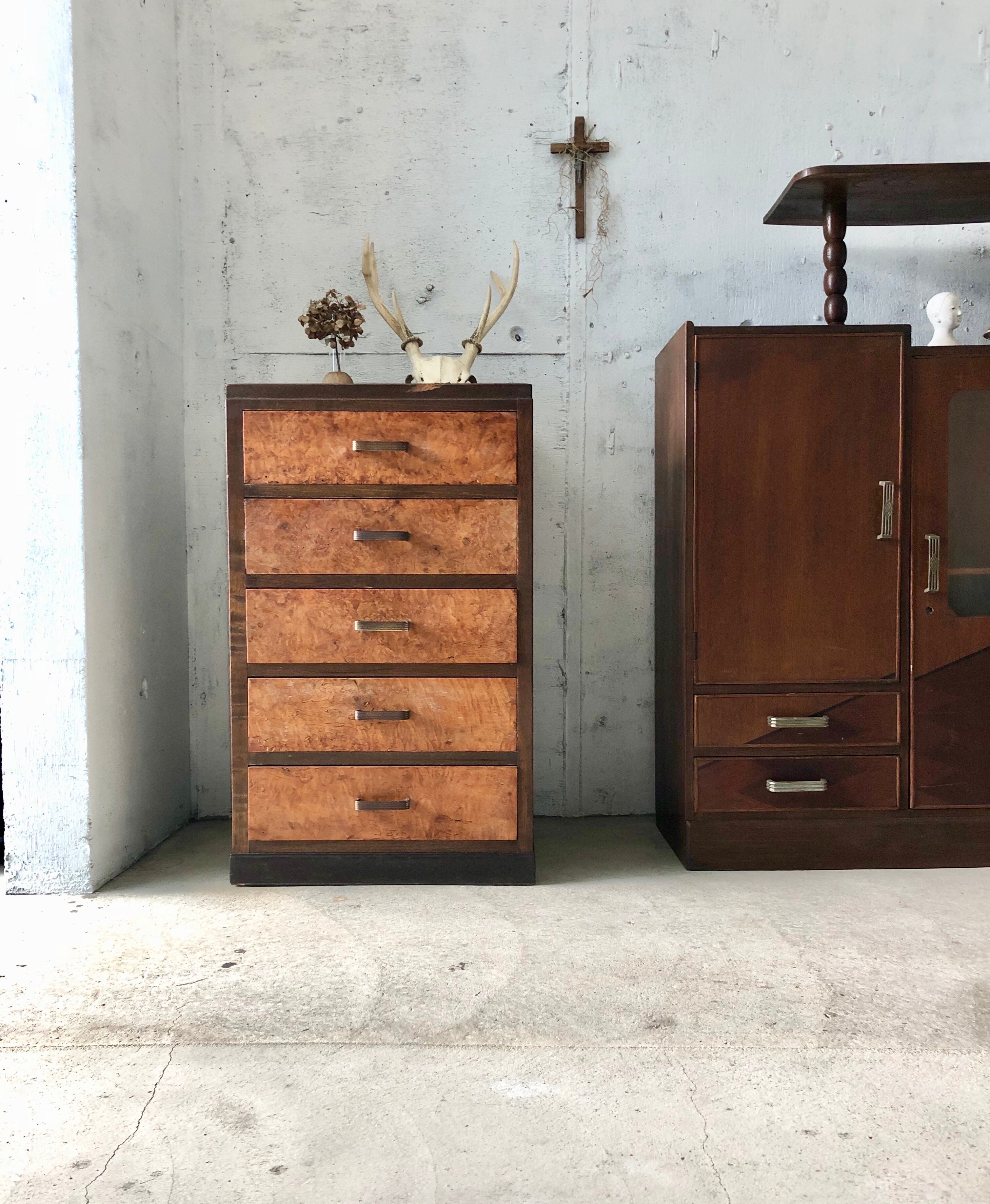 経年変化のバイカラーな木肌、雰囲気の良い取手が感じ良い収納棚。引出し中は少し汚れがありますが、開閉は比較的スムーズに行え日常気軽にお使いいただけます。収納は深さのある引出しが5段あり、収納力も十分です。作業部屋などでテーブル脇、棚横に置く収納棚してや、子供部屋でおもちゃなどの整理整頓としても良さそうです。