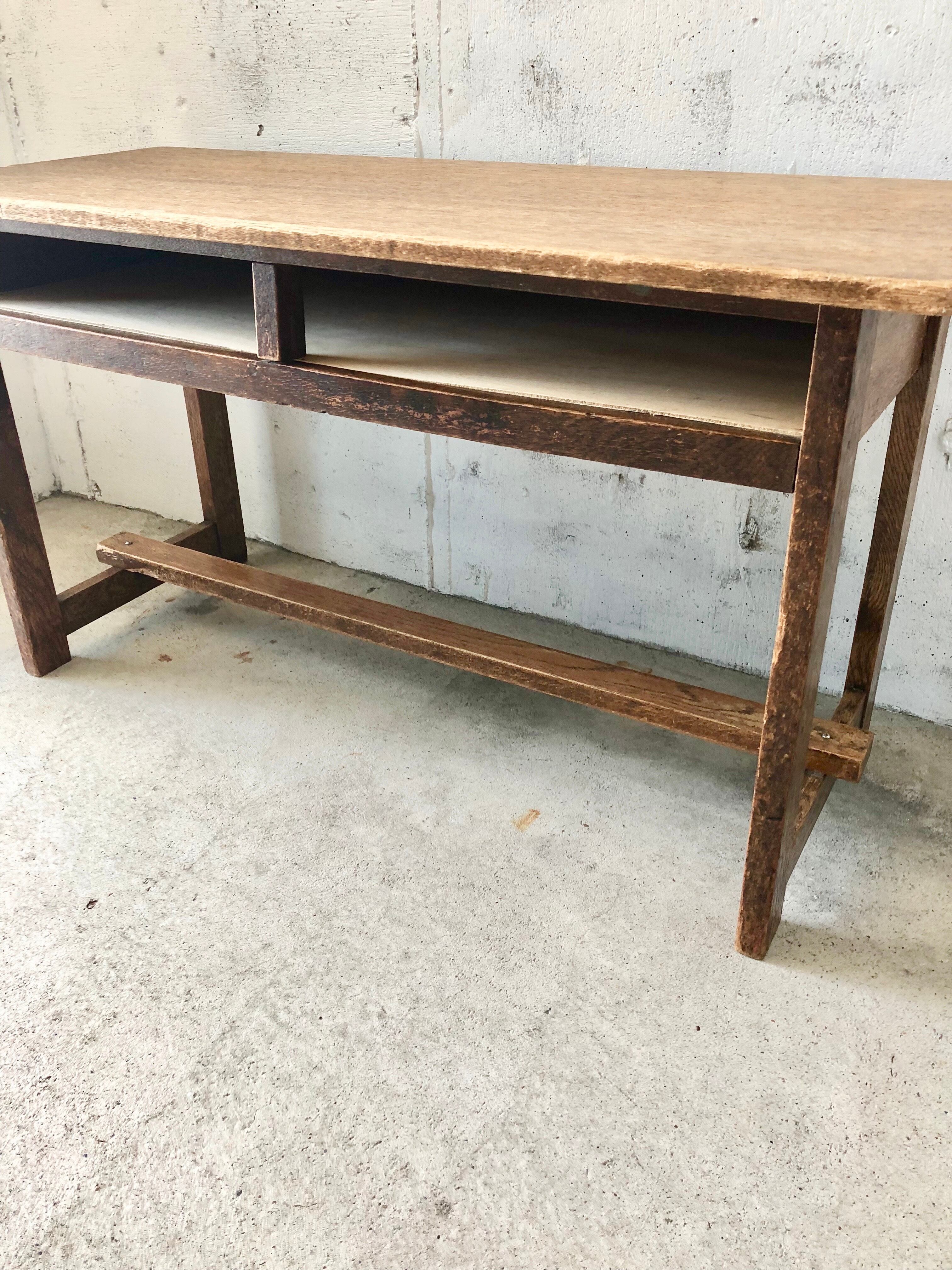 古い木製デスクになります。スレやハゲ、欠け、反り、割れ、隙間、当たりキズ、落としきれない汚れなどがあります。少しのがたつきはありますが、収納中は綺麗で全体的に状態も良いのでまだまだ実用的に活躍してくれます。