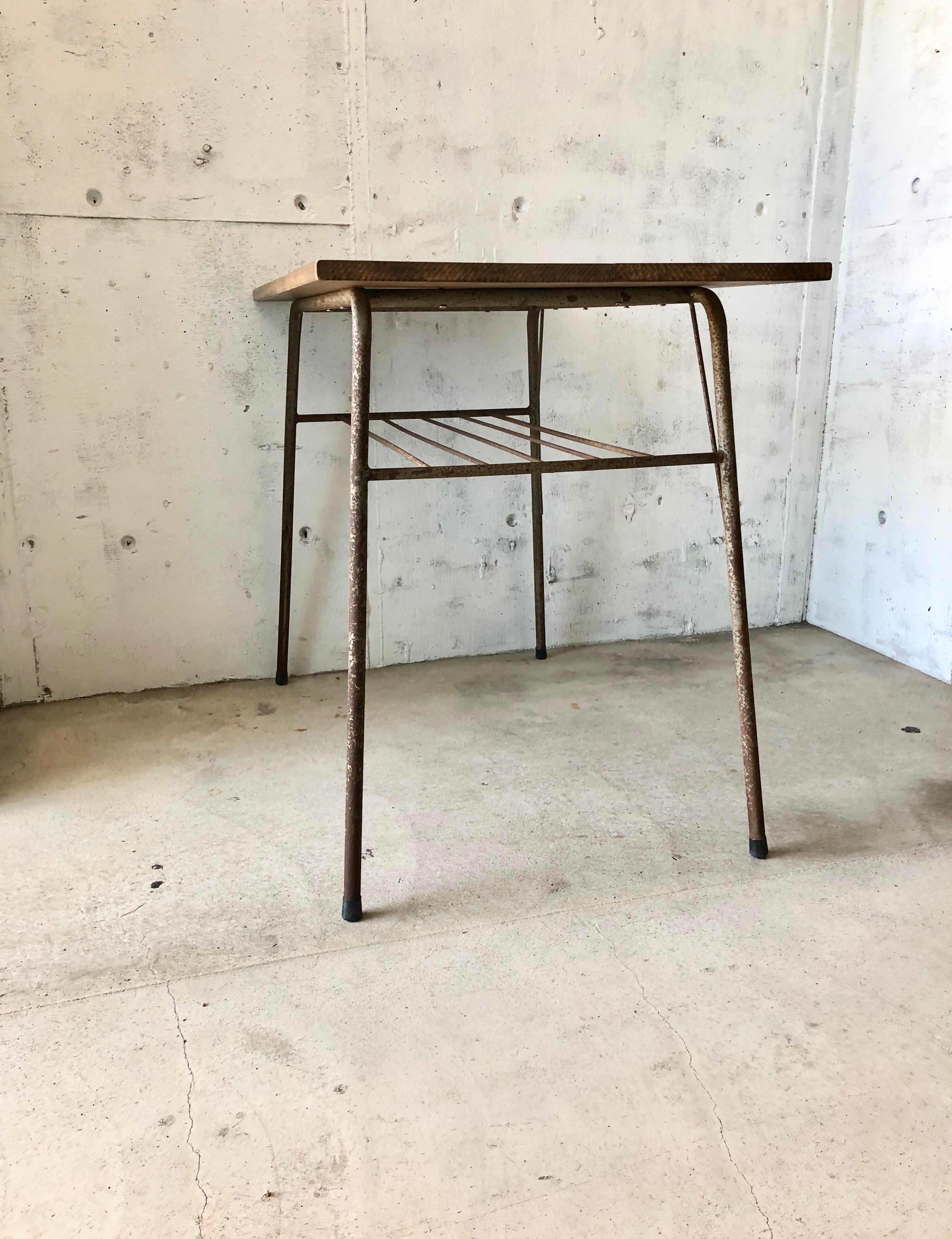 古い鉄脚と新材のテーブルになります。スレや剥げ、サビ、反り、当たりキズ、落としきれない汚れなどがあります。古い鉄脚になりますので少しのがたつきはありますが、しっかりとしていて強度上問題なくお使いいただけます。全体的に状態も良く、まだまだ実用的に活躍してくれます。