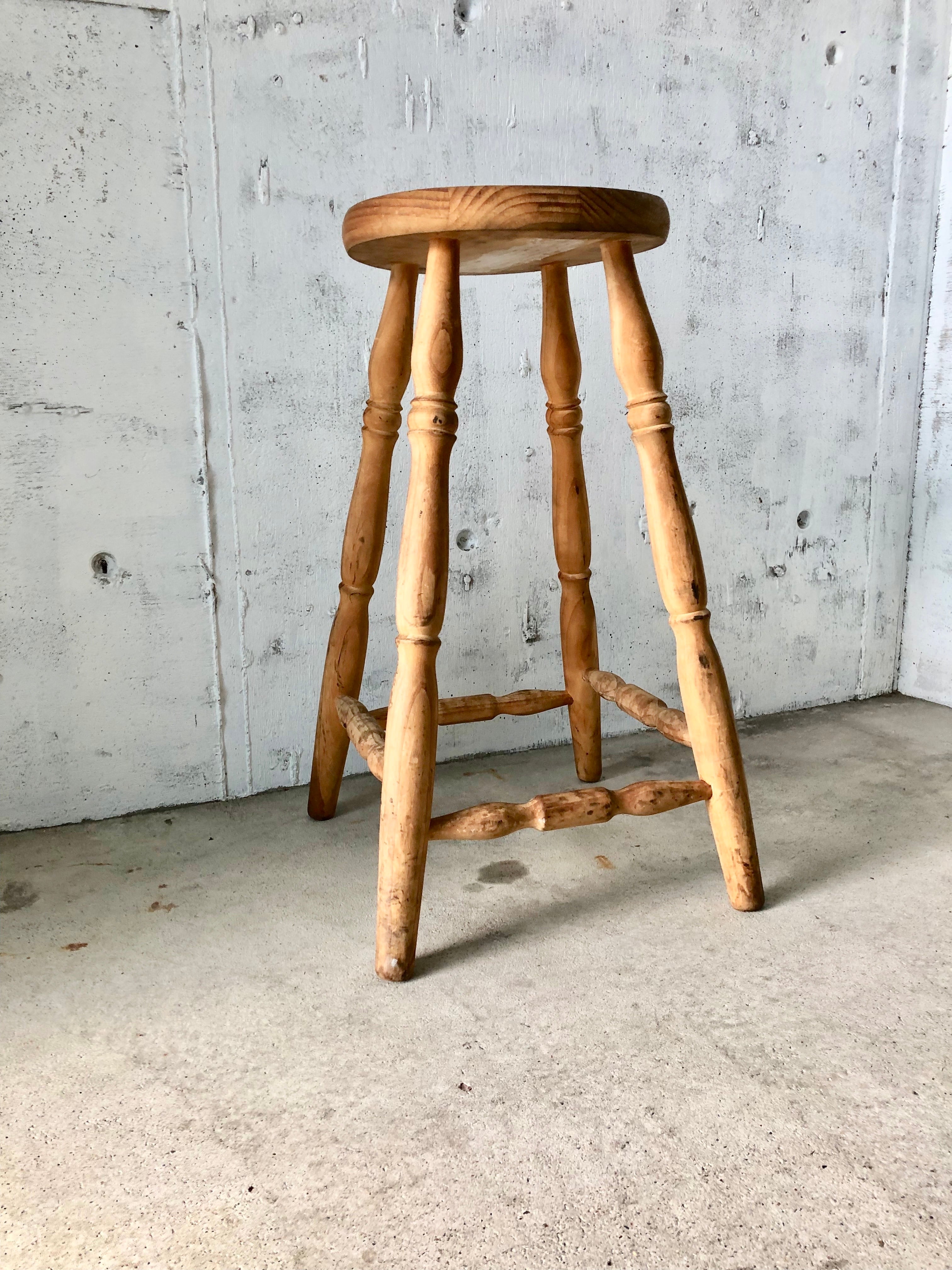 経年変化のナチュラルな木肌がとぐろ脚が感じ良いスツール。シンプルなデザインでお部屋にもすっと馴染んでくれそうです。少しのがたつきはありますが、状態は良いです。少し座高が高めなので、カウンターの椅子としてやキッチンや玄関先の腰掛け椅子、植物を飾るディスプレイ台としても感じ良さそうです。