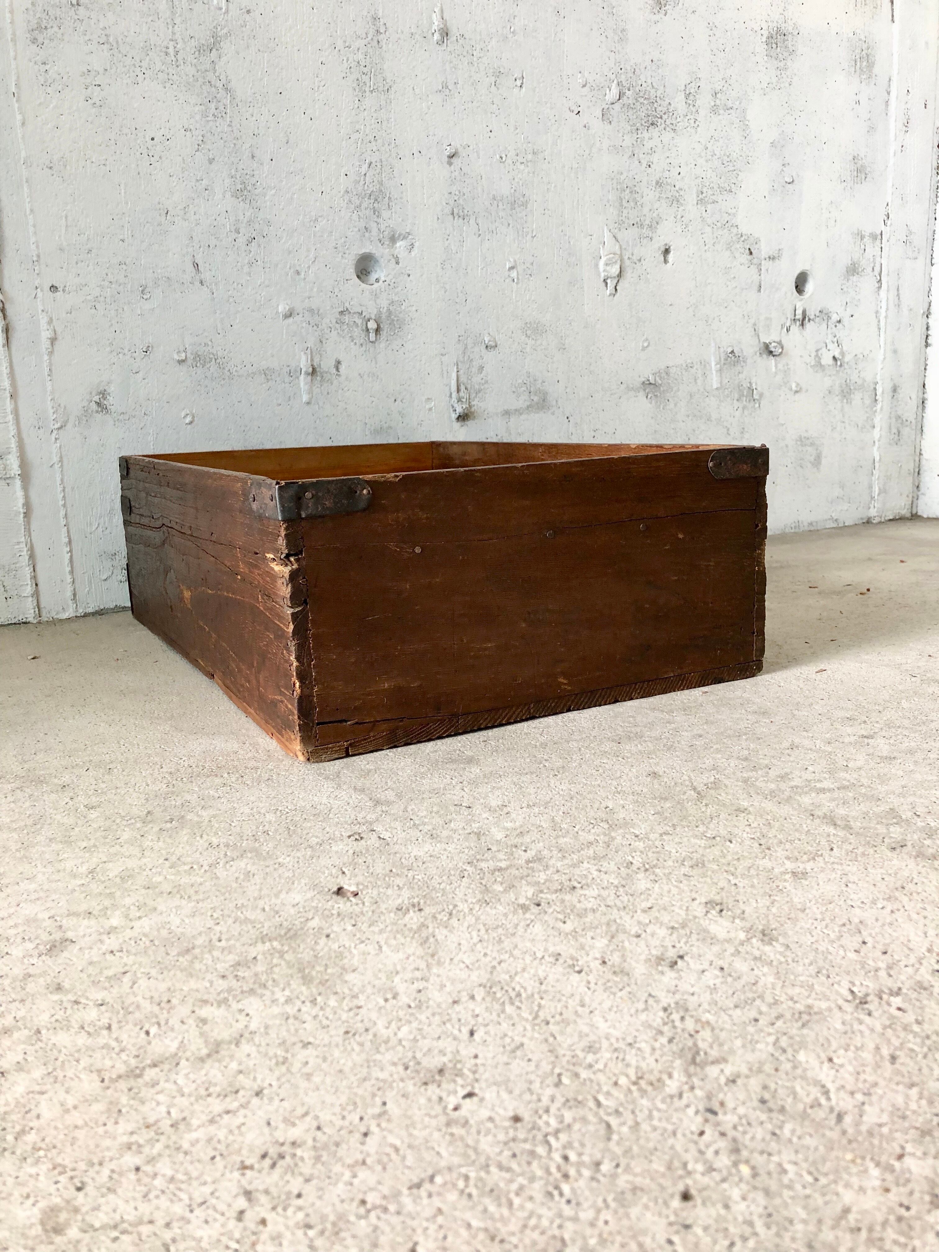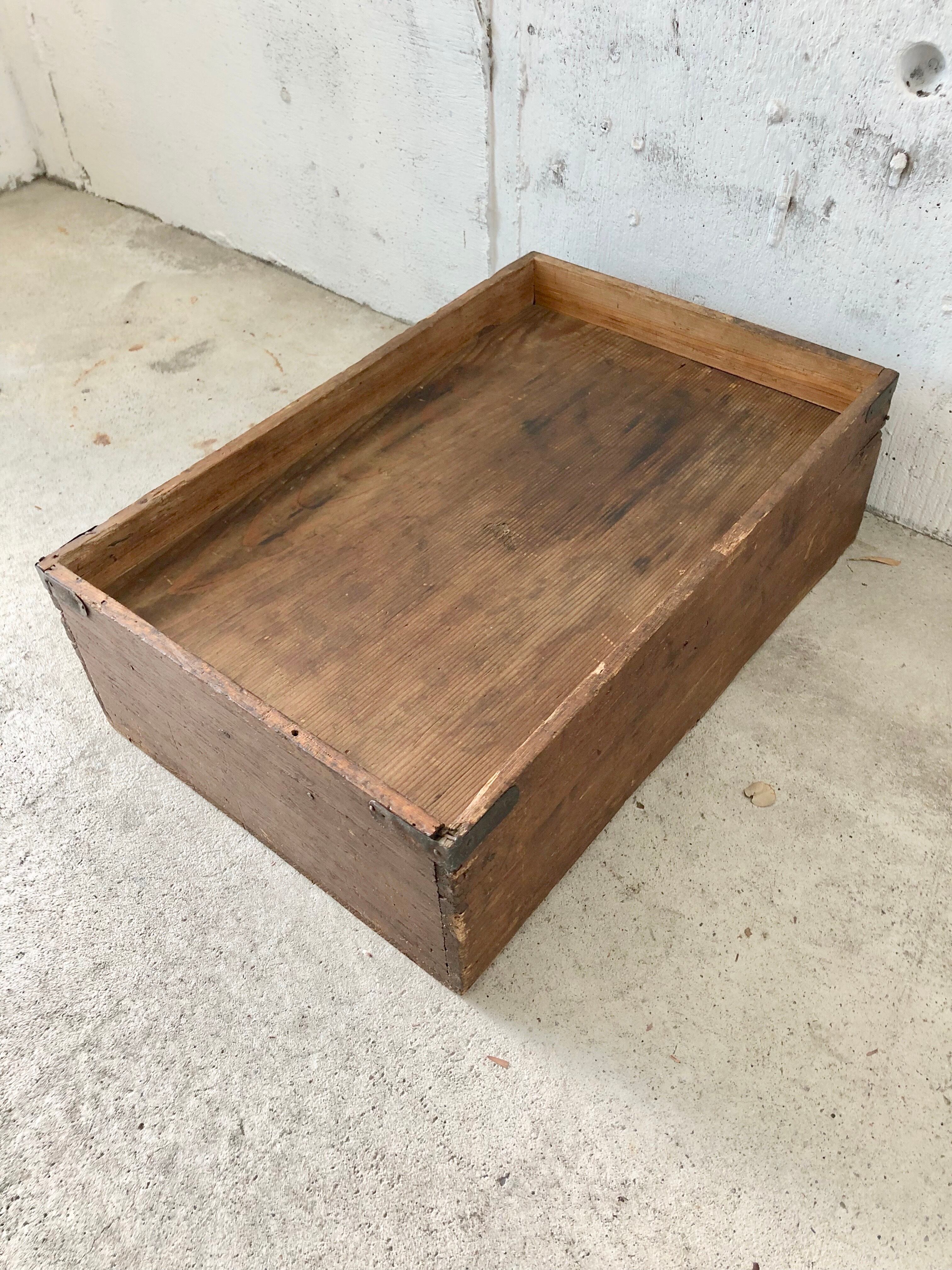 古い収納箱になります。スレや当たりキズ、欠け、割れ、剥げ、隙間、サビ、反り、落としきれない汚れなどがあります。引出し中は少し汚れがありますが、開閉は比較的スムーズに行え日常気軽にお使いいただけます。全体的に状態も良いのでまだまだ実用的にお使いいただけます。