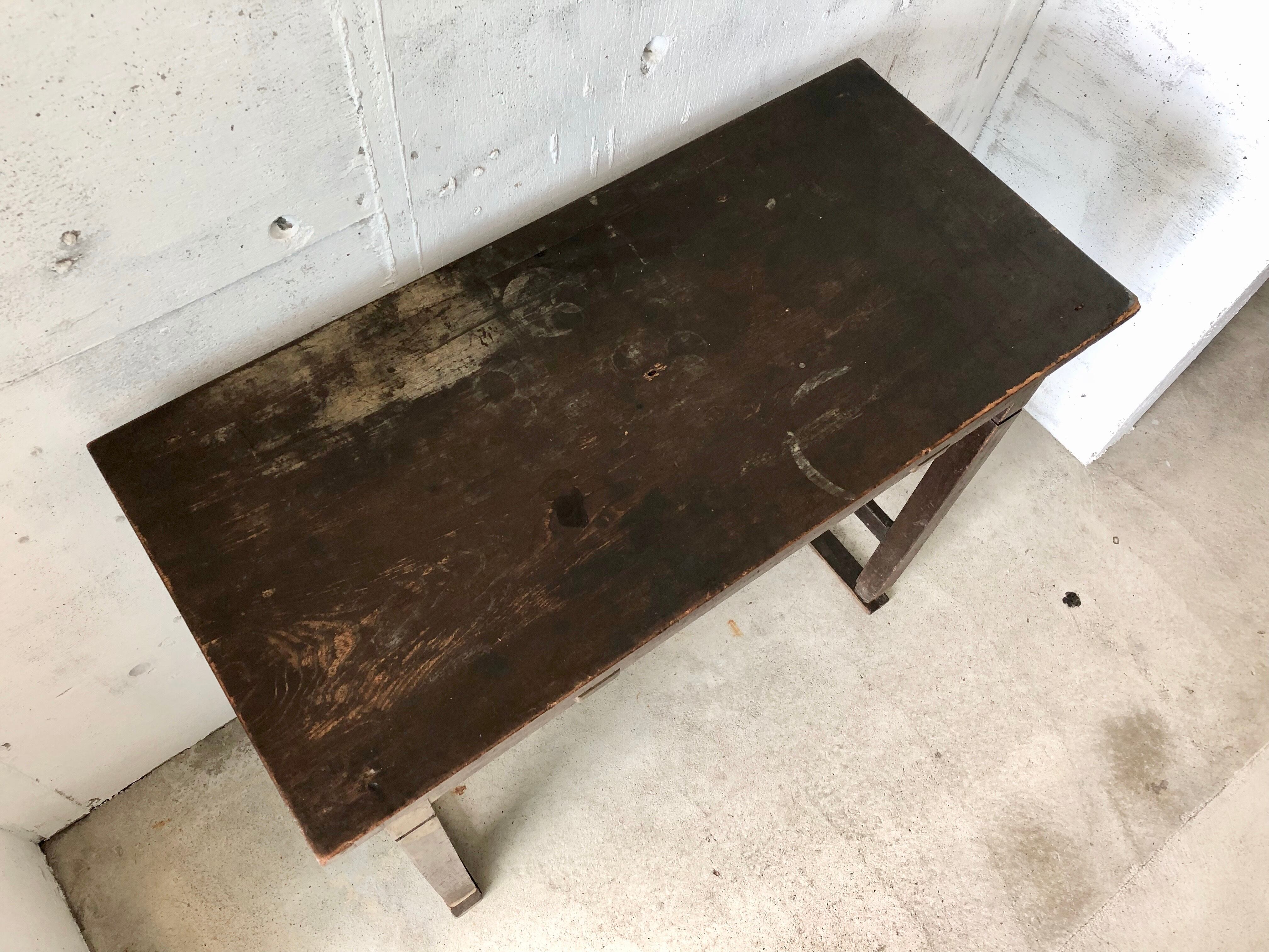 経年変化の落ち着きのある木肌、雰囲気の良い真鍮取手が感じ良い木製デスク。少しのがたつきはありますが、状態は良いです。実用使いで作業テーブルとしてやお子さんの勉強机として、ショップさんの商品を置く什器としても素敵にお使いいただけそうです。