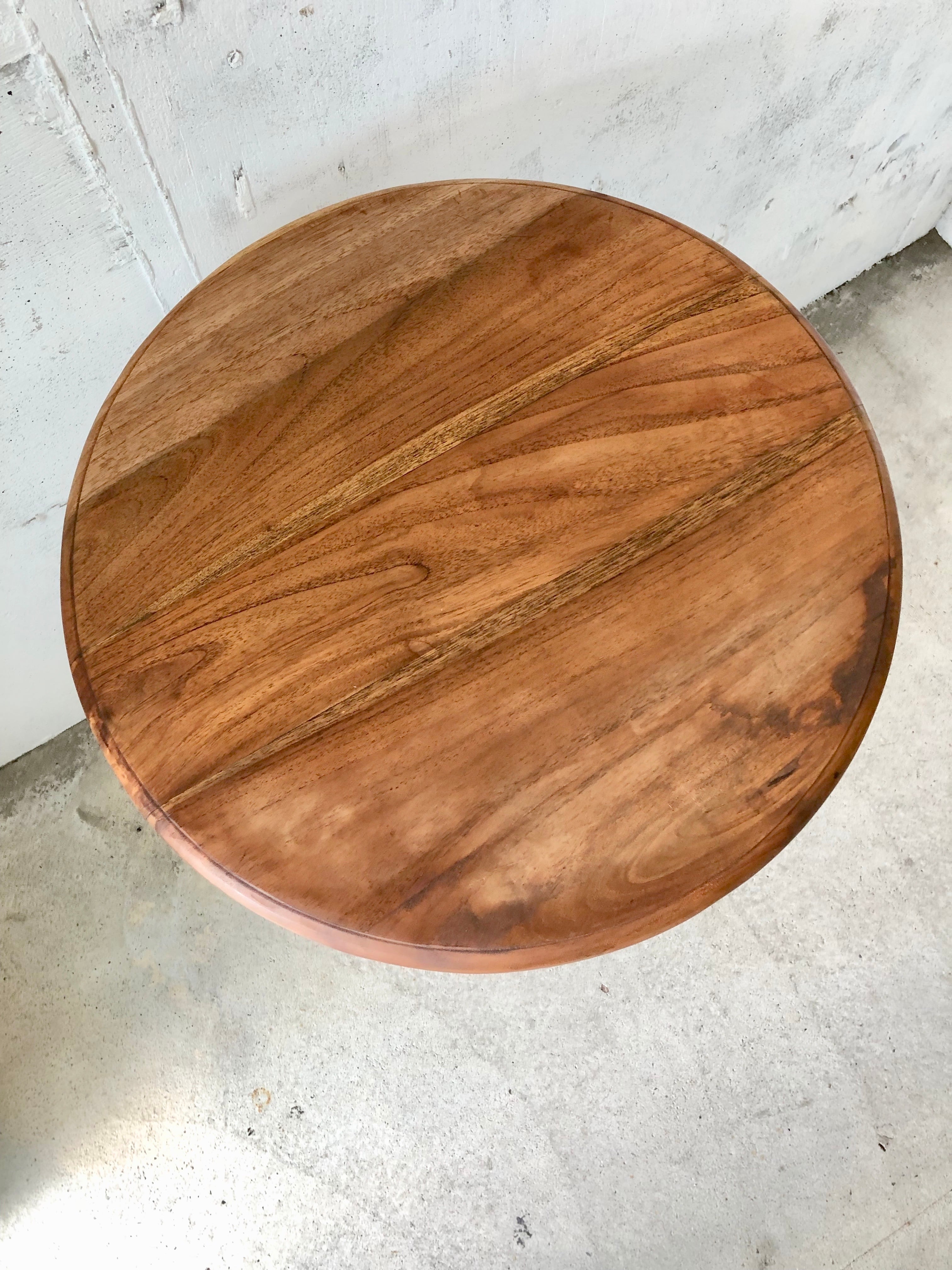 経年変化の雰囲気の良い佇まい、デザイン性のある脚が感じ良いラウンドテーブル。少しのがたつきはありますが、状態は良いです。ソファーテーブルとしてやお部屋で一息お茶をするカフェテーブルとしても素敵です。ショップさんの店舗什器で商品のディスプレイ台やカフェ席のテーブルとしてもオススメです。