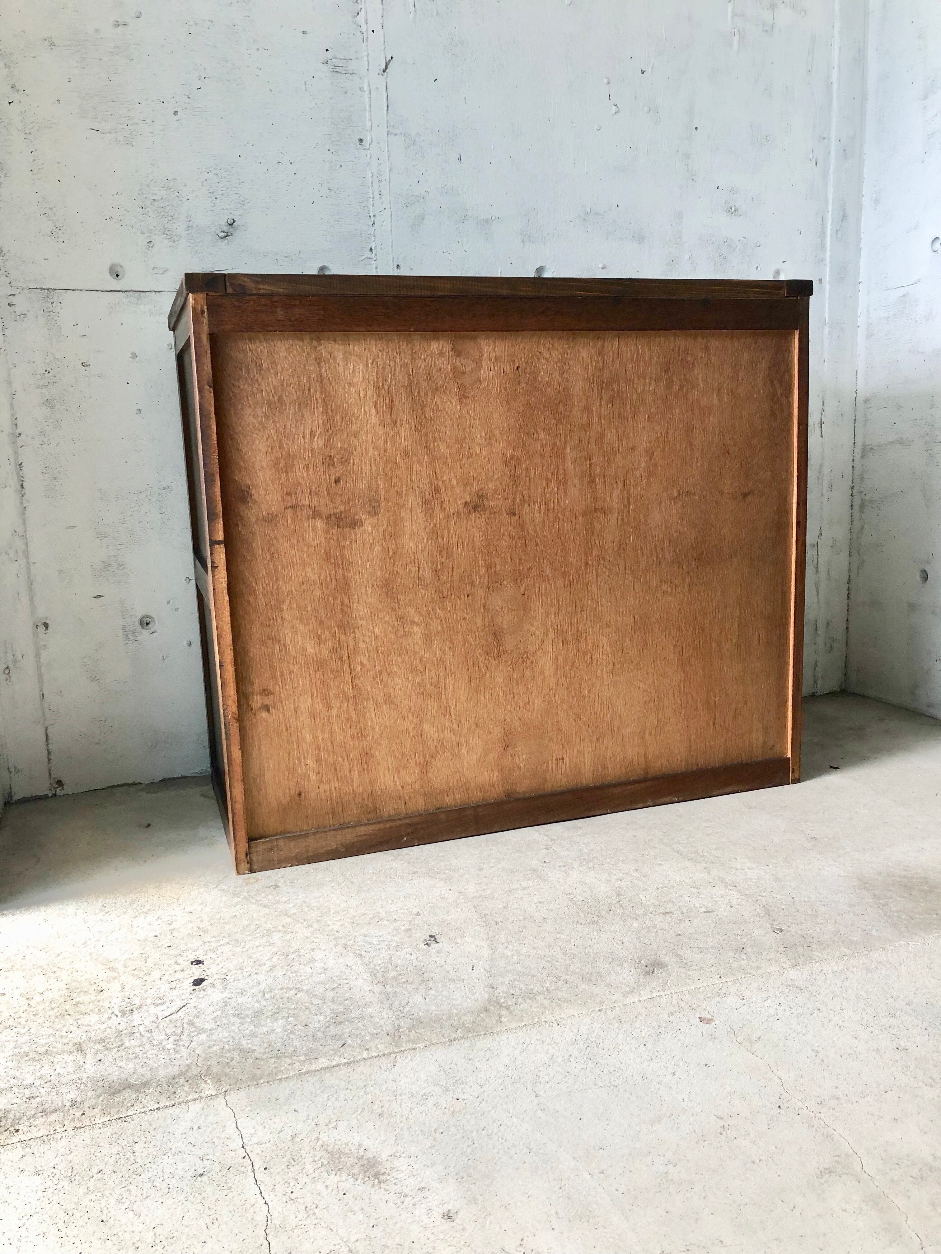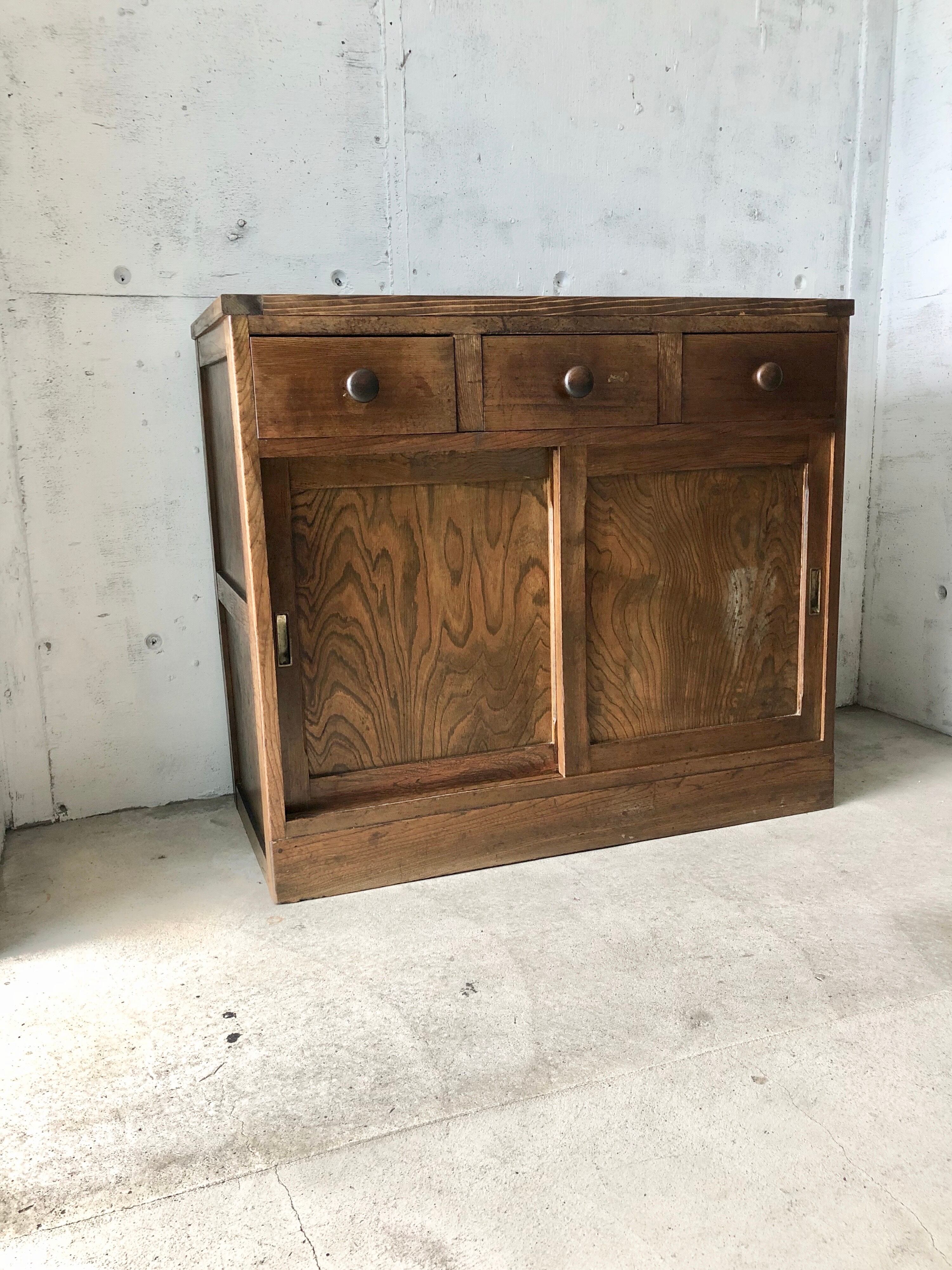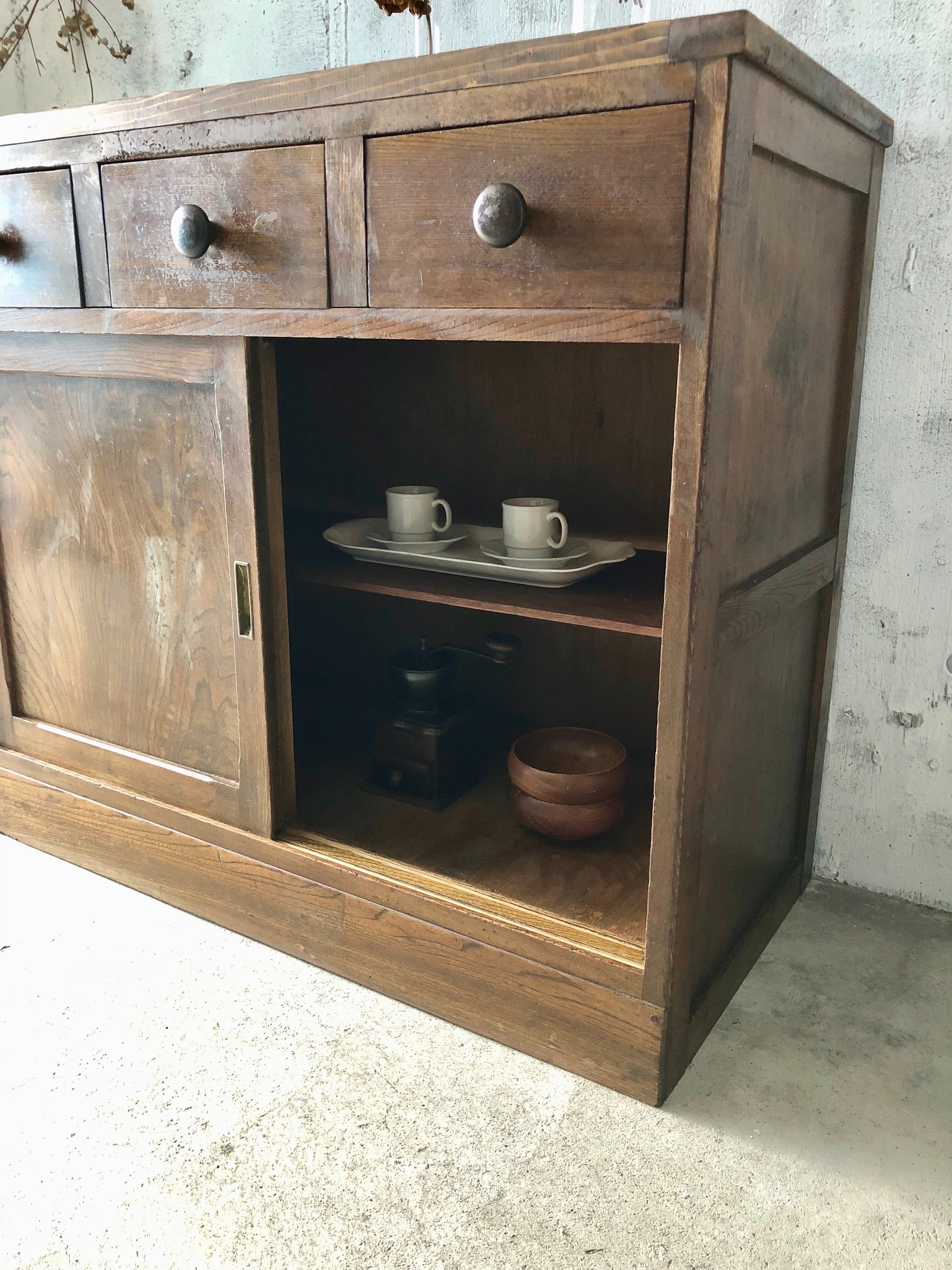 古いカウンターシェルフになります。スレや欠け、サビ、当たりキズ、割れ、反り、落としきれない汚れなどがあります。引き戸、引出しの開閉は比較的スムーズに行え、使用上問題なくお使いいただけます。収納中の板は取り外し出来ます。全体的に状態も良いのでまだまだ実用的に活躍してくれます。