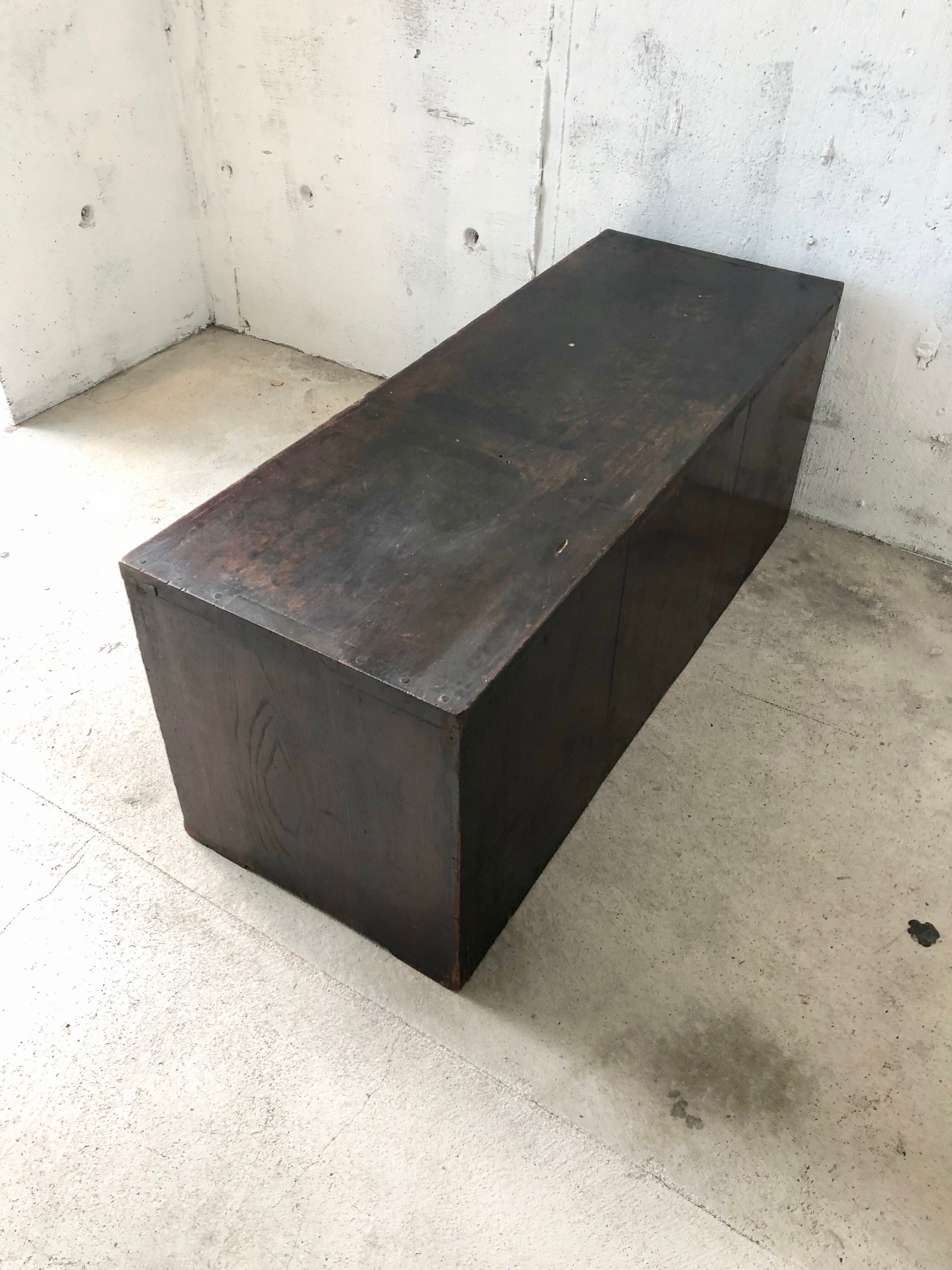 古いローボードになります。スレや欠け、虫食い、当たりキズ、割れ、反り、落としきれない汚れなどがあります。ガラス戸、引出しの開閉は比較的スムーズに行え、使用上問題なくお使いいただけます。戸の鍵は付属していません。収納中の板は取り外し出来ます。ガラスの状態も綺麗で、全体的に状態も良いのでまだまだ実用的に活躍してくれます。