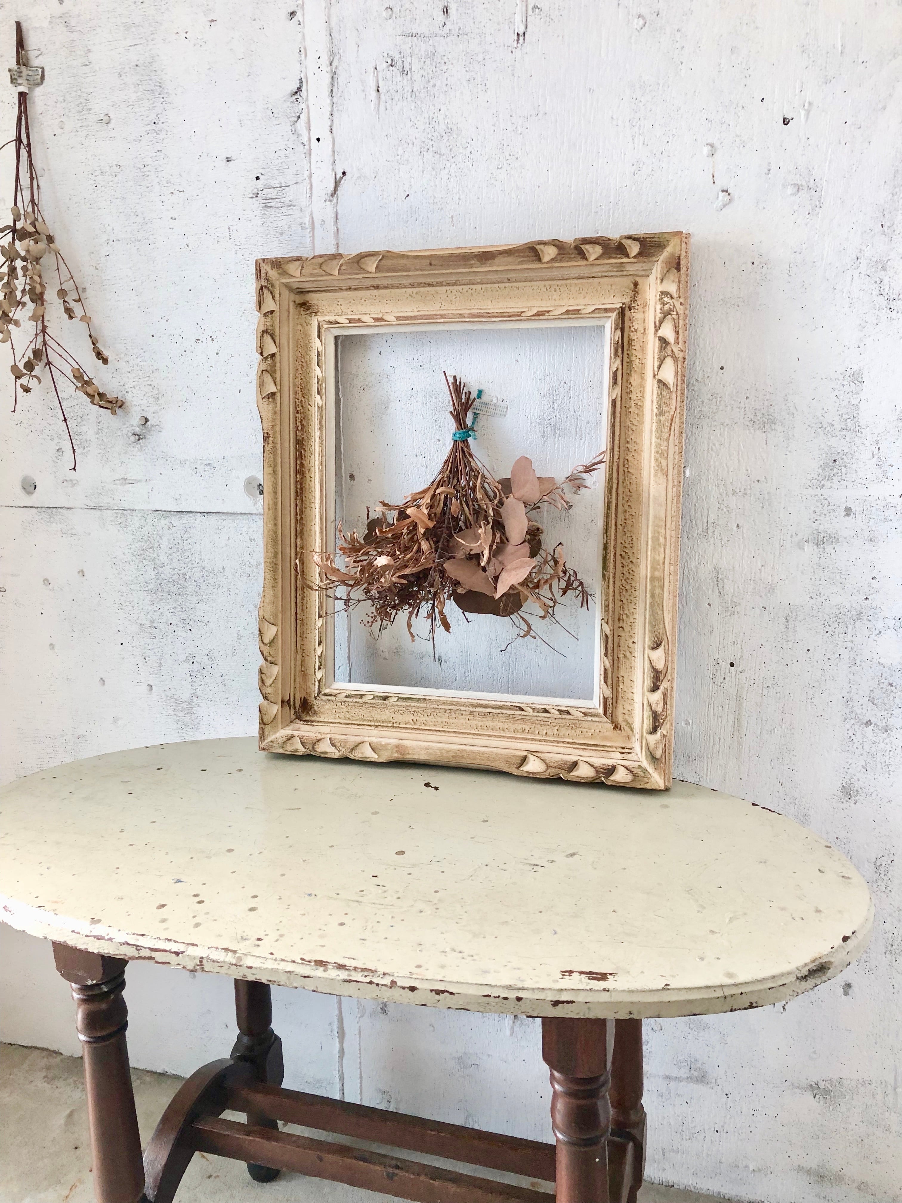 程よく禿げた白ペイントと古材が雰囲気の良いブロカントな木枠。木枠のデザインも感じ良く造られています。壁掛けや床、卓上に置いて、木枠の中にドライフラワーなどをこんもり飾ってみても、素敵な空間造りが叶いそうです。