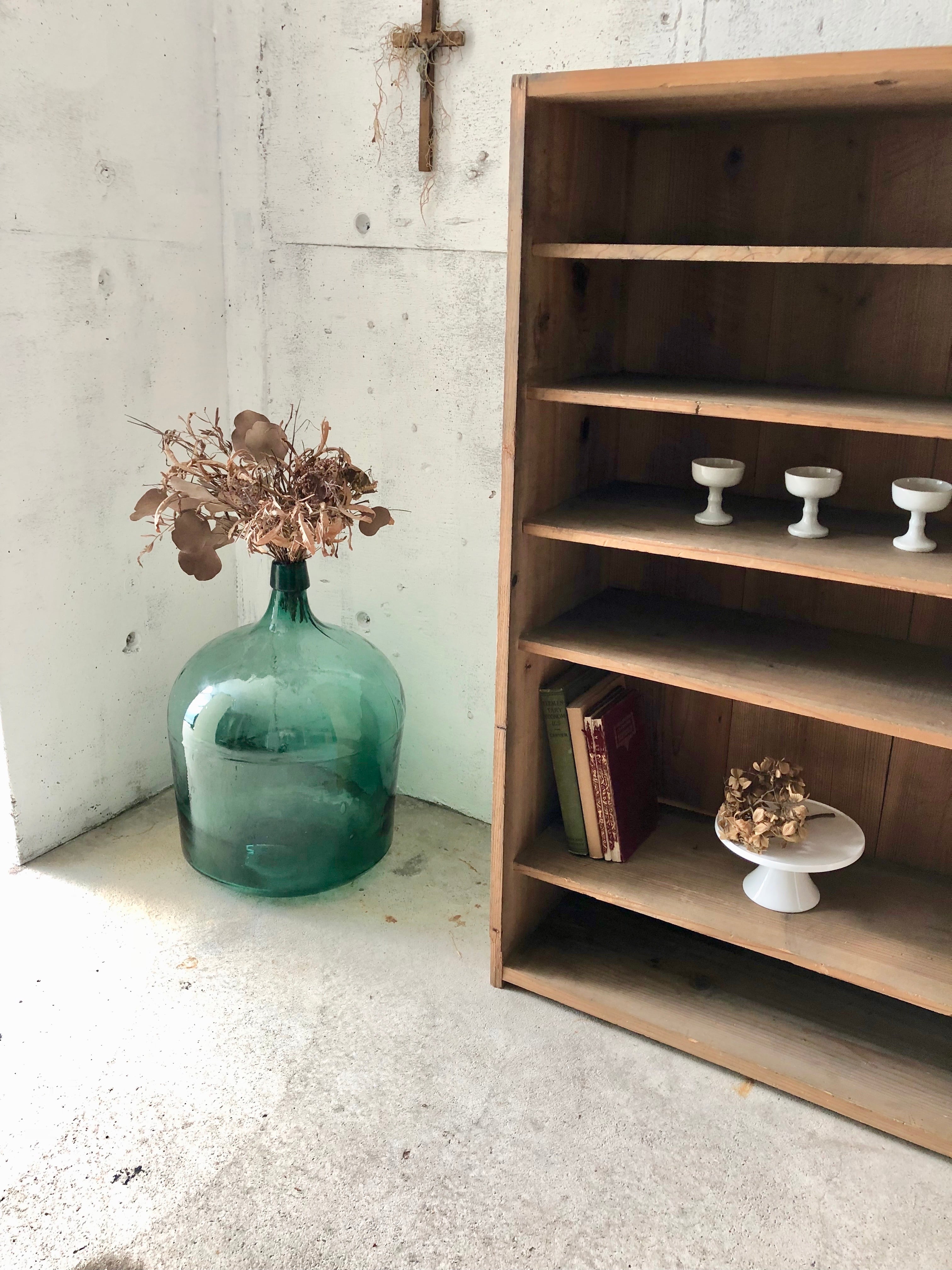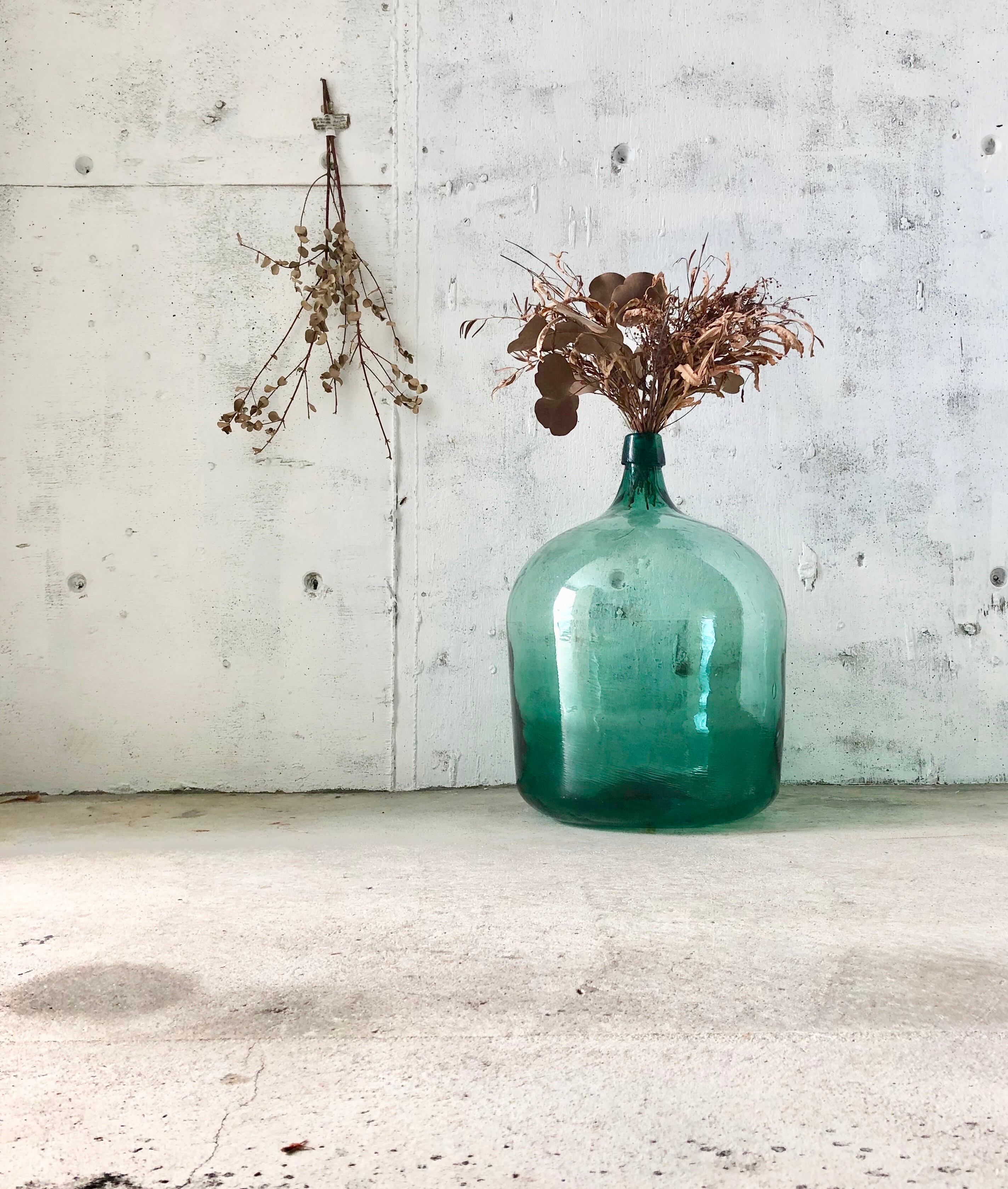 緑がかったガラスの色味が綺麗な、大きめサイズのガラス瓶。全体的に綺麗で状態も良いです。自宅使いでお部屋のディスプレイやショップのディスプレイとして、ドライフラワーをこんもり入れて飾ってみたり、大きめな木枝を入れて、格好良く飾ってみても素敵な空間が演出できそうです。