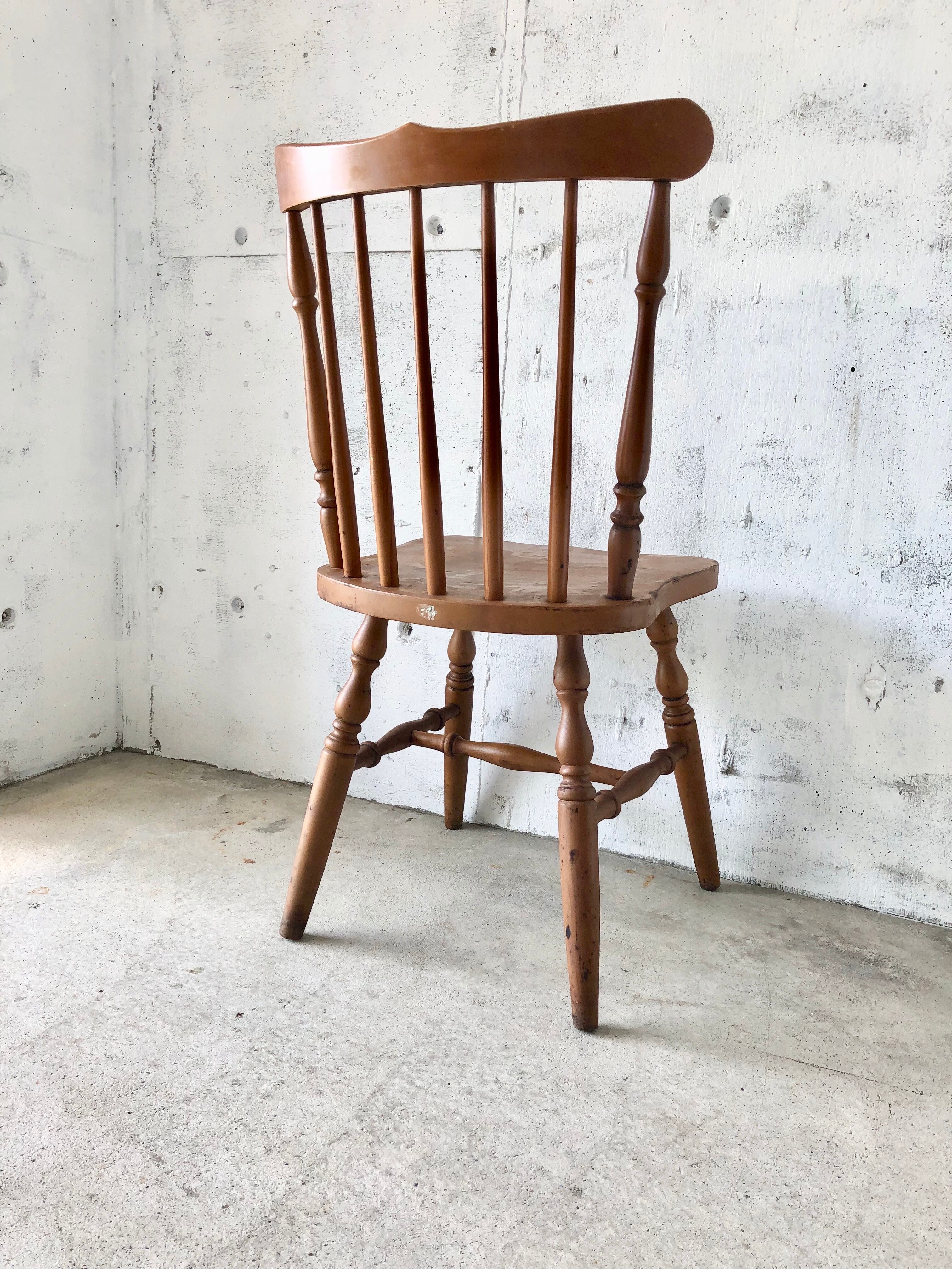経年変化の雰囲気良い木肌、デザイン性のある姿、ろくろ脚が感じ良い木製チェア。少しのがたつきはありますが、状態は良いです。ダイニングで違う椅子と組み合わせて使ってみたり、作業机の椅子としてや玄関先やキッチンなどで腰掛け椅子などとして置いてみても感じ良く写りそうです。