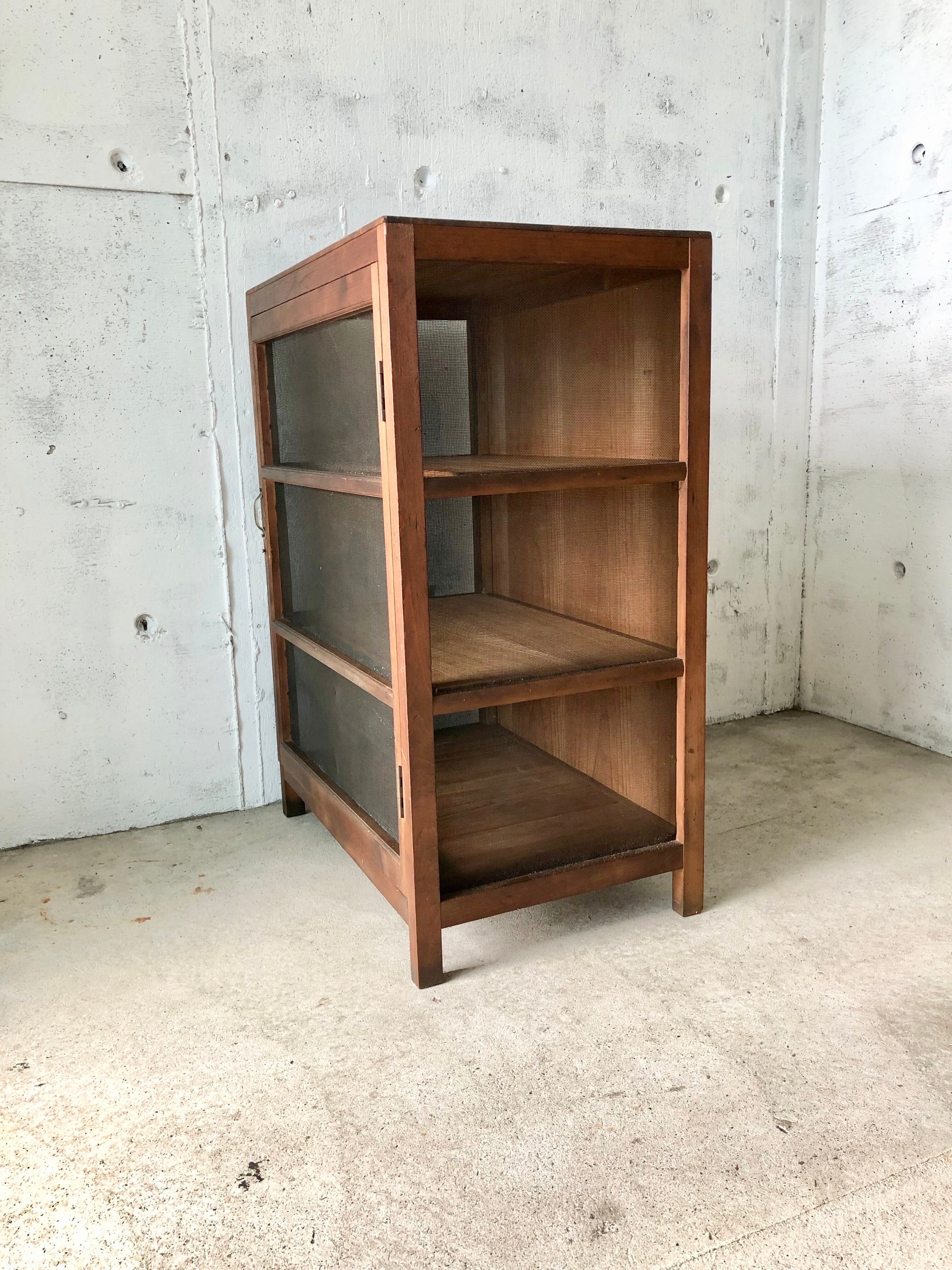 経年変化の雰囲気の良い木肌とチキンネットの掛け合わせが感じ良い収納棚。特に目立つがたつきはなく、状態は良いです。キッチンで食器のストック棚としてや、本や小物の収納としても感じ良さそうです。チキンネットで棚中は通気性も良いです。 程良いサイズ感がインテリアに取り入れやすくお勧めです。
