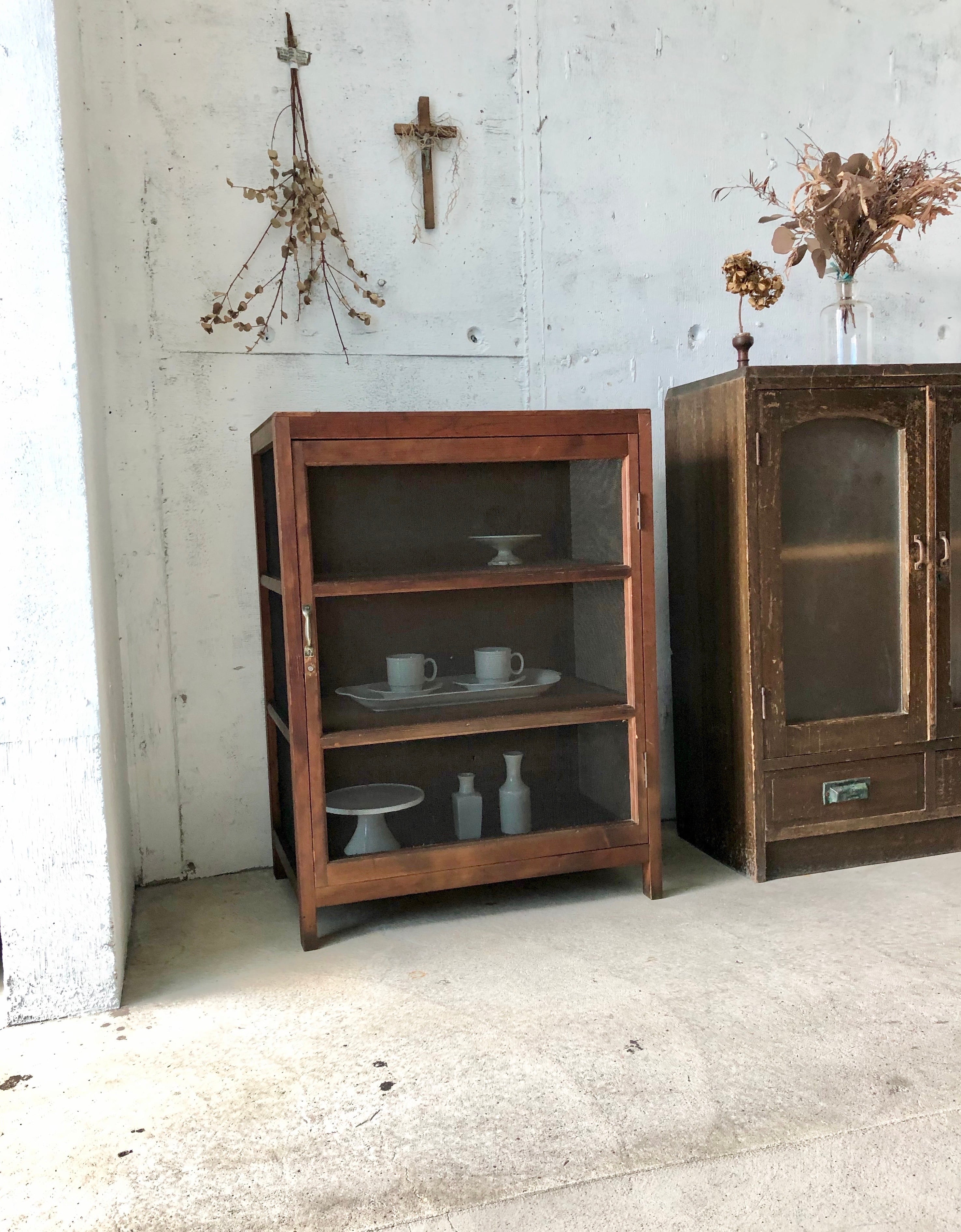 古いチキンネット棚になります。スレや剥げ、当たりキズ、割れ、欠け、網の破れ、落としきれない汚れなどがあります。扉の開閉は比較的スムーズに行え、日常問題なくお使いいただけます。全体的に状態も良く、まだまだ実用的にお使いいただけます。