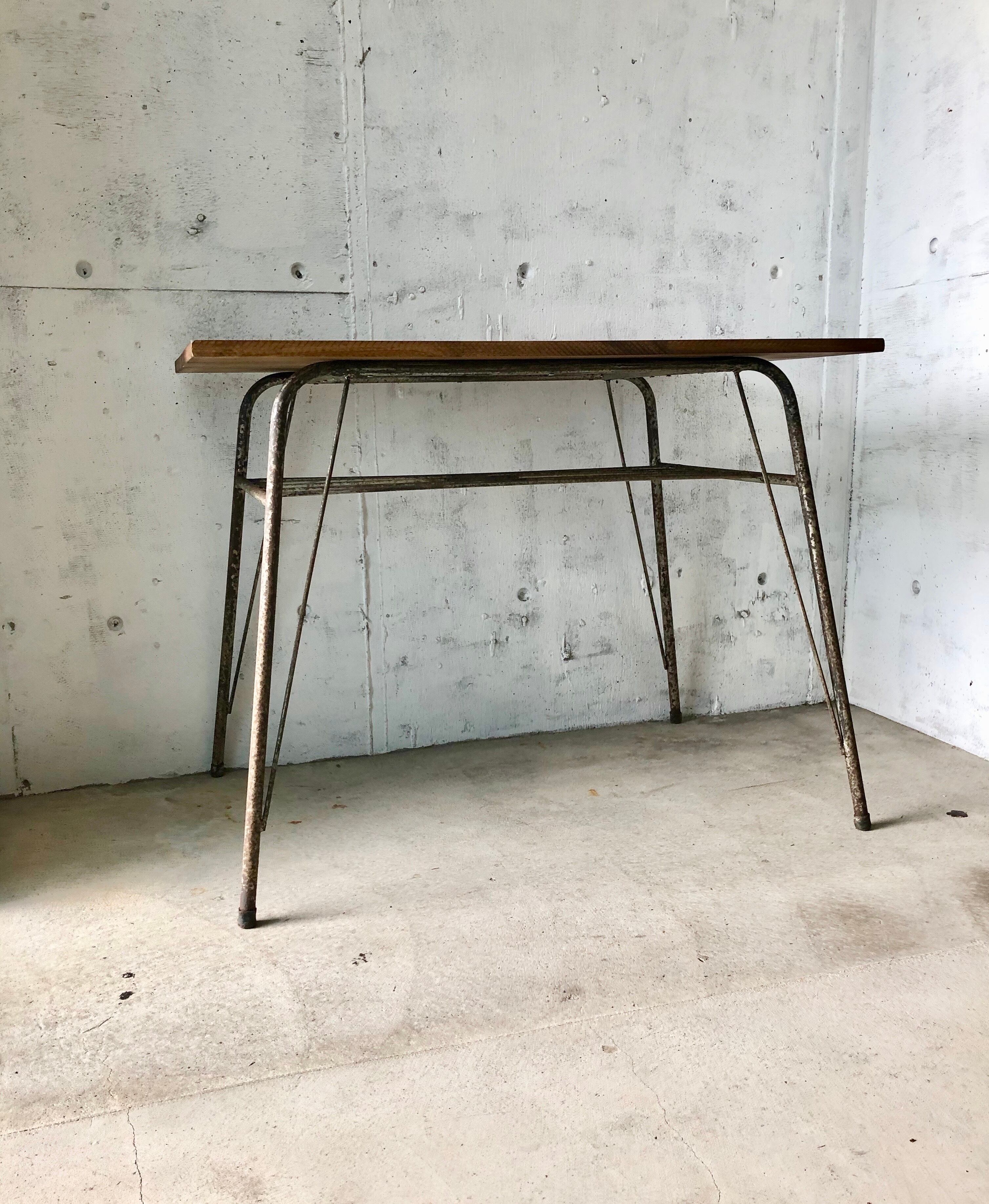 古い鉄脚と新材のテーブルになります。スレや剥げ、反り、割れ、サビ、隙間、当たりキズ、落としきれない汚れなどがあります。古い鉄脚になりますので少しのがたつきはありますが、しっかりとしていて強度上問題なくお使いいただけます。全体的に状態も良く、まだまだ実用的に活躍してくれます。