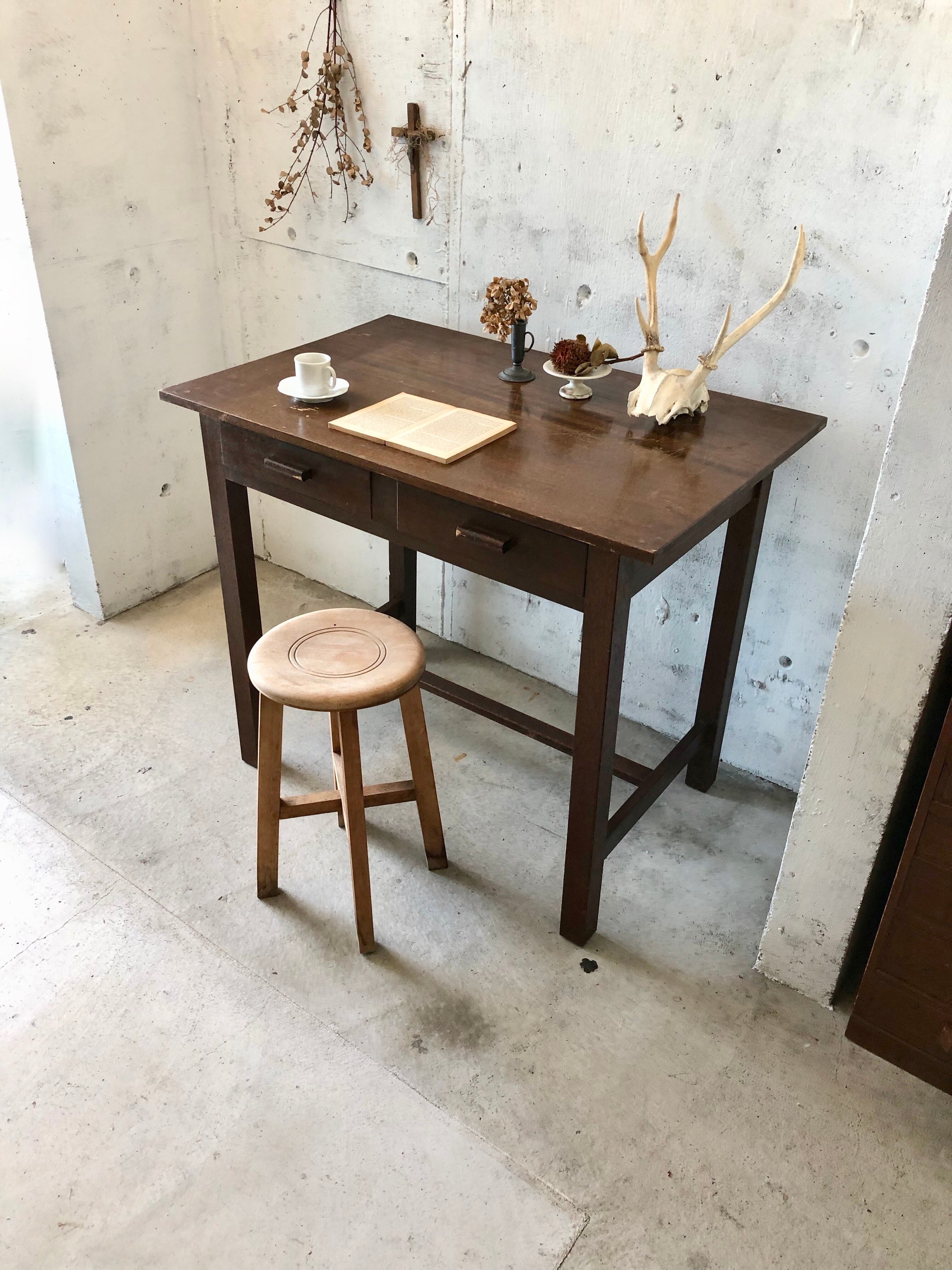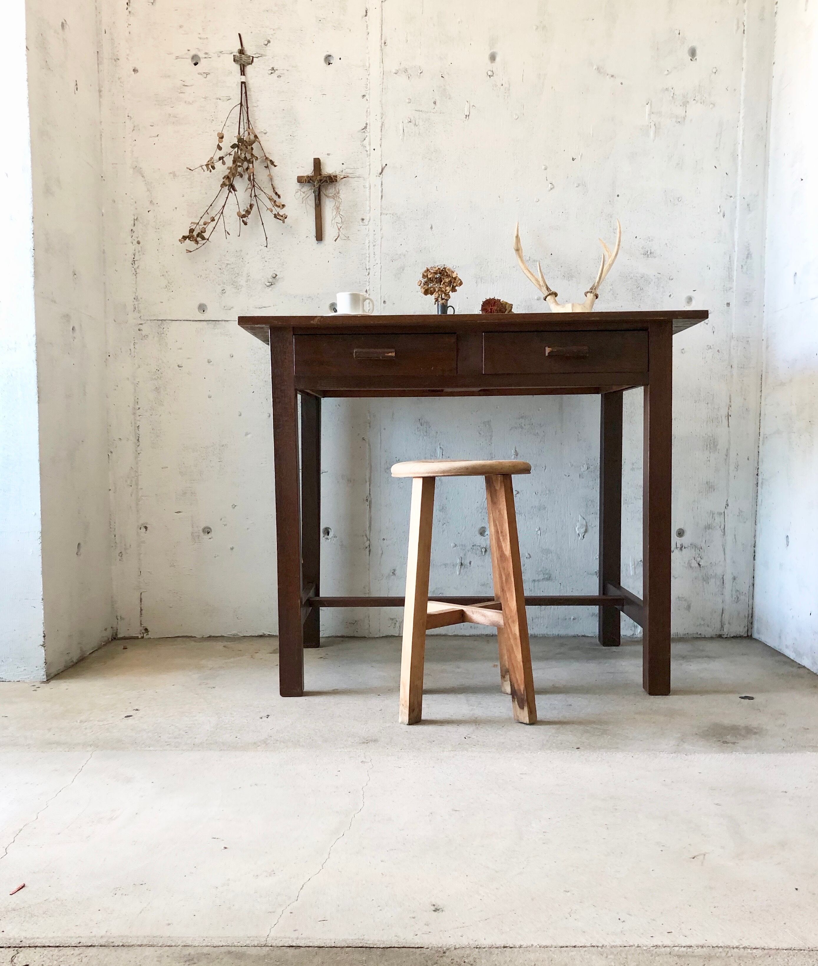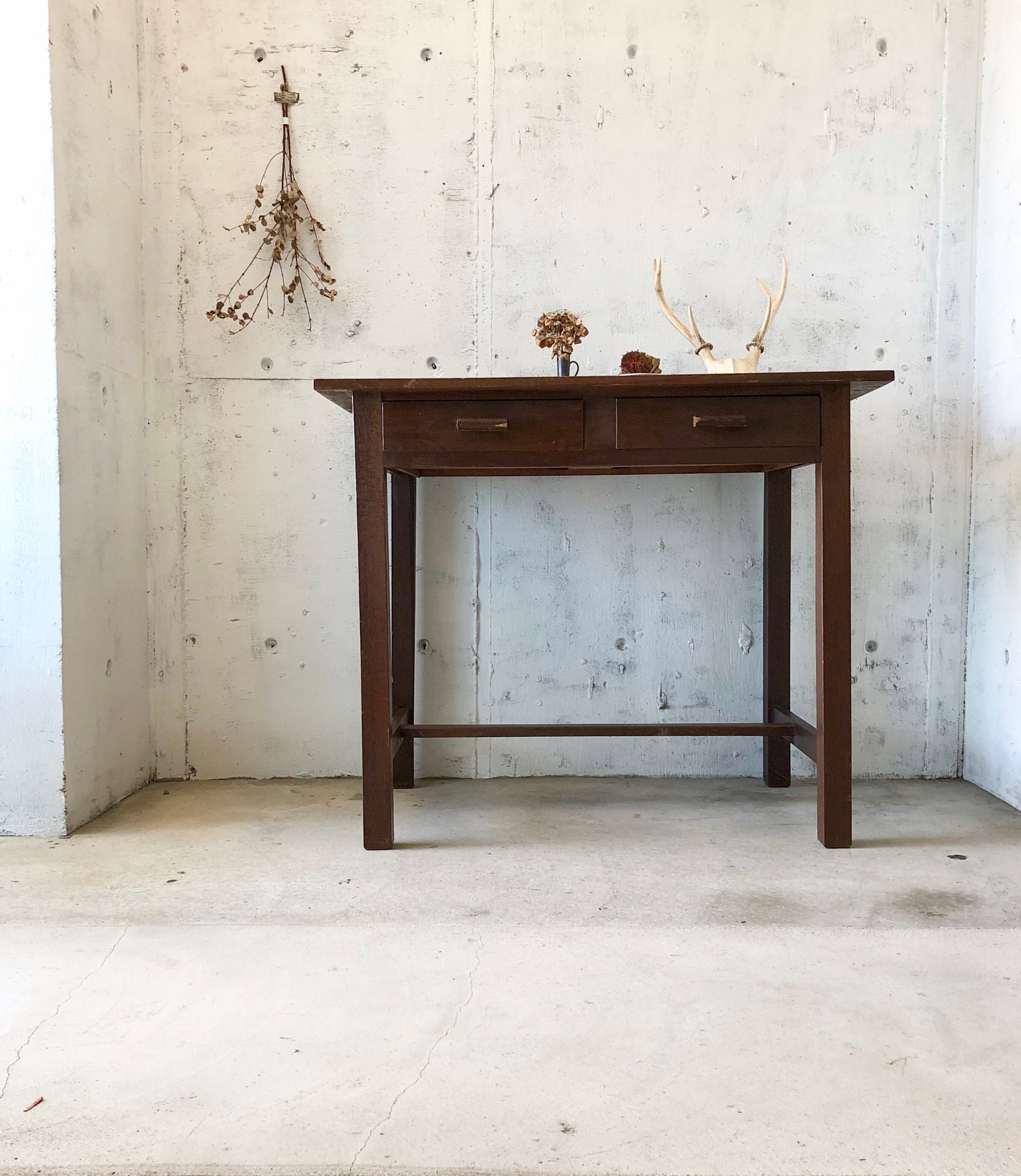 経年変化の雰囲気の良い木肌と味のある木の取手、すっきりとした姿が感じ良い木製デスク。少しのがたつきはありますが、状態は良好です。実用使いで2人用の向かい合わせテーブルや作業テーブルとして、お子さんの勉強机としても素敵にお使いいただけそうです。