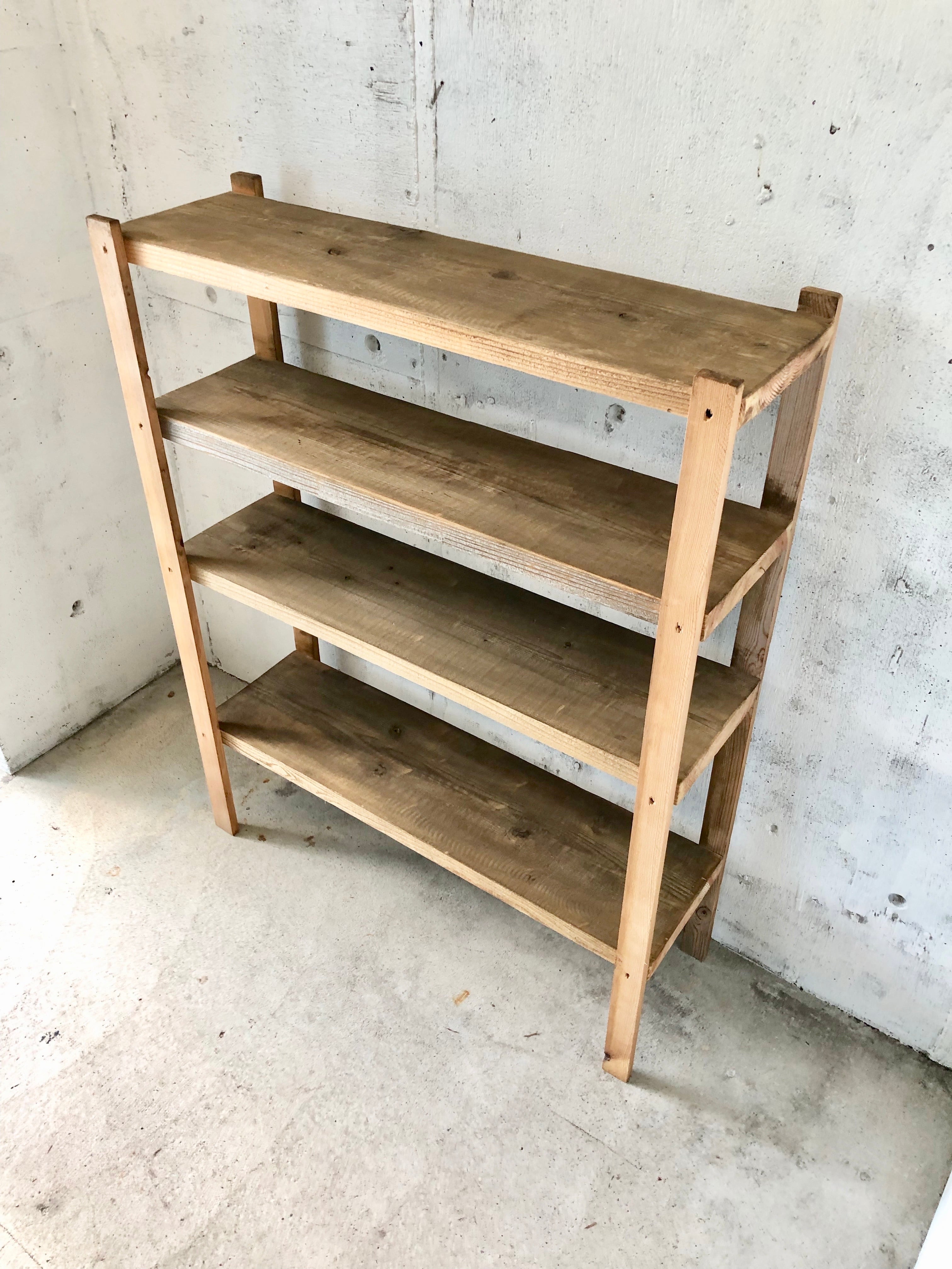 古い木製のオープンラックになります.。スレやハゲ、割れ、欠け、隙間、反り、当たりキズ、落としきれない汚れなどがあります。少しのがたつきはありますが、全体的に状態も良いのでまだまだ実用的に活躍してくれます。