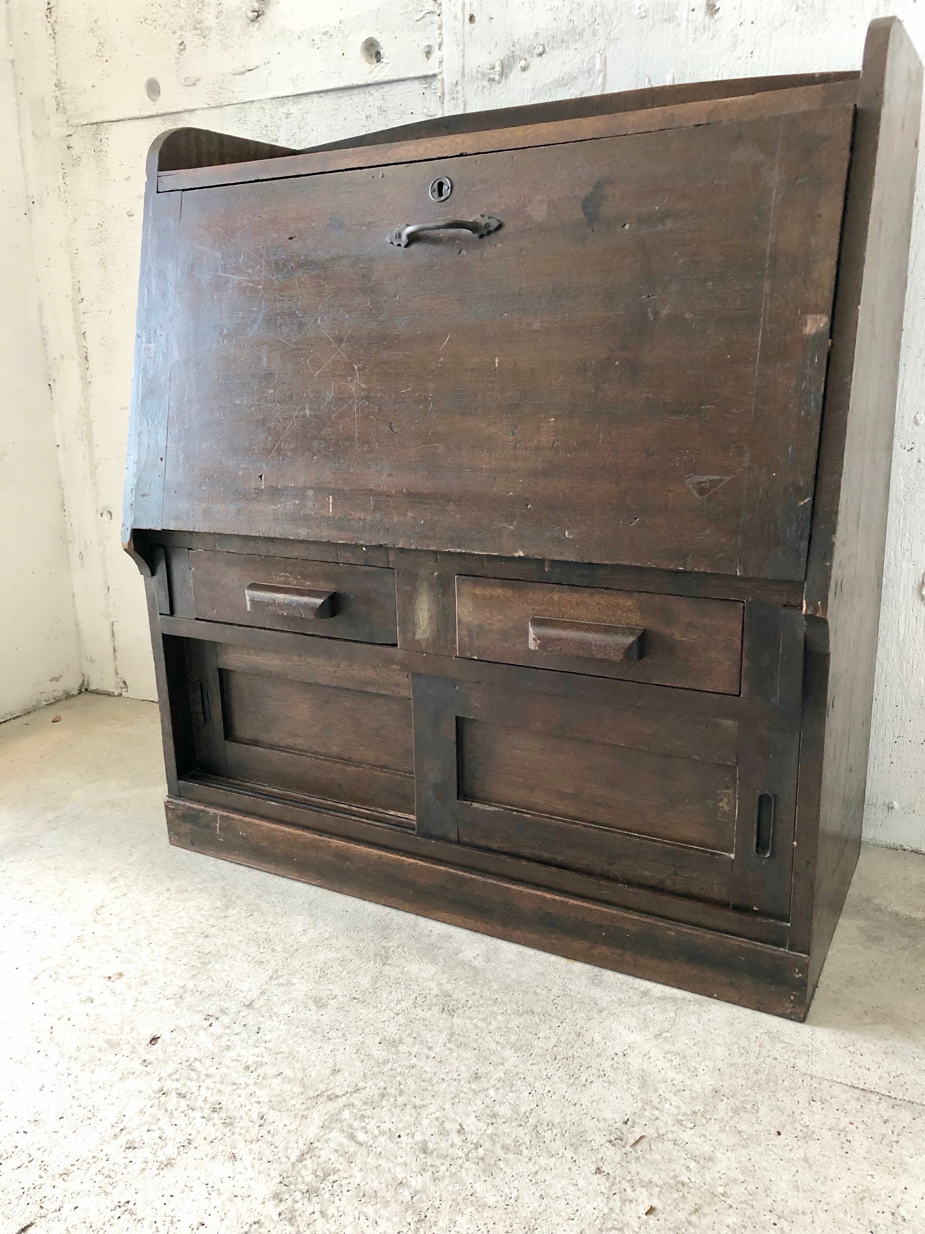 古いキャビネットになります。スレや剥げ、当たりキズ、割れ、欠け、サビ、落としきれない汚れなどがあります。扉、引戸、引出しの開閉も比較的スムーズに行えます。全体的に状態は良いのでまだまだ実用的にお使いいただけます。