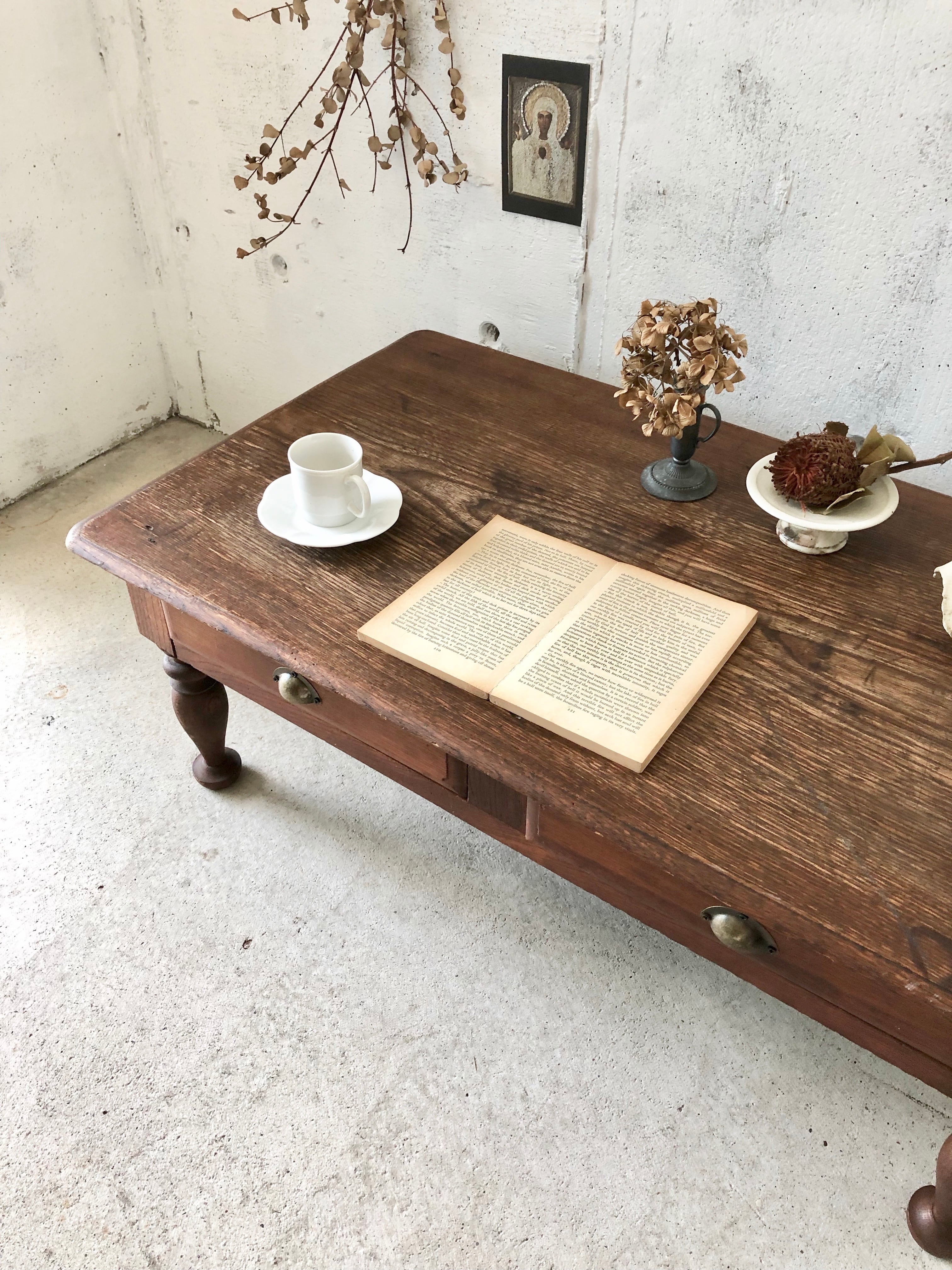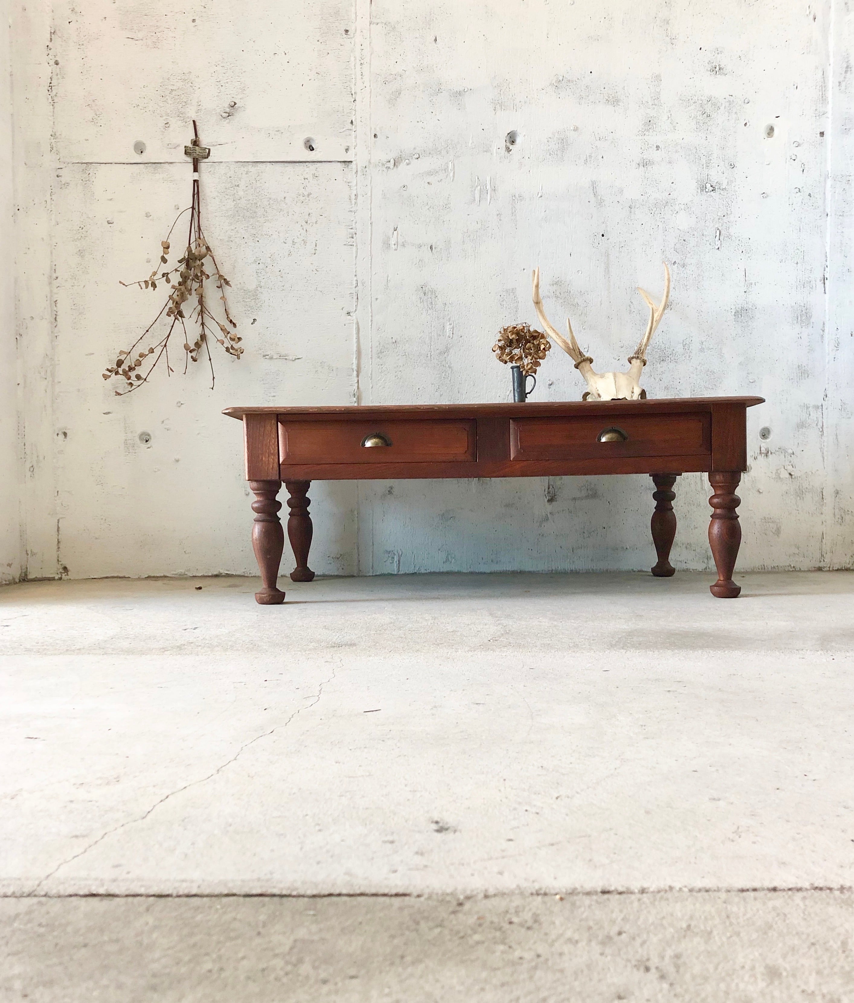 経年変化の良い木肌と取手、ろくろ脚が感じ良いローテーブル。少しのがたつきはありますが、状態は良好です。お気に入りの小物や植物などをお部屋で飾る台としてや、実用使いで作業テーブルとしてや、お子さんの勉強机としても素敵です。