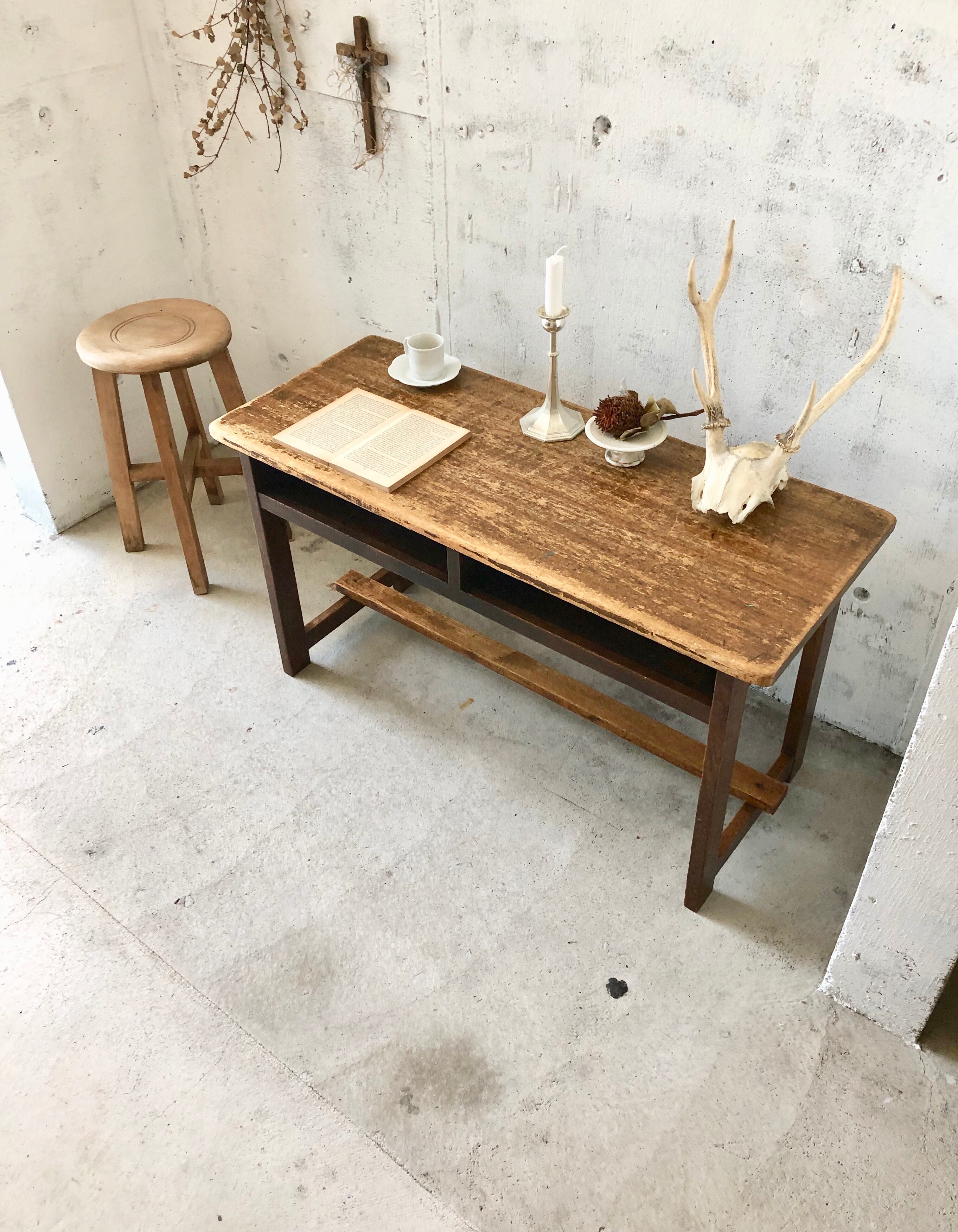 経年変化の味のある木肌が雰囲気の良い木製デスク。天板下には、収納ができるので使い勝手も良いです。少し高さが低めなのでソファテーブルとしてやお子さんの勉強机として、お気に入りの小物や植物などを飾る台としても素敵にお使いいただけそうです。