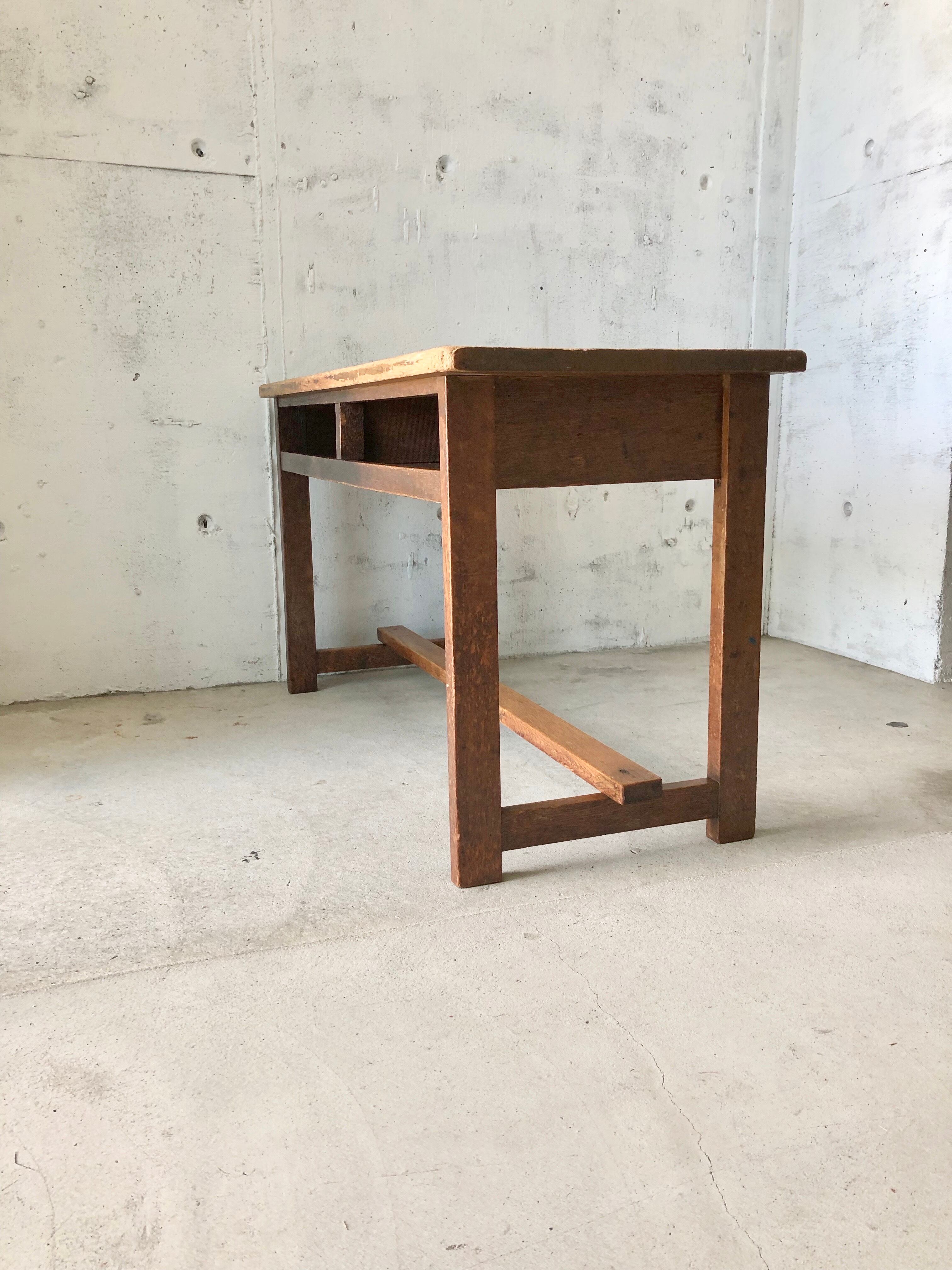 古い木製デスクになります。スレやハゲ、欠け、反り、割れ、隙間、当たりキズ、落としきれない汚れなどがあります。少しのがたつきはありますが、収納中は綺麗で全体的に状態も良いのでまだまだ実用的に活躍してくれます。
