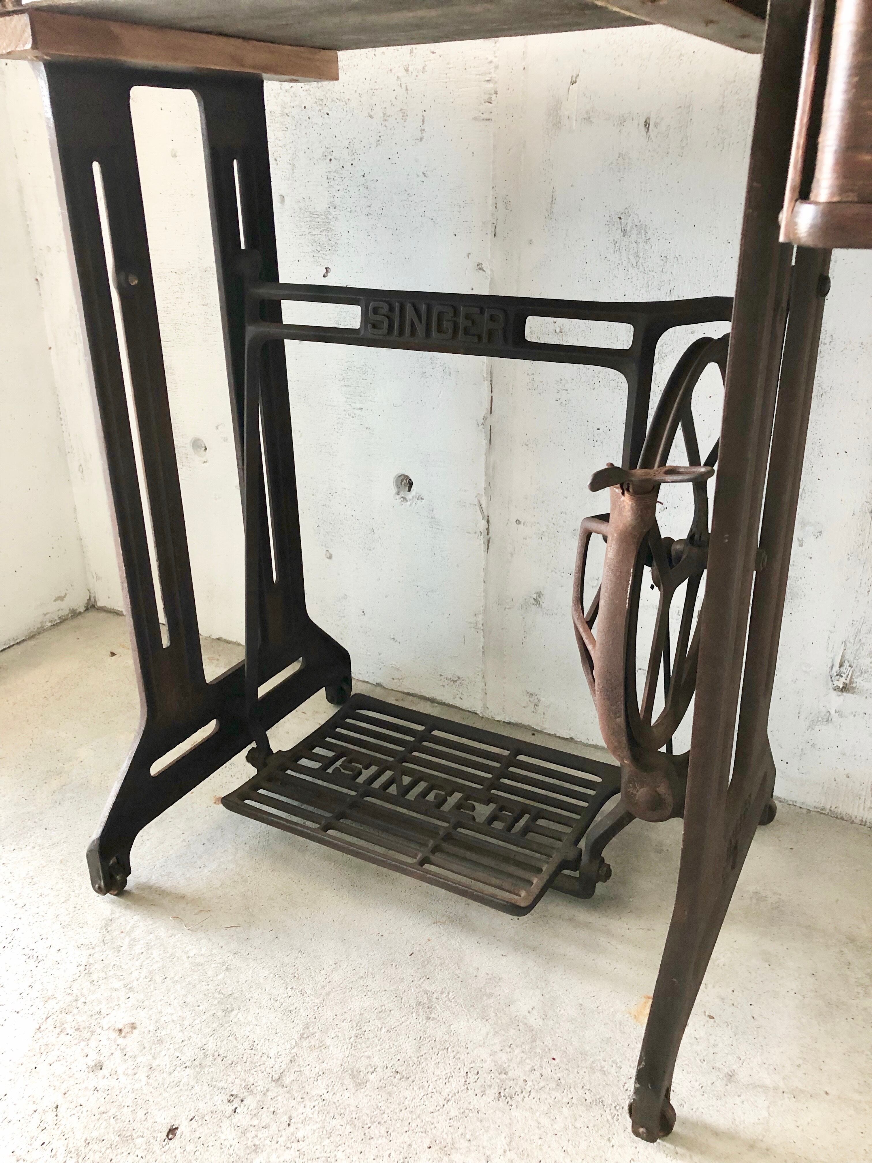 雰囲気の良い古材板と古いシンガーミシン脚が良く馴染んだテーブル。少しのがたつきはありますが、状態は良いです。天板下には引出しが付いているので、使い勝手も良いです。お部屋でお気に入りの植物や小物を飾るディスプレイ台としてや、日常の作業をするのに程よいサイズ感がオススメです。味のあるテーブルひとつプラスするだけで雰囲気あるお部屋作りが叶いそうです。