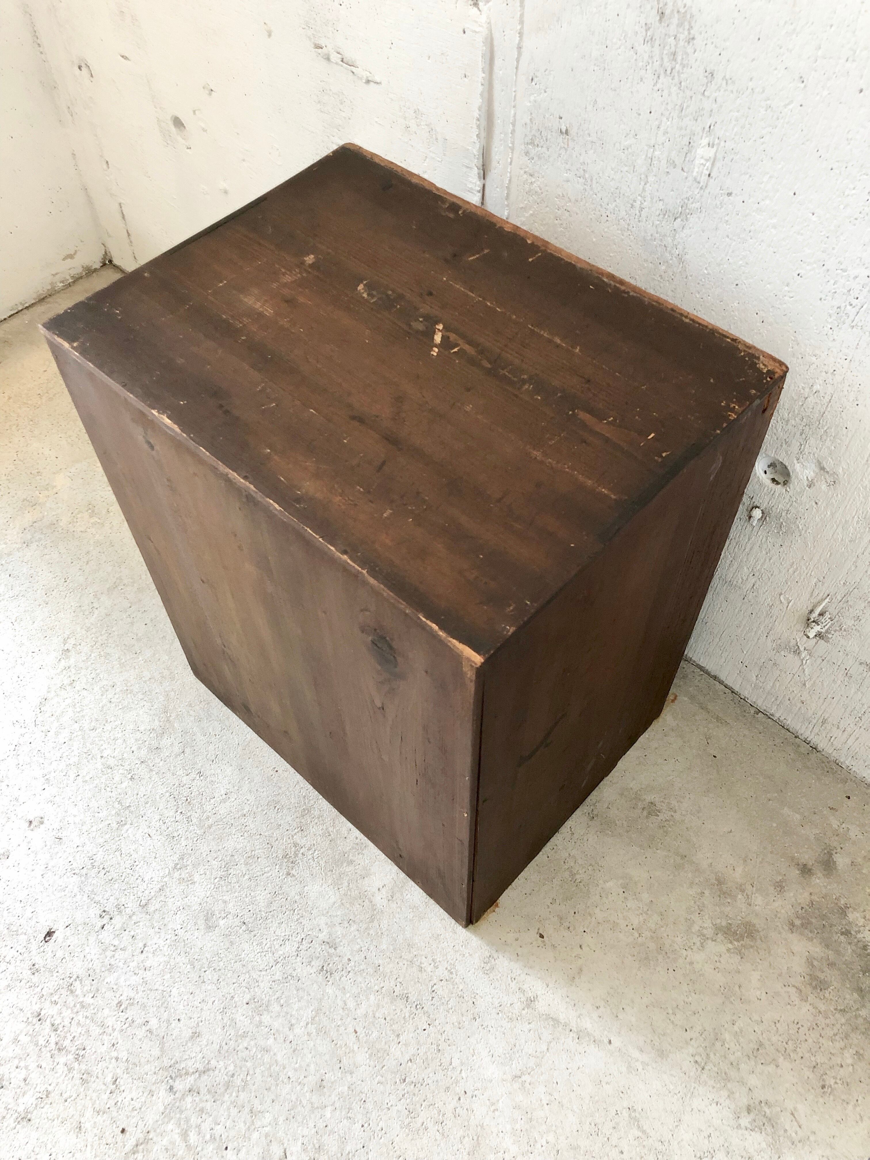 古い収納棚になりますので、スレや剥げ、当たりキズ、割れ、反り、欠け、落としきれない汚れなどがあります。引出し中は少し汚れがありますが、開閉はスムーズに行え、日常気軽にお使いいただけます。全体的に状態も良いのでまだまだ実用的に活躍してくれます。