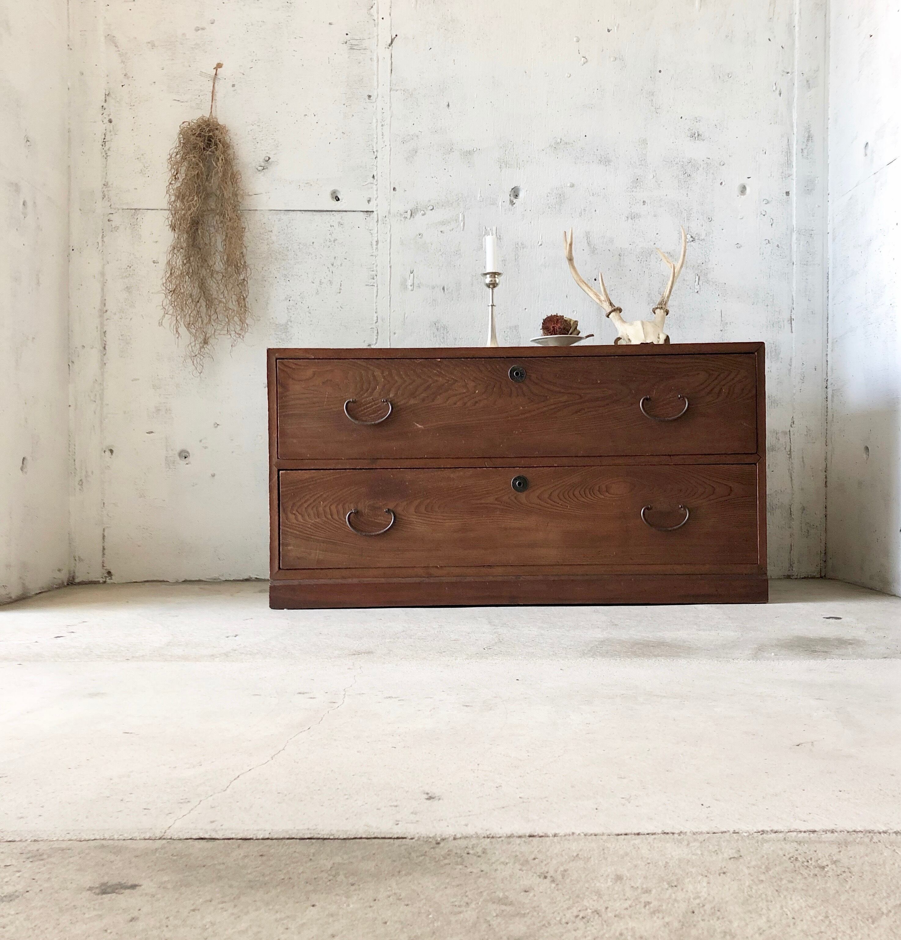 経年変化の雰囲気のある木肌、味のある取手が感じ良い収納棚。大きめな引出し収納が2杯あり、収納力も十分です。経年による傷などもありますが、引出しの開閉は比較的スムーズに行え、使用上問題なくお使いいただけます。リビングや趣味部屋、衣装部屋で小物、洋服などの収納棚としてや、テレビ台としても素敵にお使い頂けそうです。