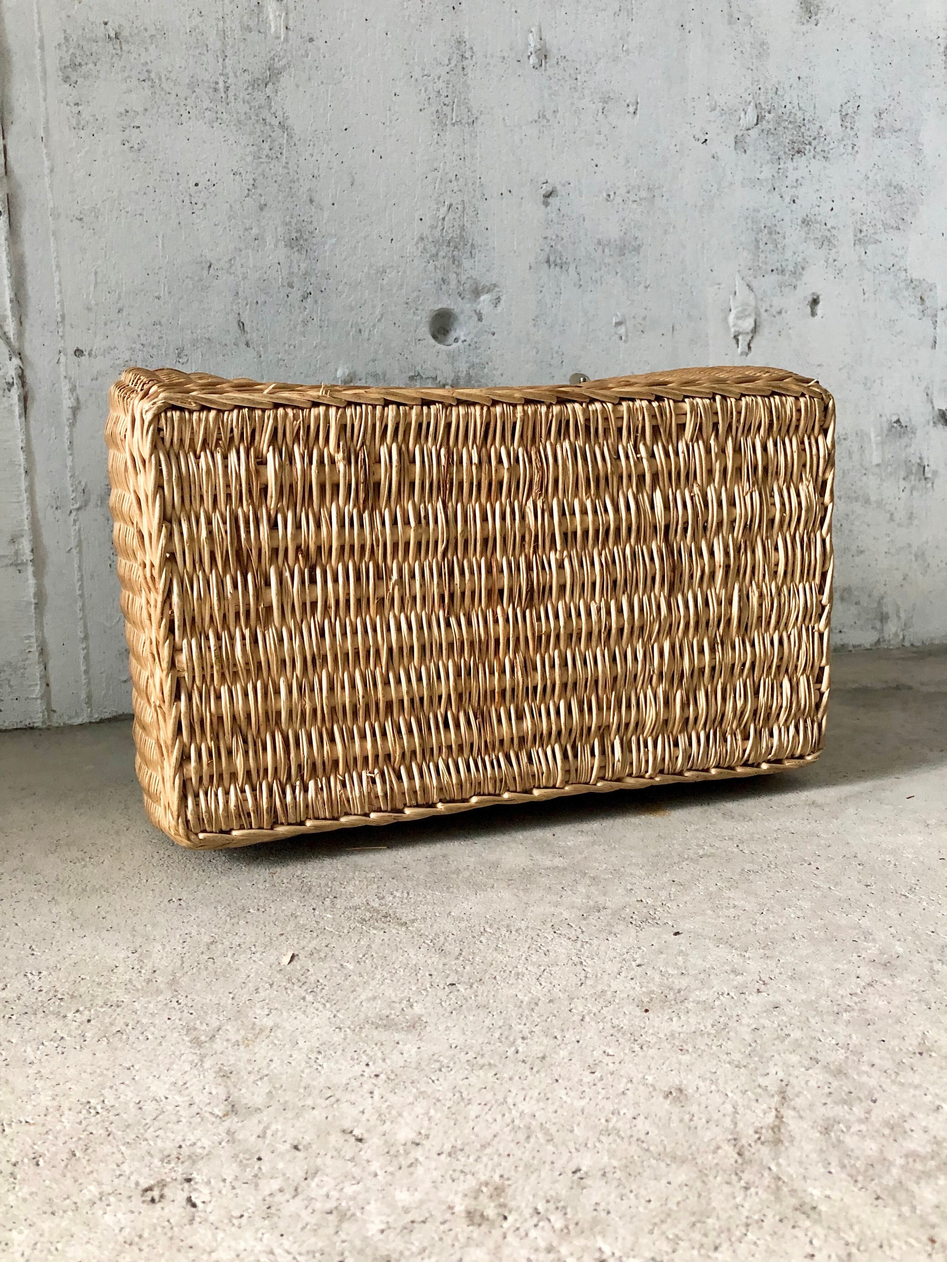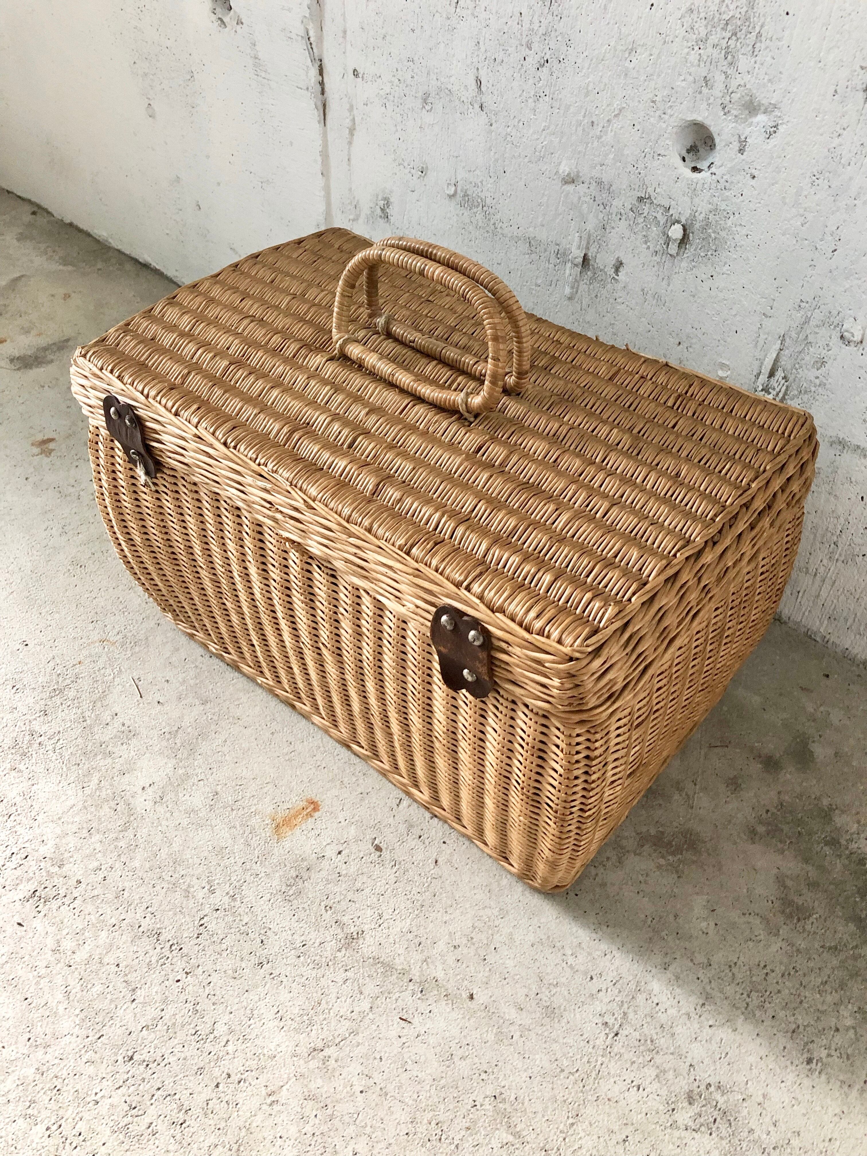 使い込まれた良い雰囲気、味のある金具が魅力的なピクニックバスケット。蓋の開閉もスムーズに行え、状態は良いです。休日にサンドイッチなどを入れてピクニックに出掛けたり、お部屋で小物入れ、お子さんのオモチャ入れなどとしても感じ良くお使い頂けそうです。