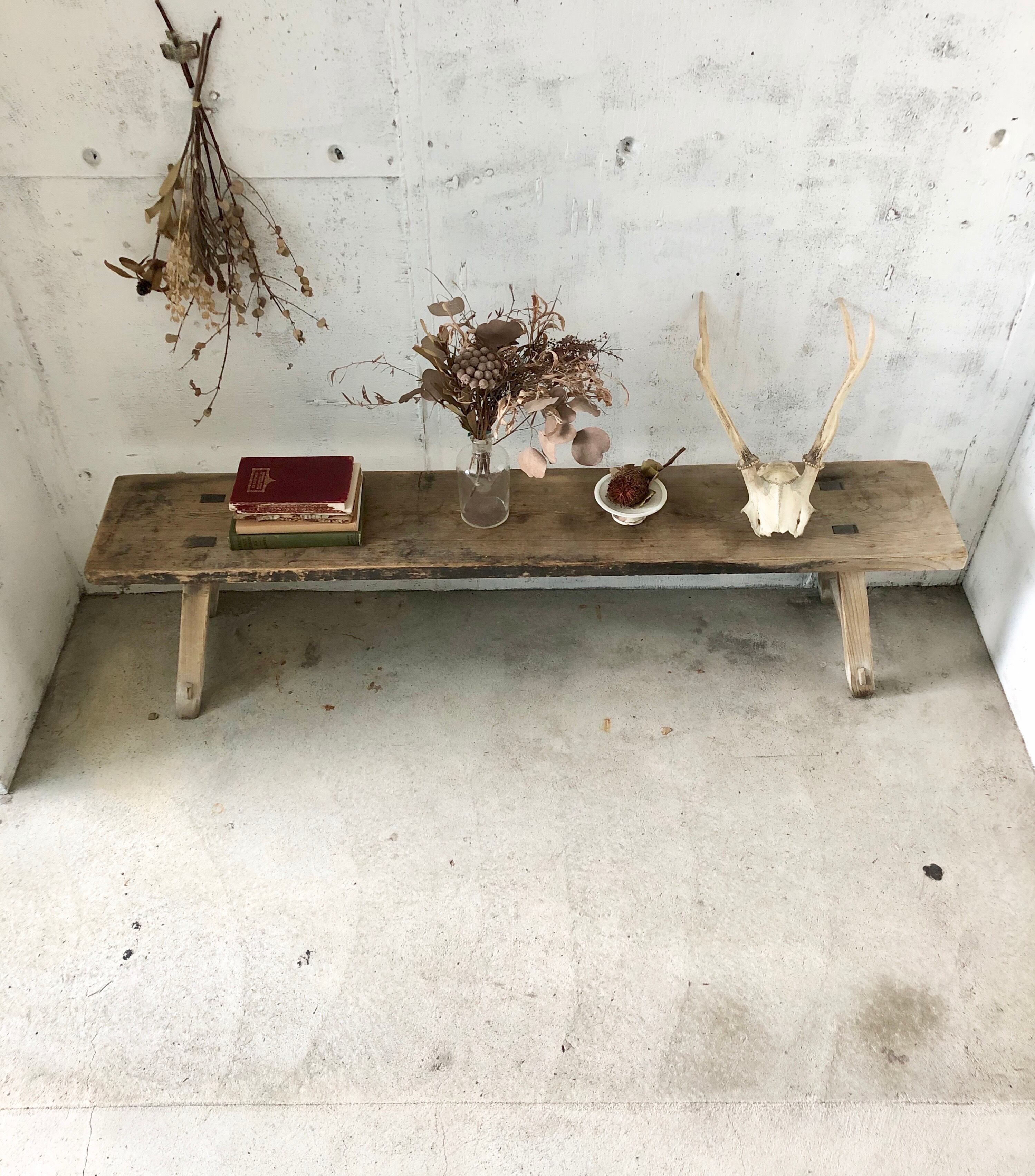 経年変化の雰囲気良い木肌、すらっとした横長い姿が感じ良い木製ベンチ。食卓テーブルの椅子としてや、庭先、玄関先に置いて腰掛け椅子にしてみても素敵です。実用使い以外にも、お気に入りの植物や小物などを飾るディスプレイ台としても活躍してくれそうです。ショップさんの店舗什器としてもオススメの品です。