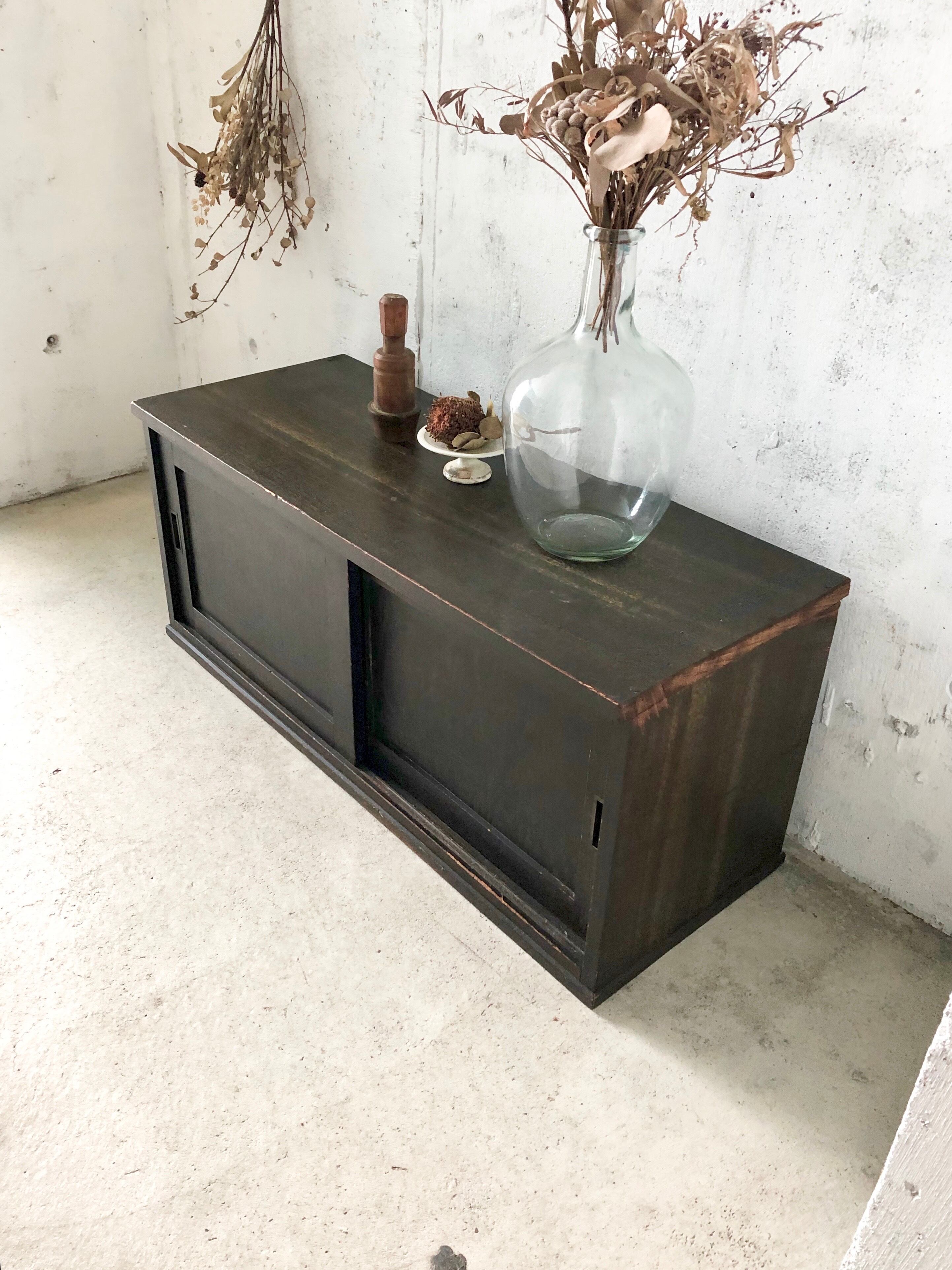 経年変化の雰囲気の良い木肌、落ち着きのある佇まいが素敵な収納棚。収納力も十分で、引戸の開閉は比較的スムーズに行え状態は良いです。リビングや趣味部屋で小物や本、紙物の収納としてや、テレビボードとして使ってみても良いサイズ感です。