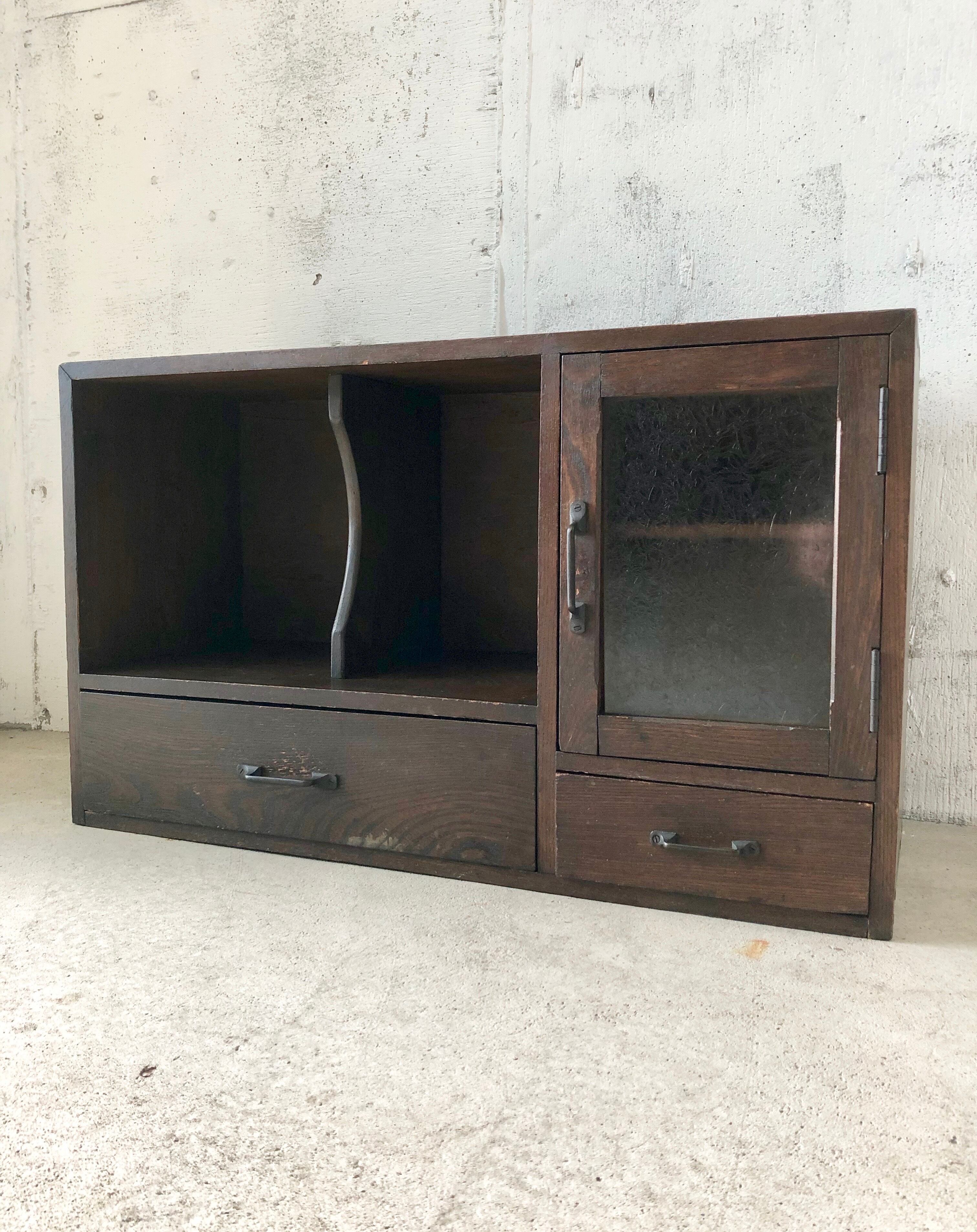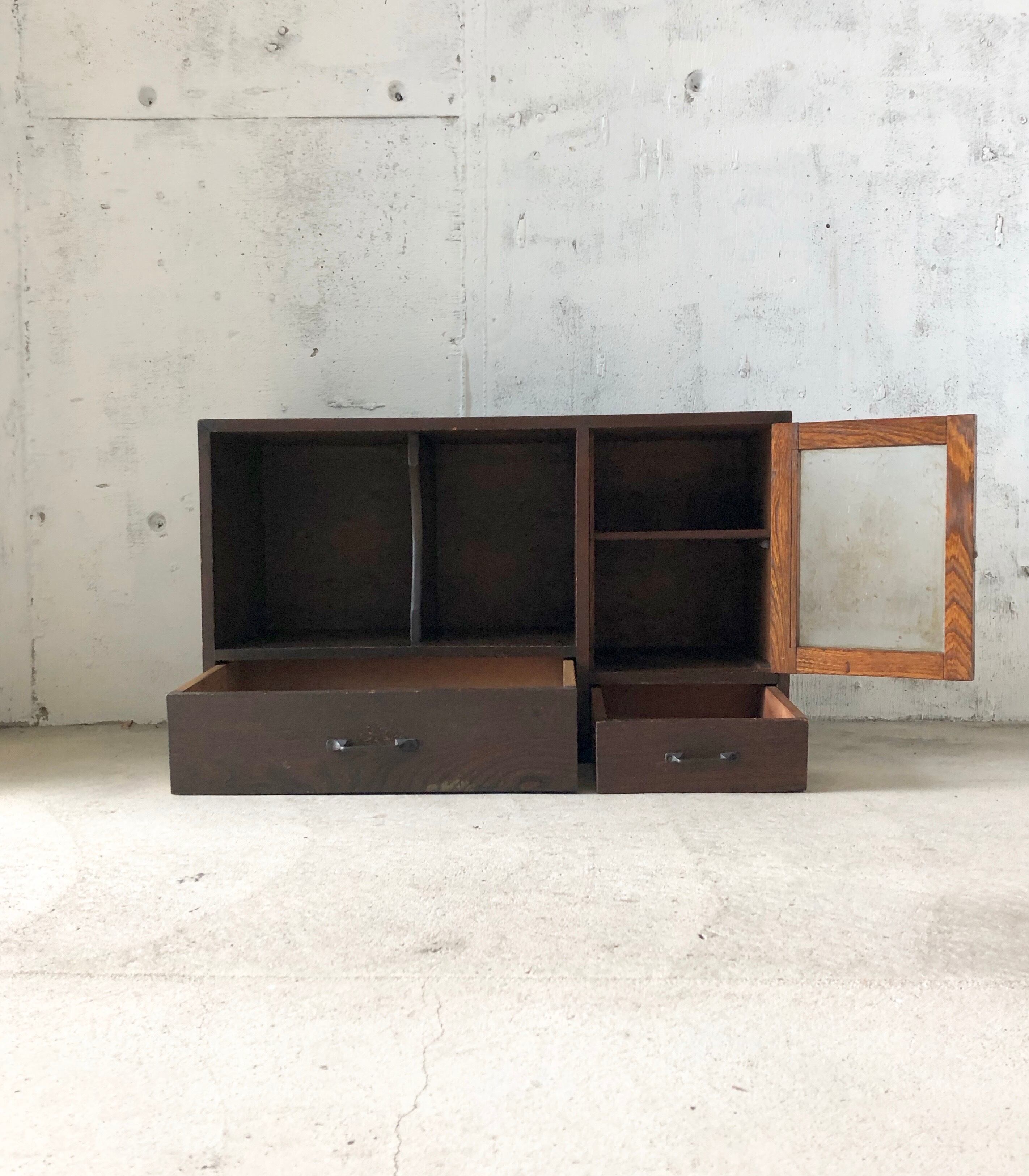 経年変化の深みのある木肌、上品な佇まいが感じ良い収納棚。引出し、ガラス扉の開閉は比較的スムーズに行え日常気軽にお使いいただけます。収納力も十分で、リビングや作業部屋、キッチンなどのテーブル脇、棚横に置く収納棚としても素敵にお使い頂けそうです。