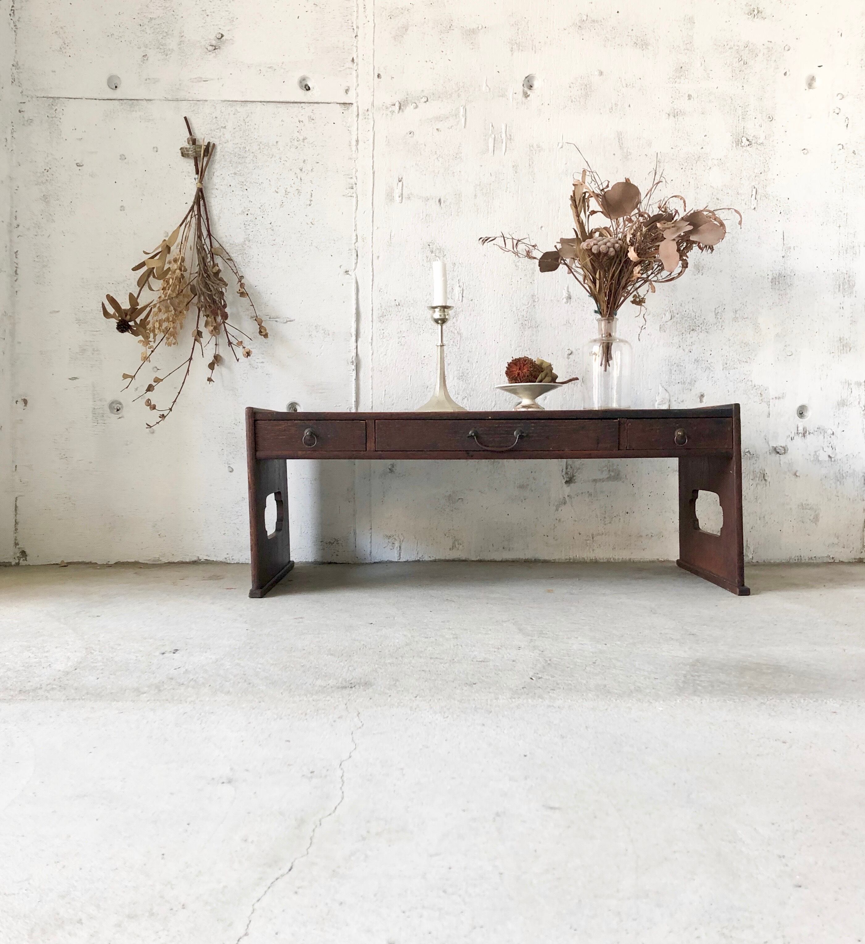 経年変化の深みのある良い木肌、雰囲気のある取手が感じ良いローテーブル。少しのがたつきはありますが、状態は良好です。お気に入りの小物や植物などをお部屋で飾ってみたり、実用使いで作業テーブルとしてや、お子さんの勉強机としても素敵です。