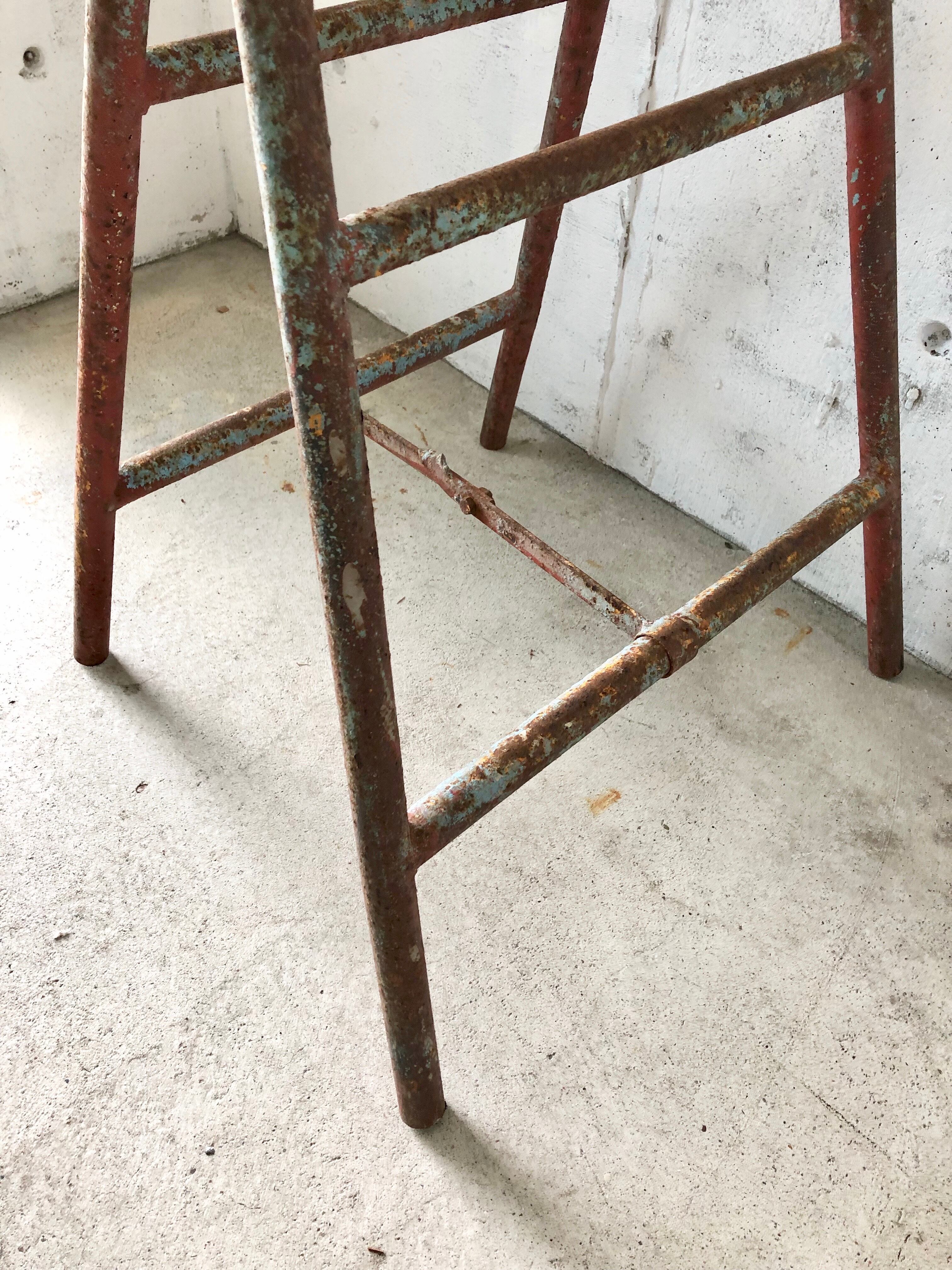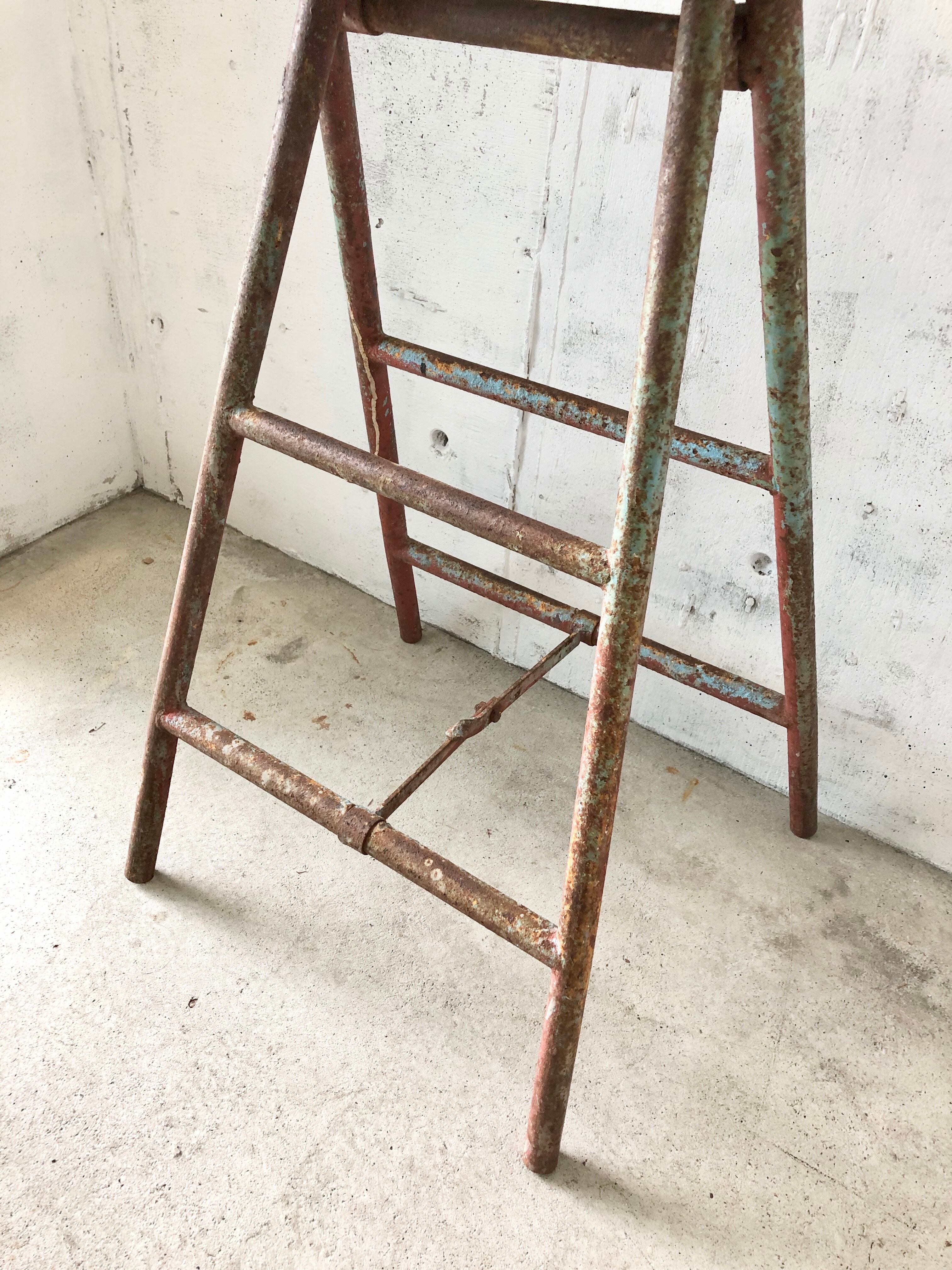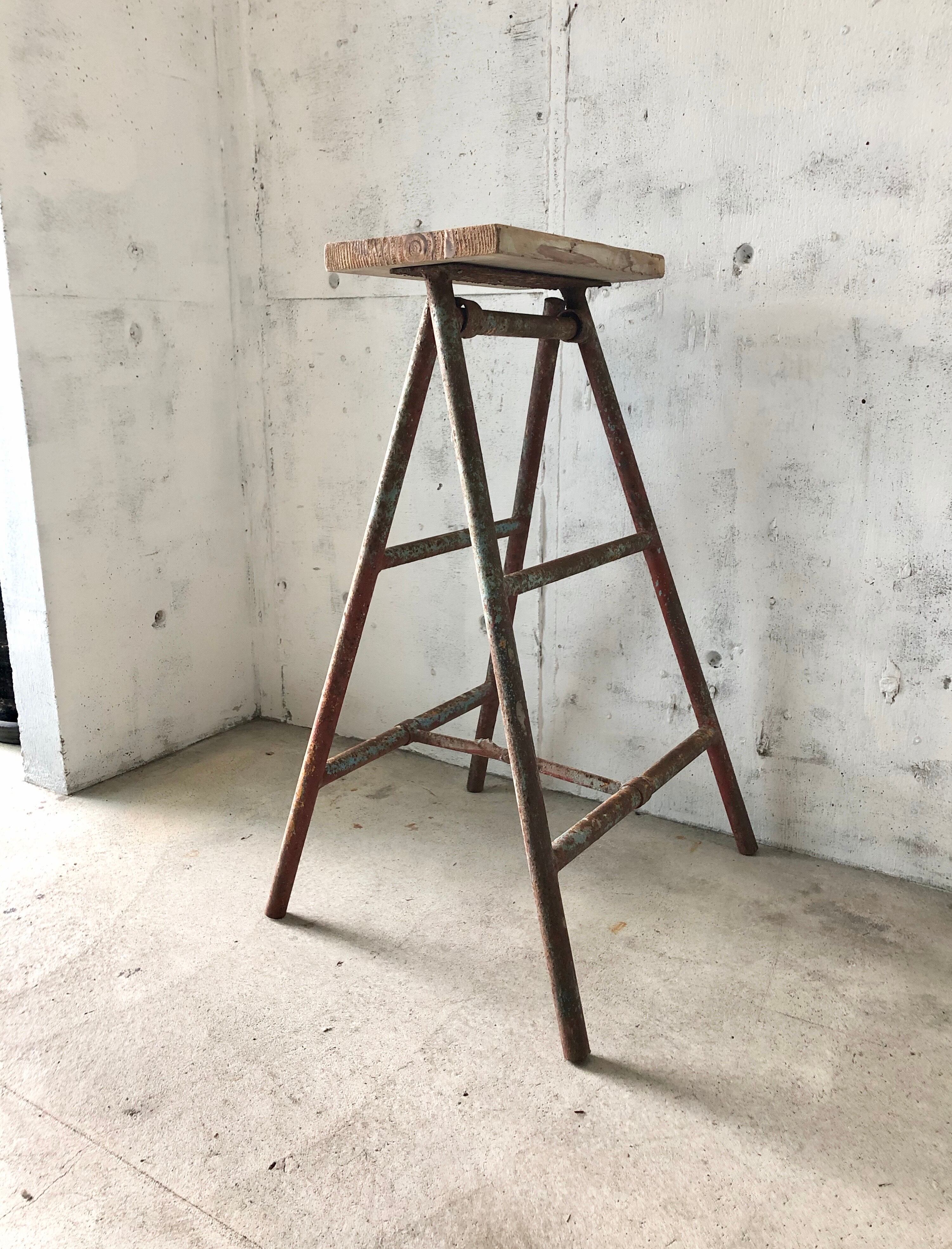 古い鉄脚と古材板の飾り台になります。スレや剥げ、割れ、当たりキズ、サビ、落としきれない汚れなどがあります。古い鉄脚ですので、少しのがたつきなどはありますが、折りたたみ時はスムーズに行え使用上問題なくお使いいただけます。全体的に状態も良いのでまだまだ実用的に活躍してくれます。