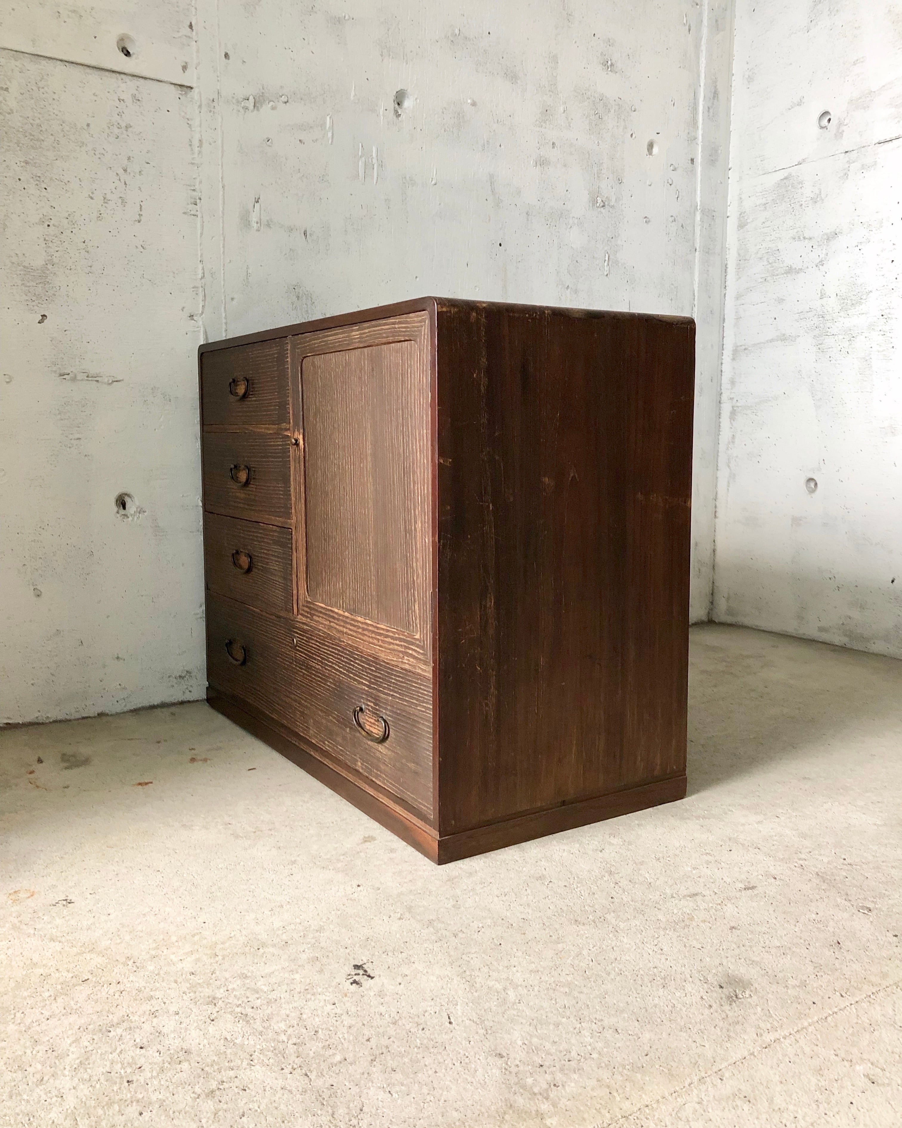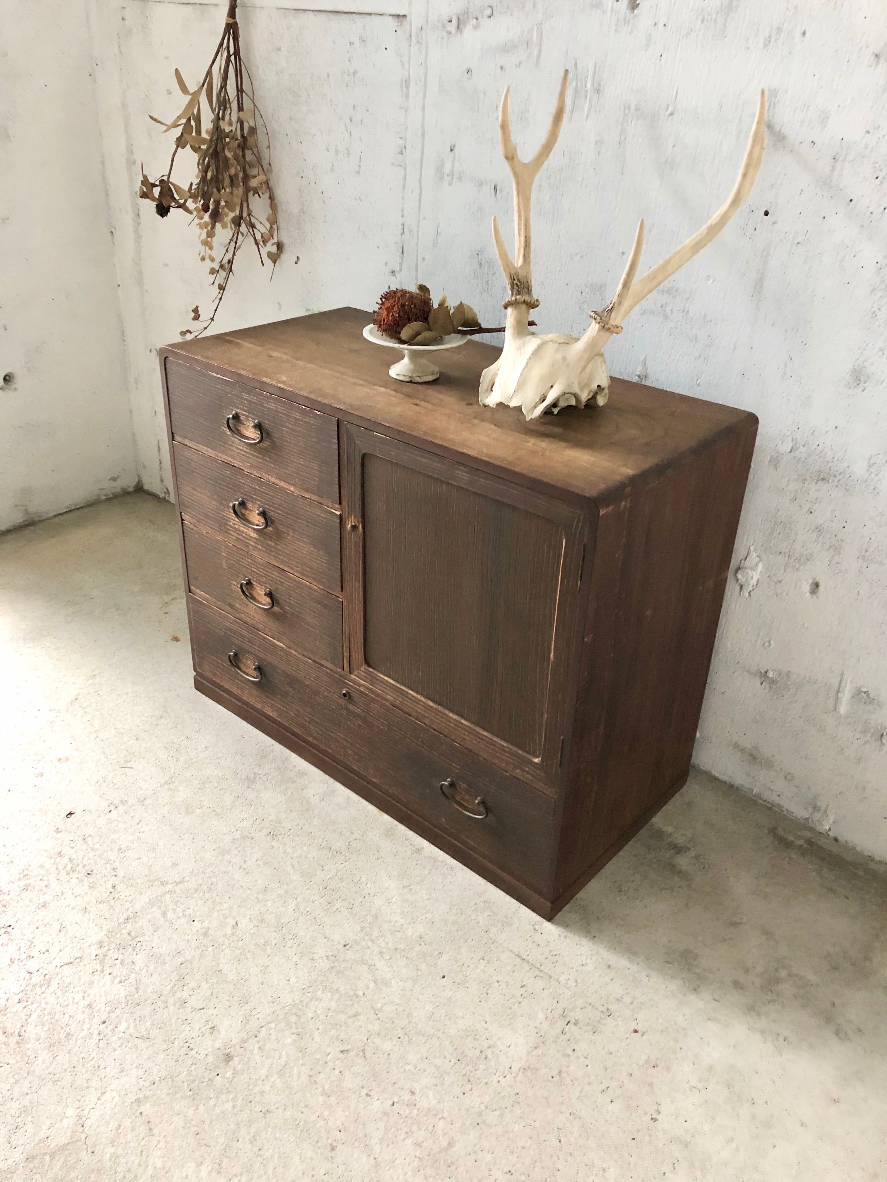 古い収納棚になりますので、スレや剥げ、当たりキズ、割れ、欠け、落としきれない汚れなどがあります。引出し中は少し汚れがありますが、開閉もスムーズに行えます。全体的にしっかりとしていて状態も良いのでまだまだ実用的に活躍してくれます。