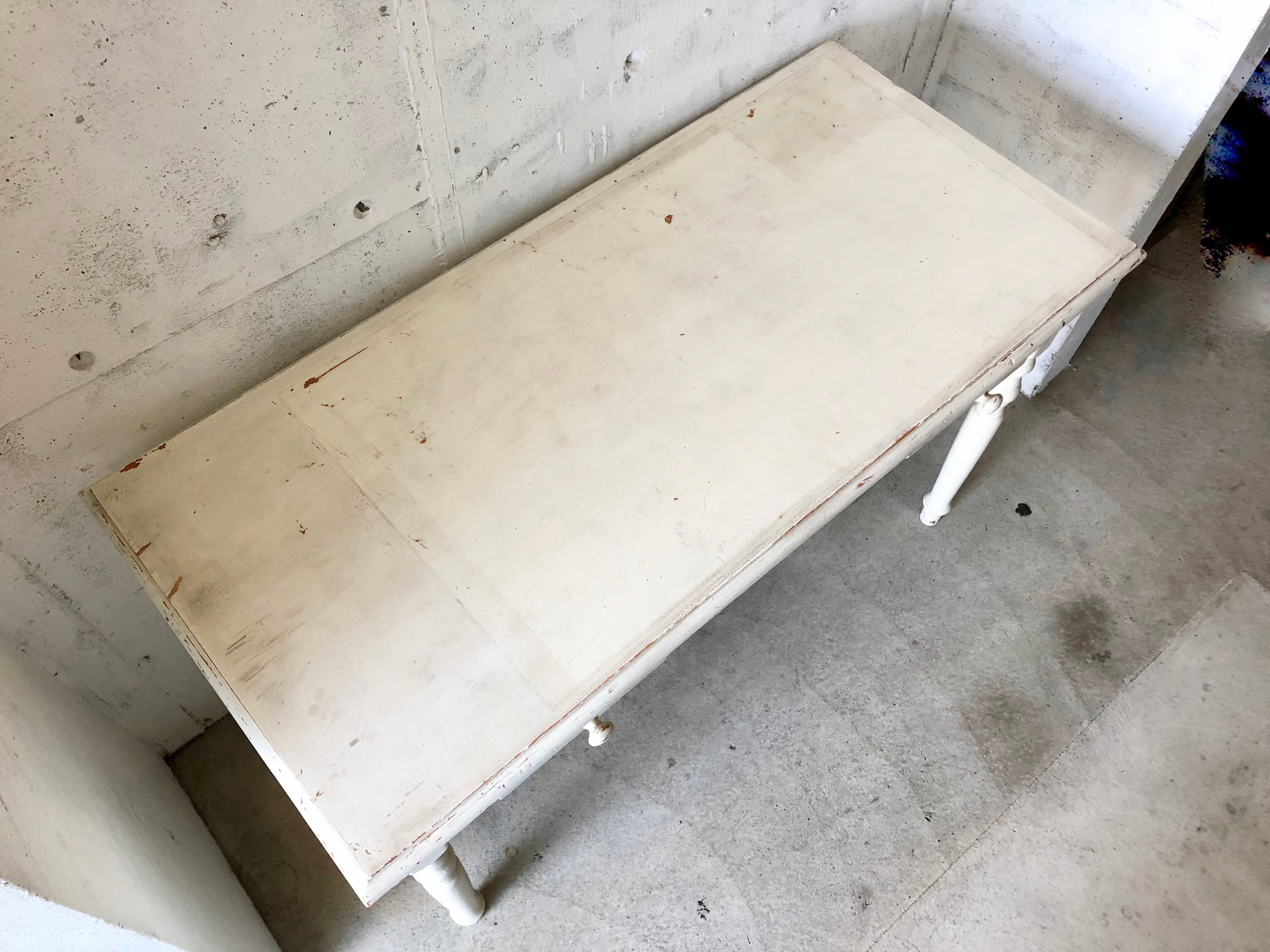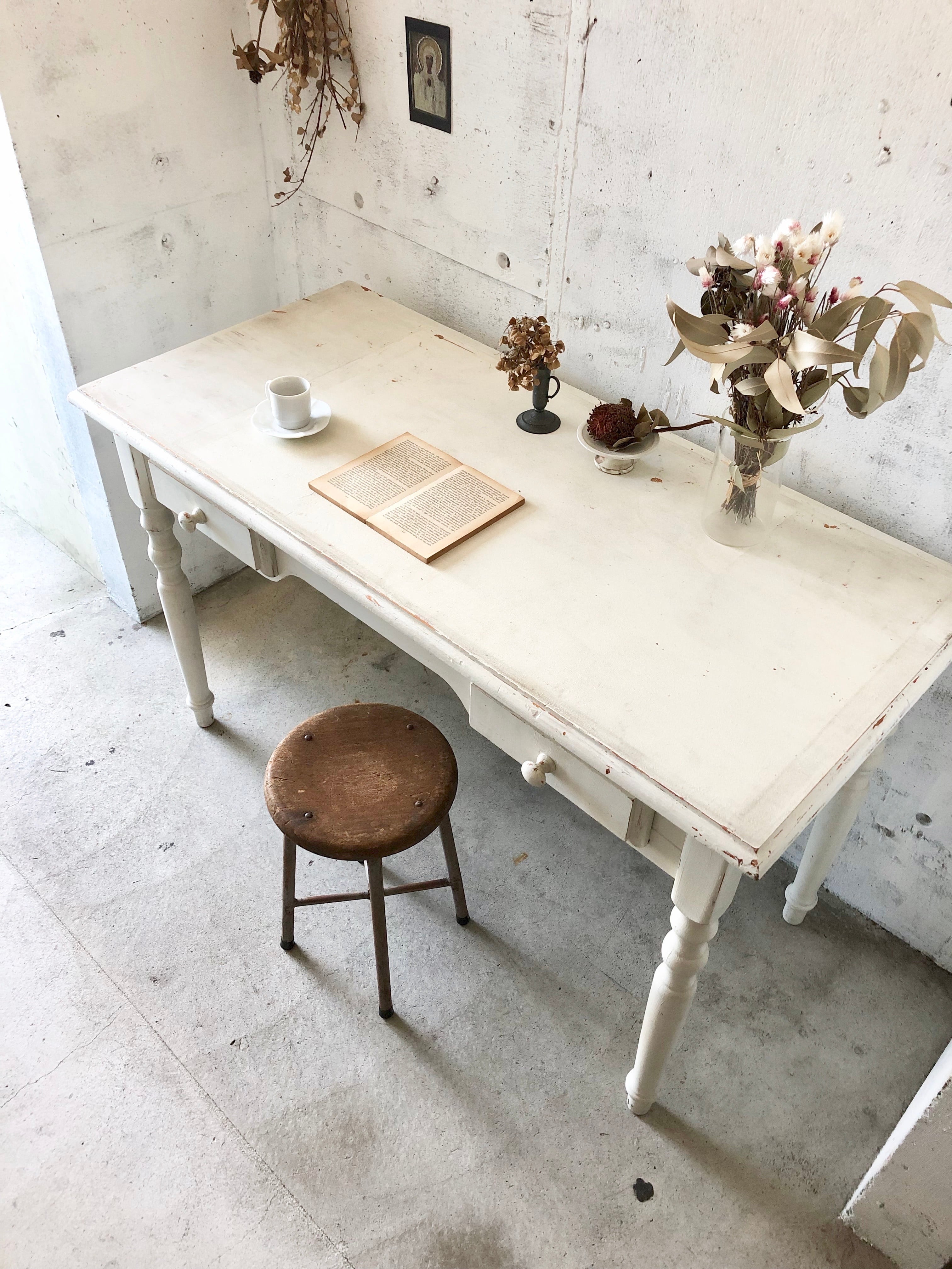 経年変化の程良く禿げた白色の木肌、シャビーシックな雰囲気が感じ良い木製デスク。特にぐらつきもなく、しっかりとして重量感もあります。ダイニングで2人掛けのテーブルとしてや、パソコン作業などをする作業テーブル、お子さんの勉強机としても素敵にお使い頂けそうです。