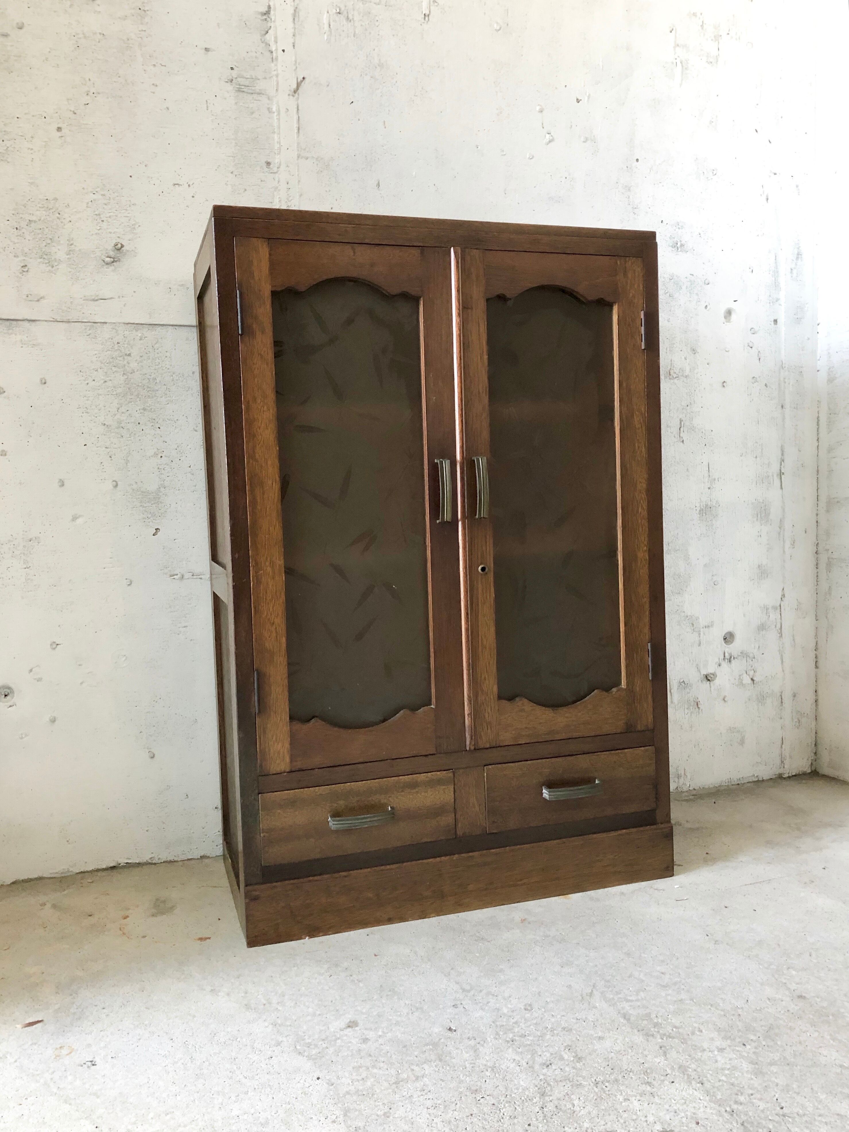 シンプルながら経年変化による深みは空間に落ち着きを与えてくれるキャビネット。ガラス扉の収納と2杯の引き出しがあり、収納力も十分です。経年による傷などもありますが、ガラス扉、引出しの開閉も比較的スムーズに行え、使用上問題なくお使いいただけます。食器棚や小物、本などの収納棚として、毎日の暮らしの中で手元に置いてお役立てください。